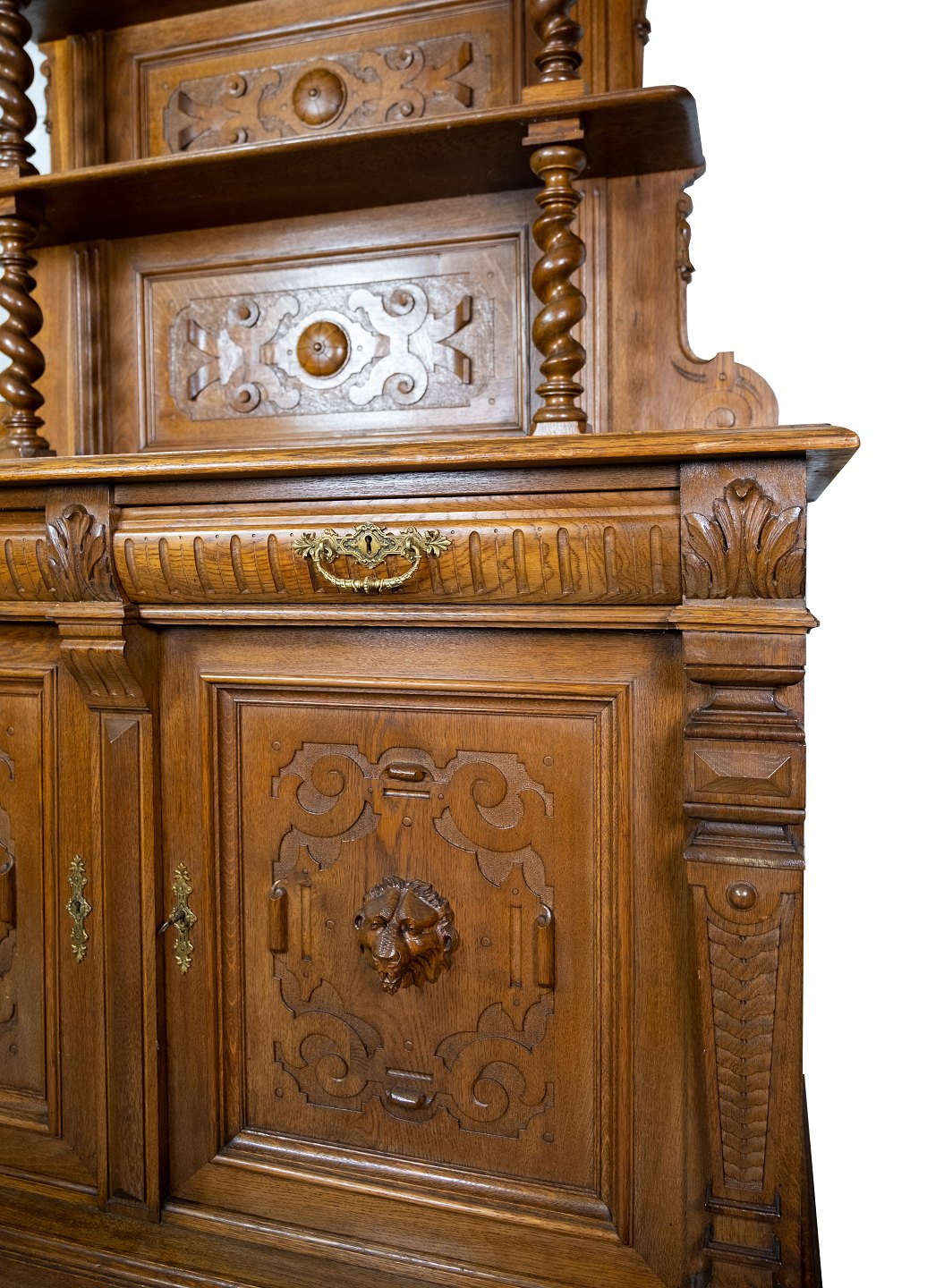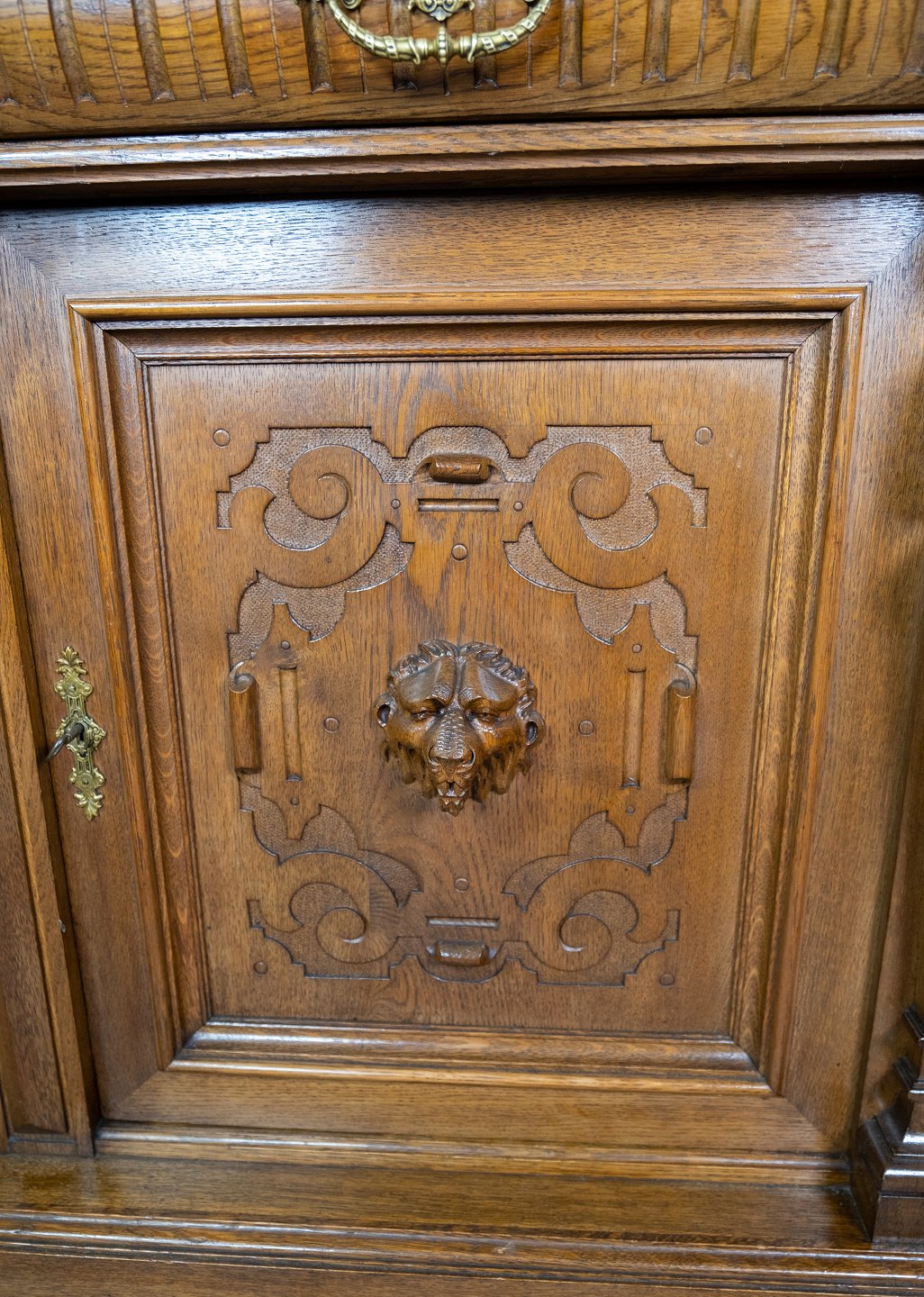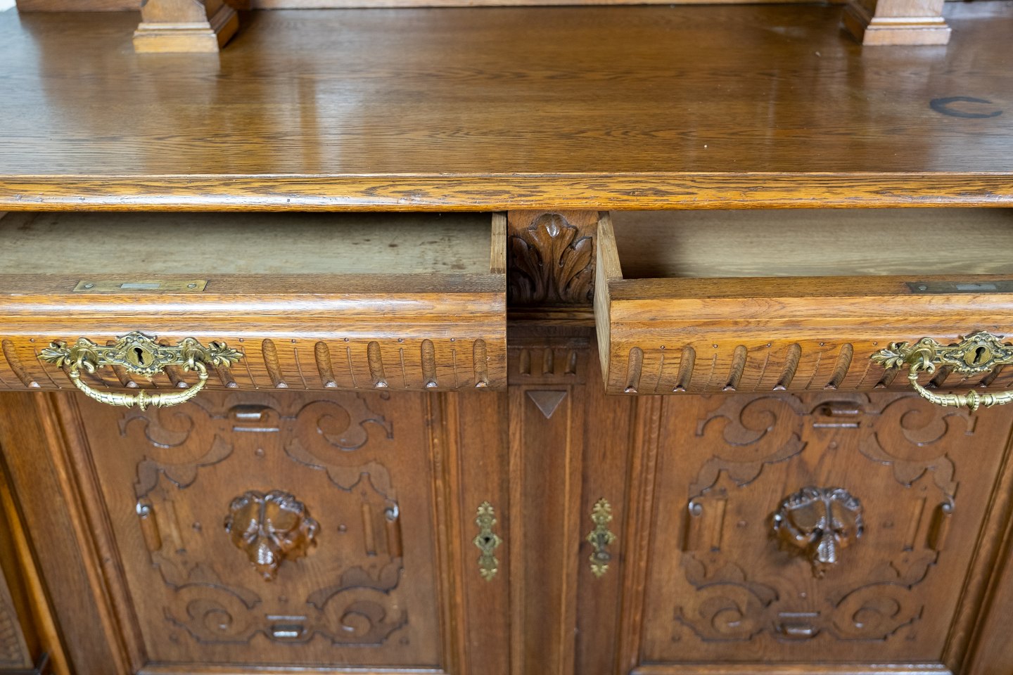 Large cabinet of oak with carvings, in great antique condition from the 1920s.