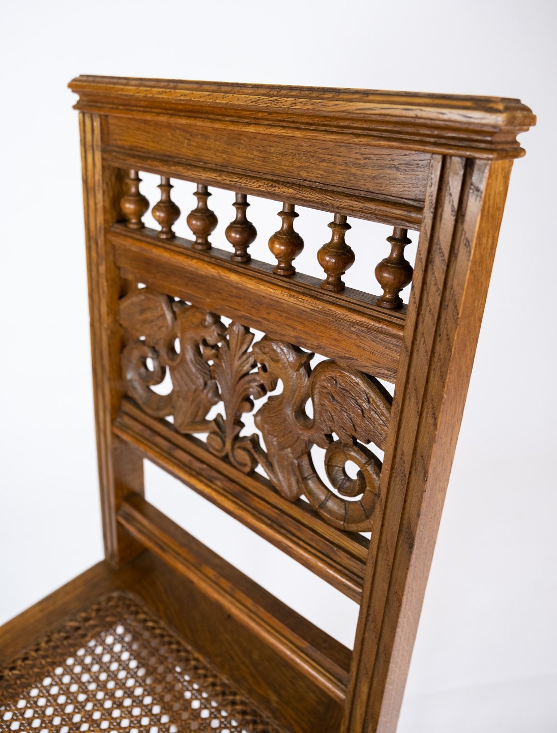 Sæt af spisestuestole af poleret eg dekoreret med udskæringer og rørflet fra 1920erne. Stolene er i flot brugt stand og vi har i alt 12 stk. på lager.
