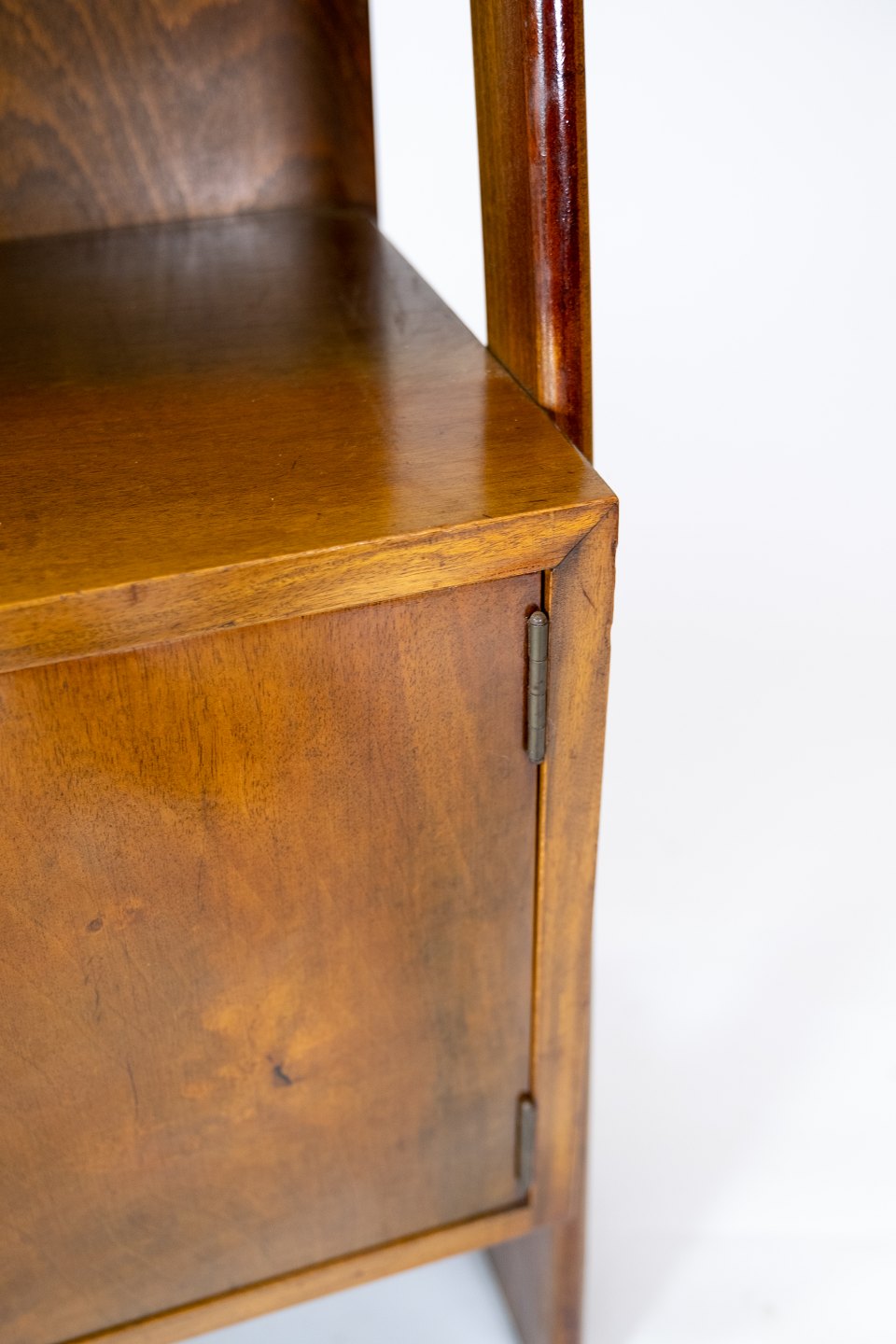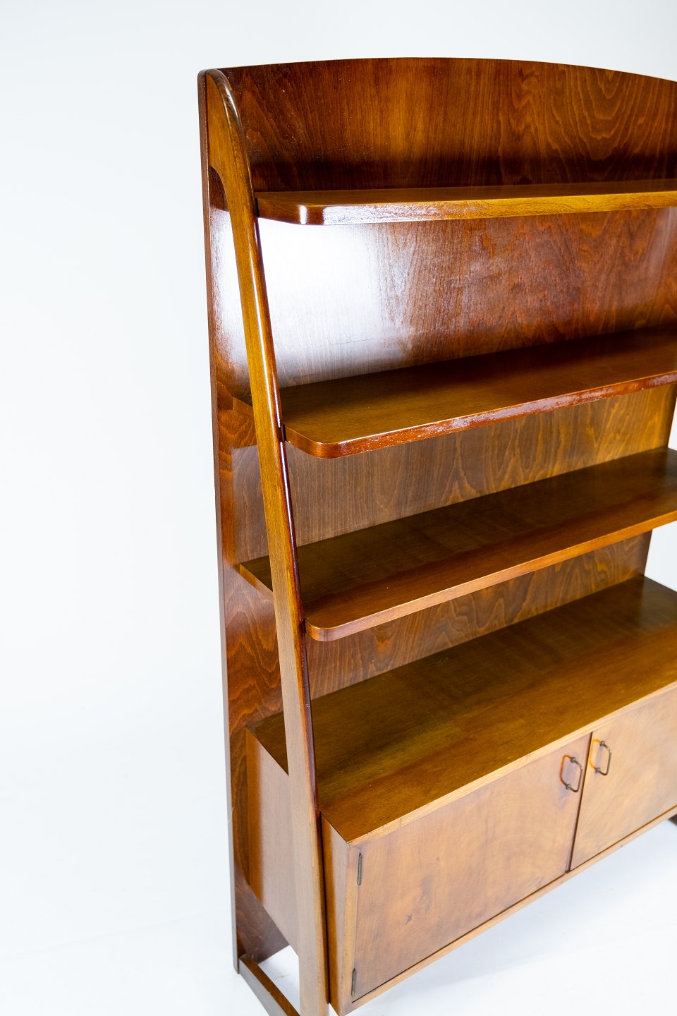 Bogreol med underskab i nøddetræ af dansk design fra 1950erne.Reolen er i flot brugt stand.