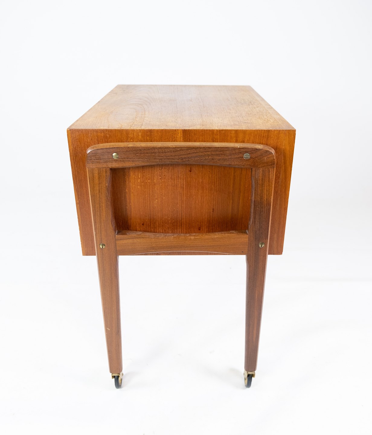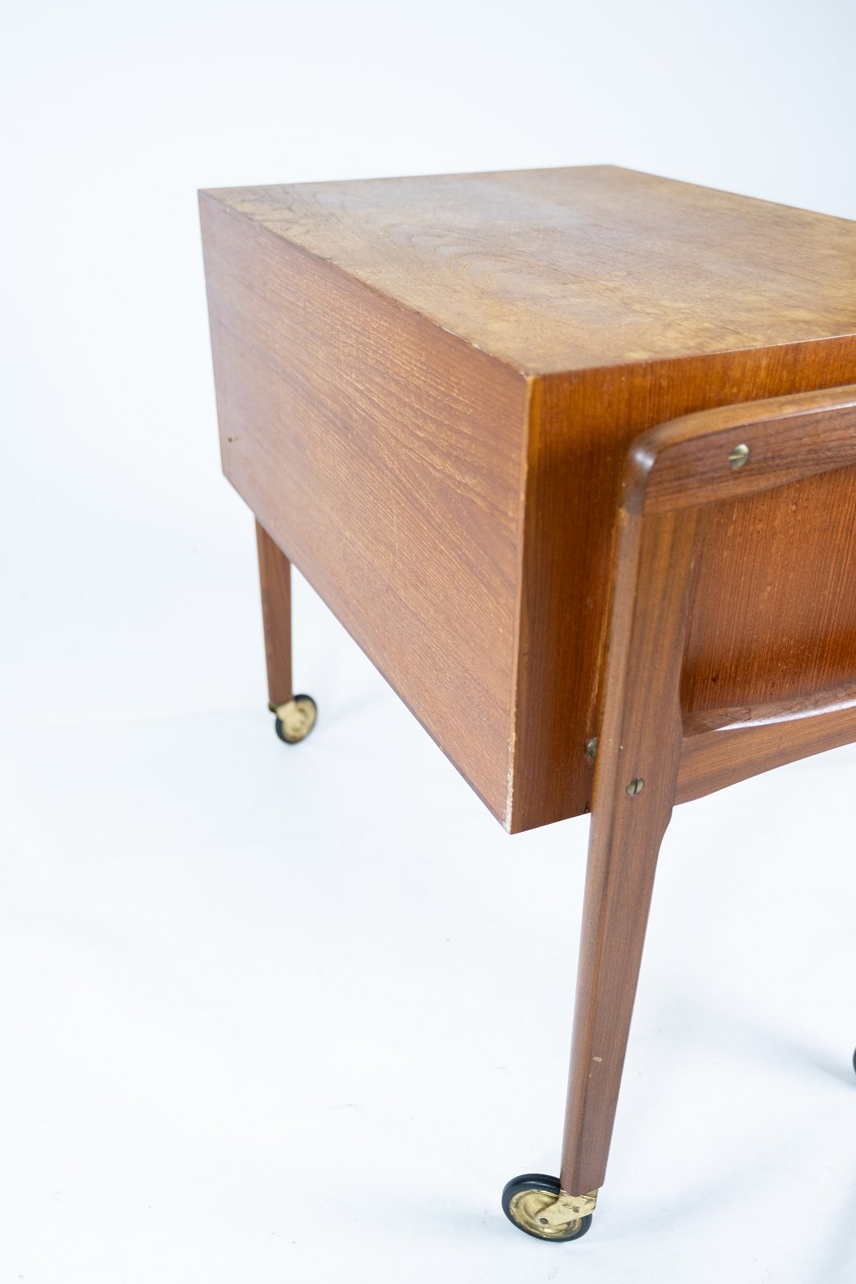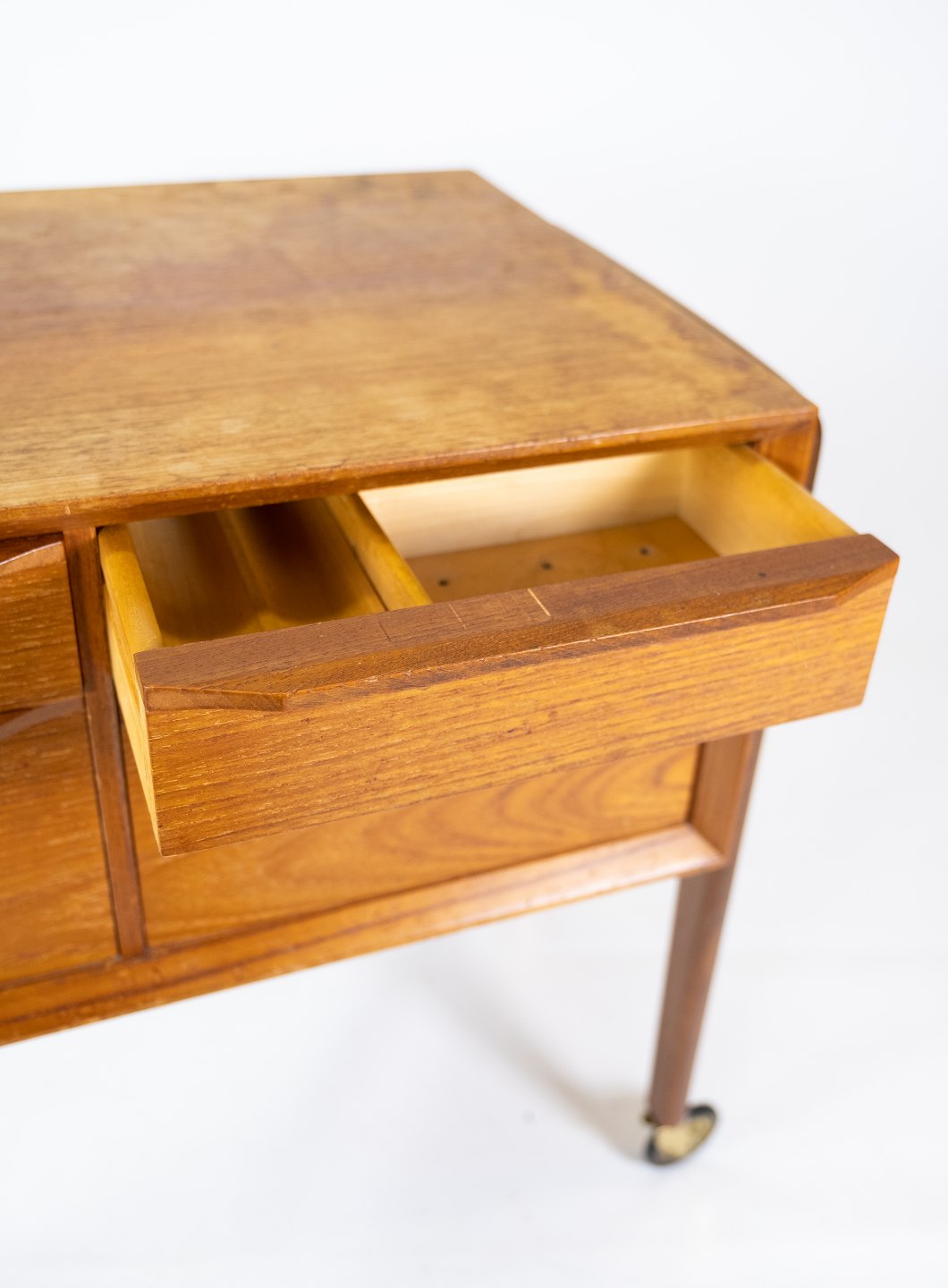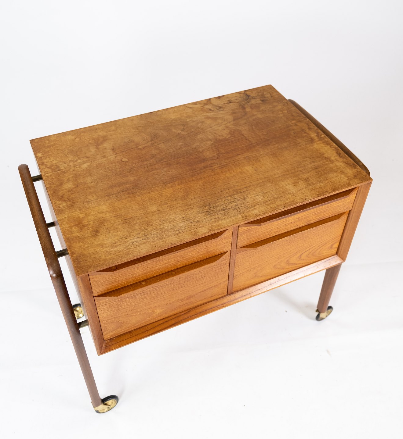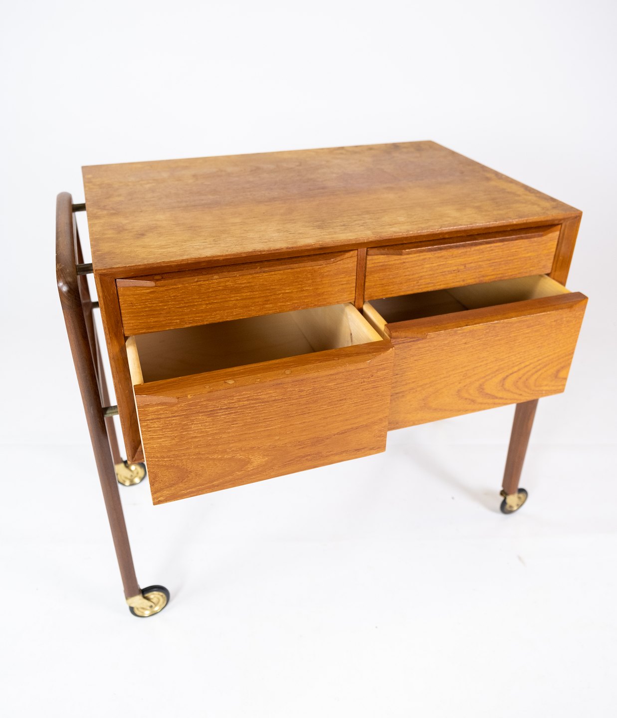 Sidebord med skuffer og på hjul i teak af dansk design fra 1960erne. Bordet er i flot brugt stand.