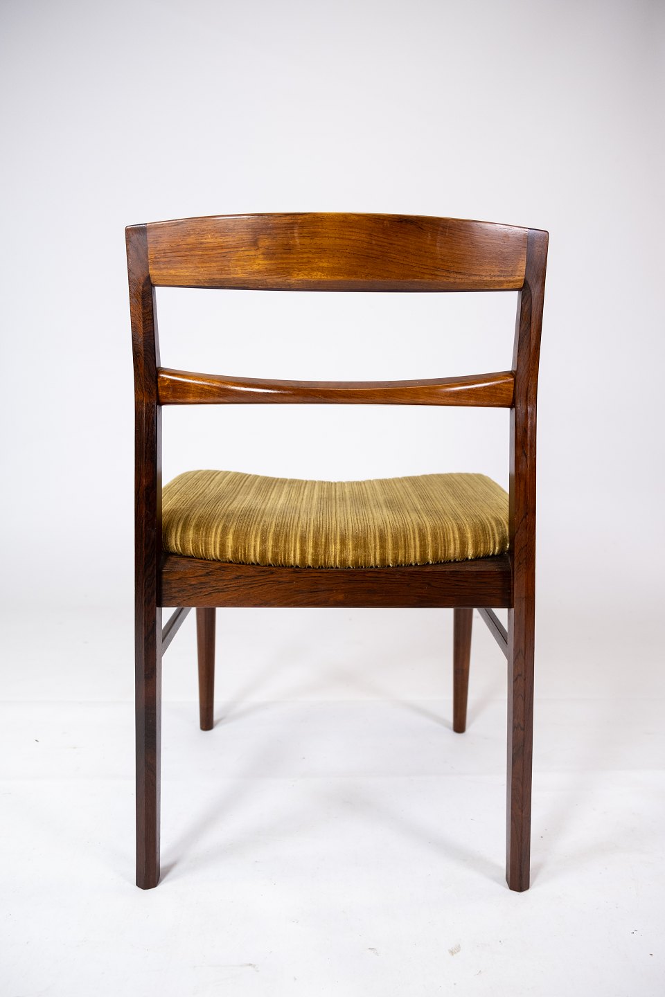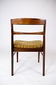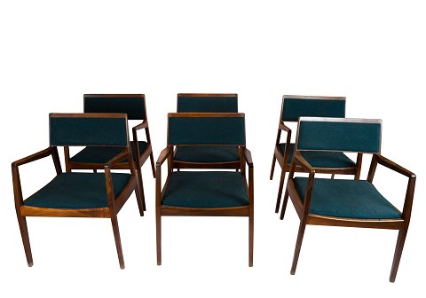 Et sæt spisestuestole i palisander og grønt stof, af dansk design fra 1960'erne, udstråler en tidløs elegance og enkelhed, der kendetegner den skandinaviske designtradition fra denne periode.