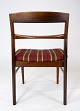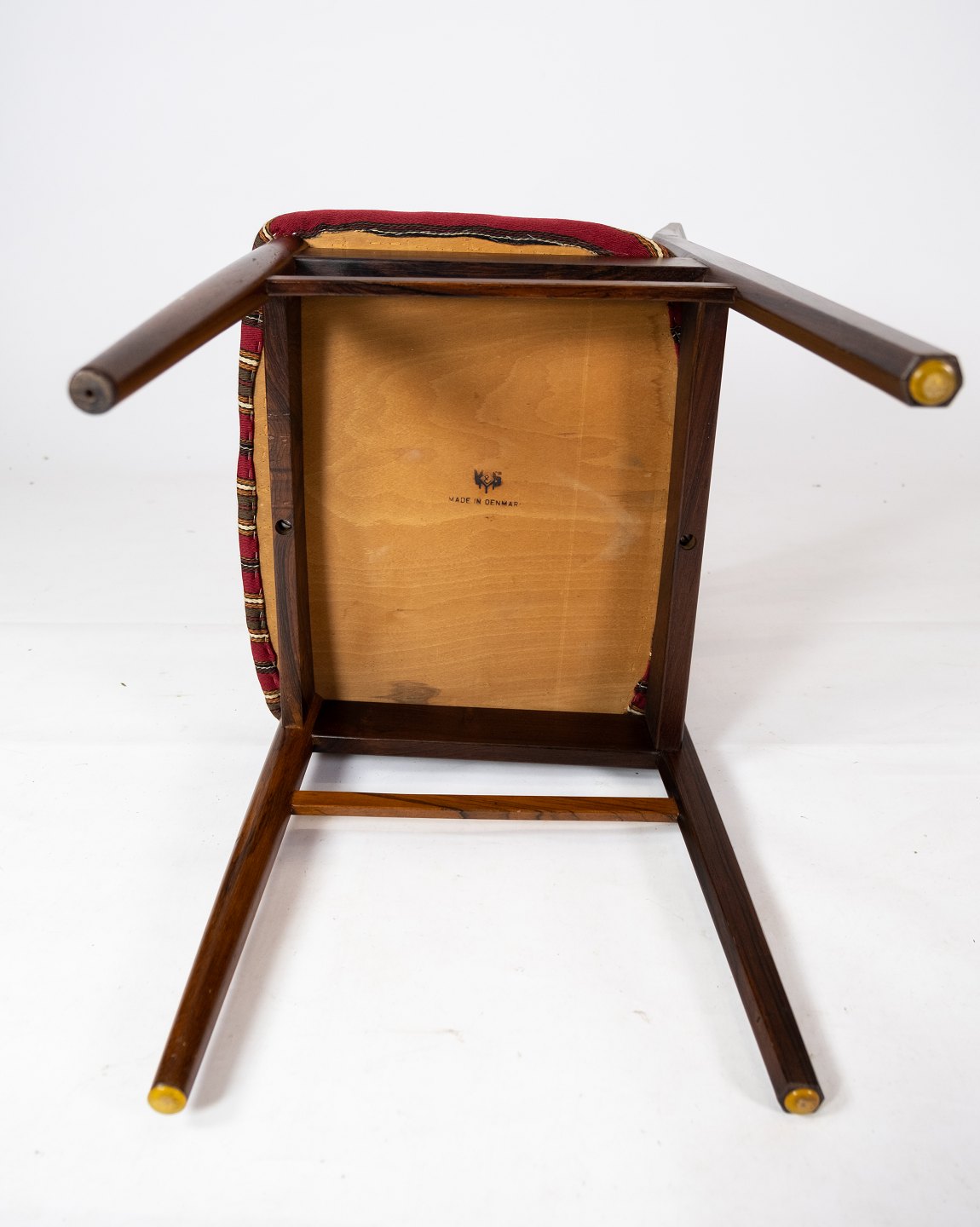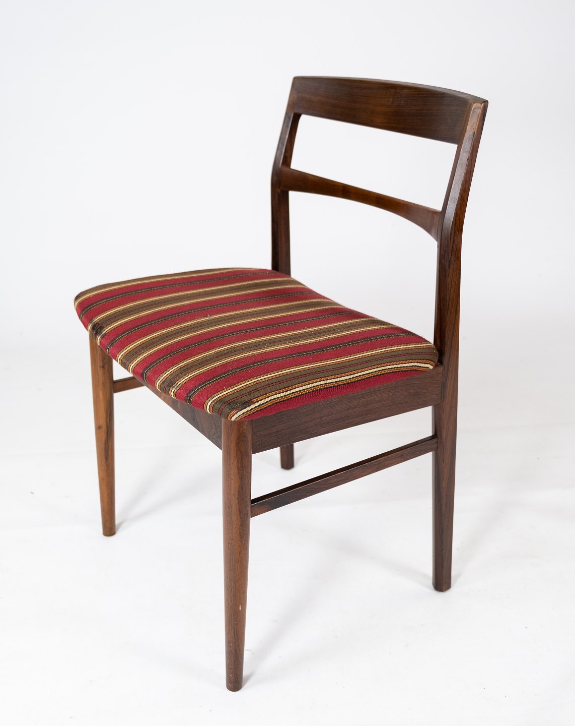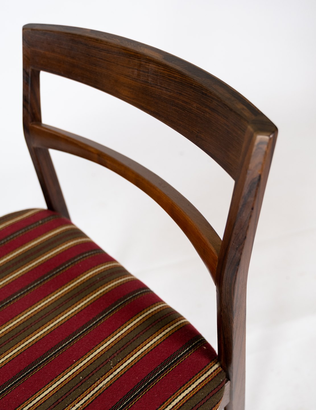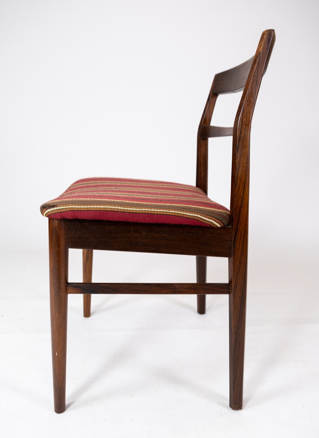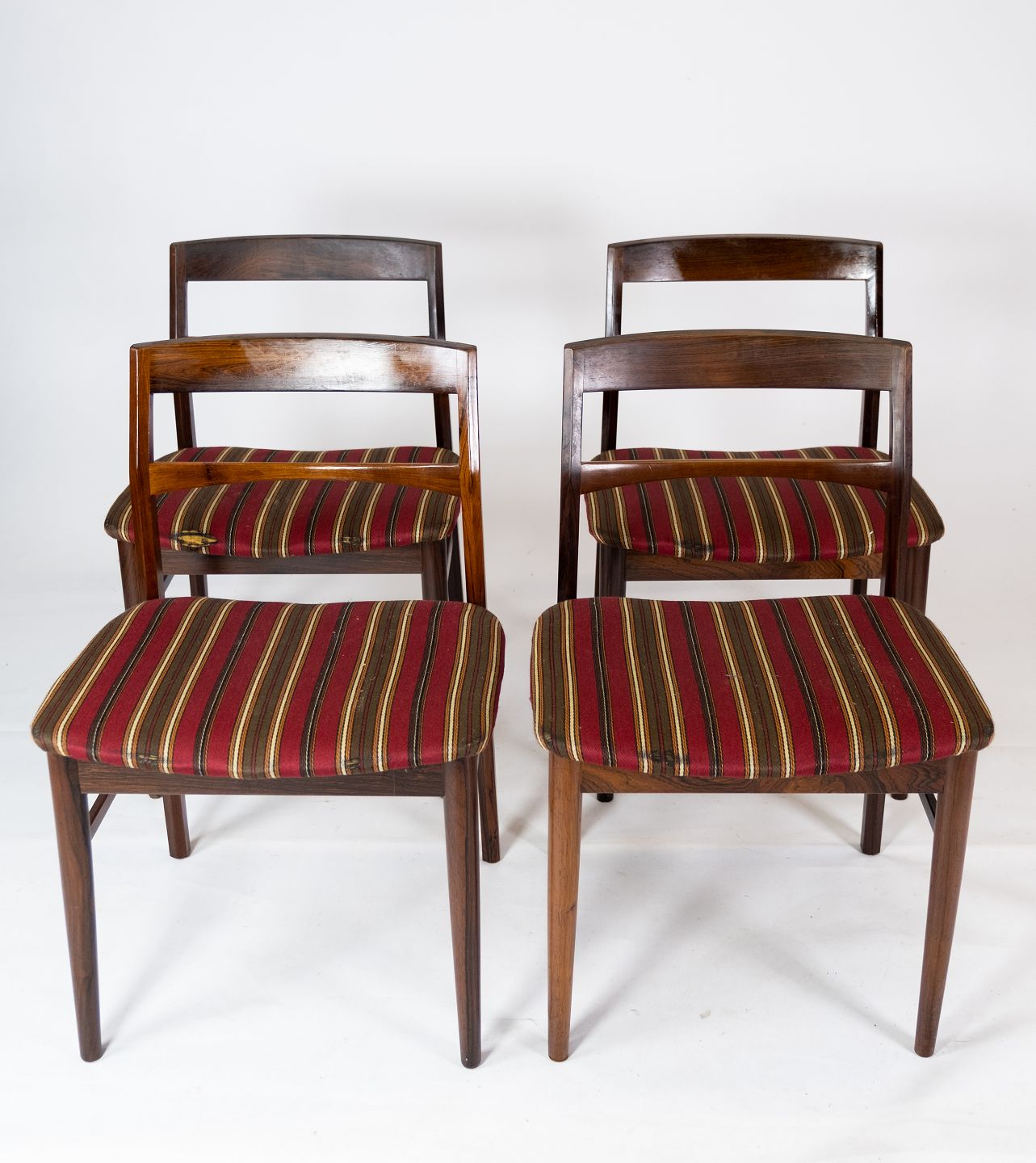 Et sæt af fire spisestuestole i palisander og stribet stof, af dansk design fra 1960'erne, fremviser en klassisk skandinavisk æstetik og håndværksmæssig finesse. Disse stole er et smukt eksempel på den enkle elegance og funktionalitet, der kendetegner dansk møbeldesign fra denne periode.