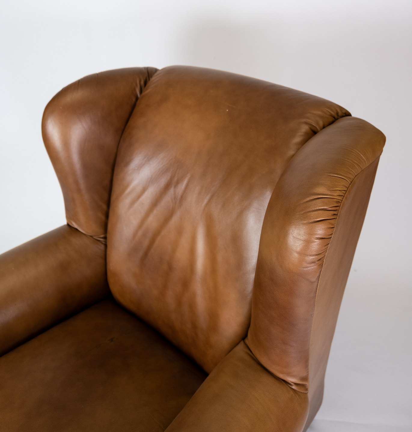 Stor hvilestole/øreklapstol i cognacfarvet læder. Stolen er i flot brugt stand.