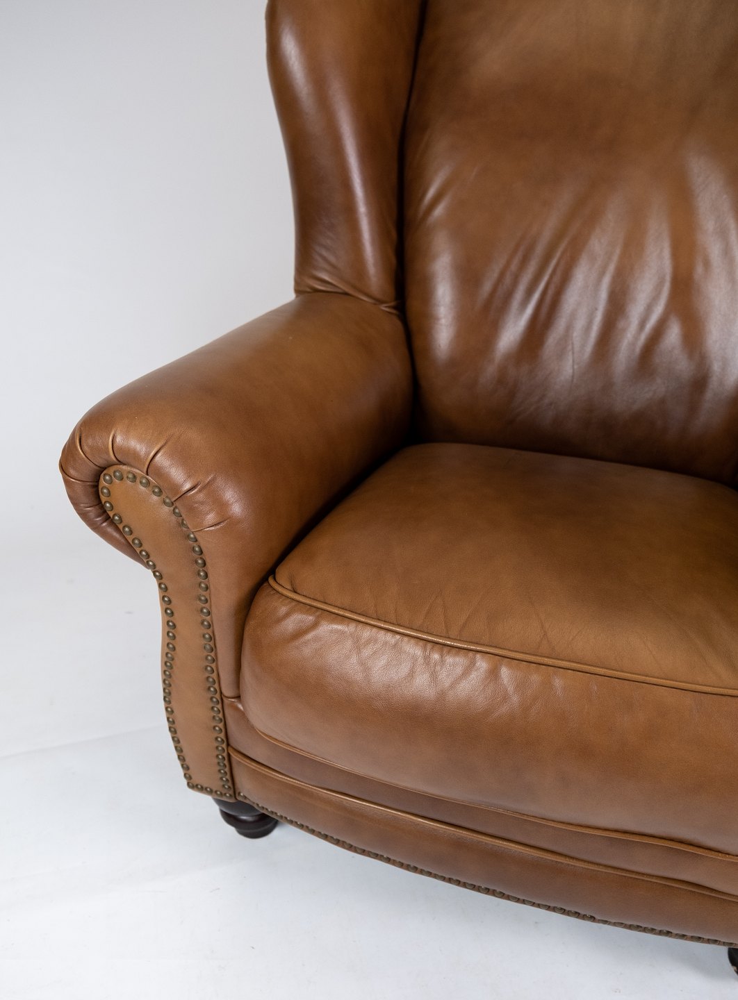 Stor hvilestole/øreklapstol i cognacfarvet læder.