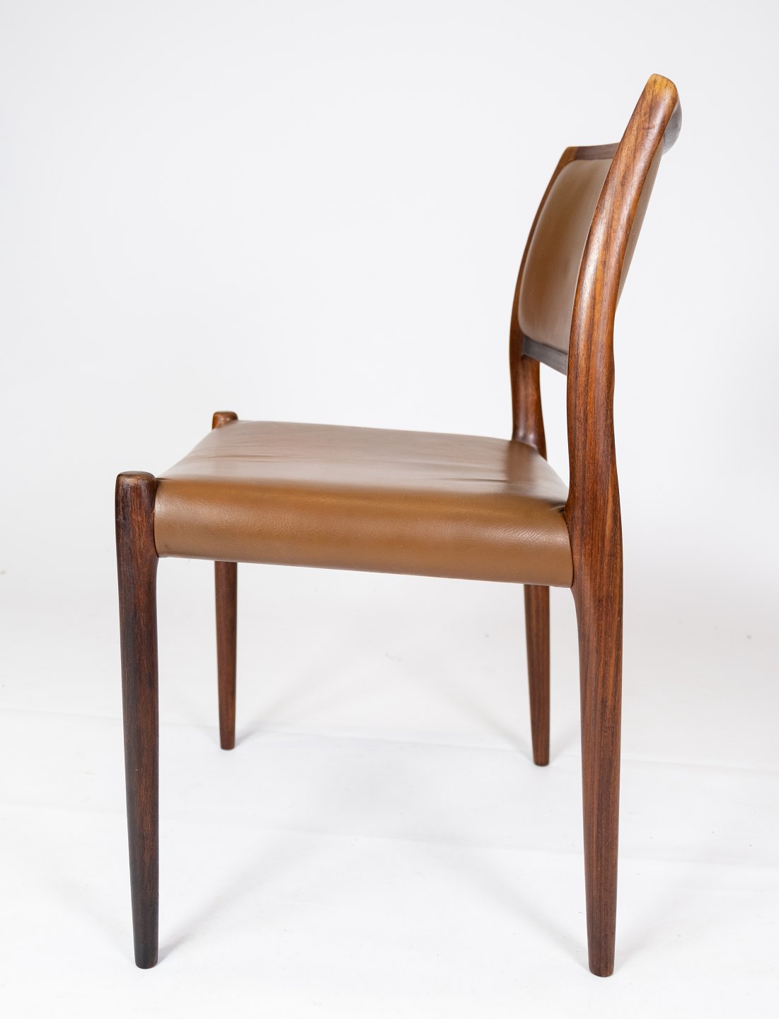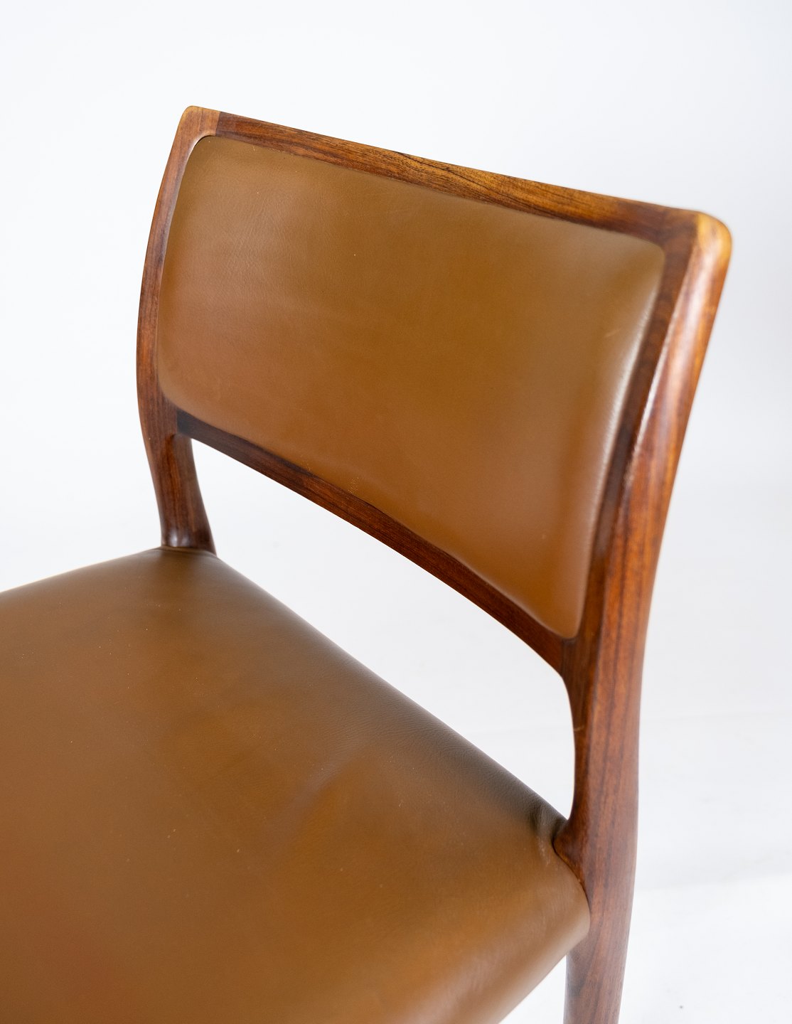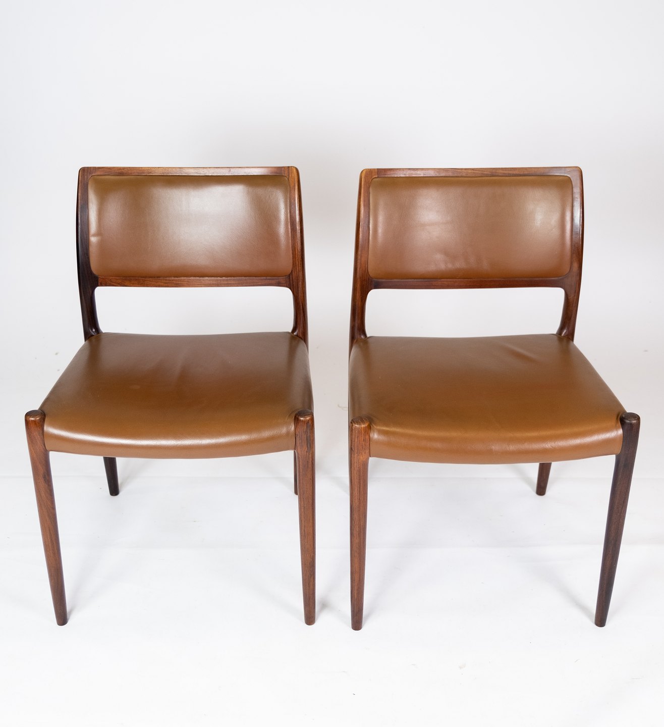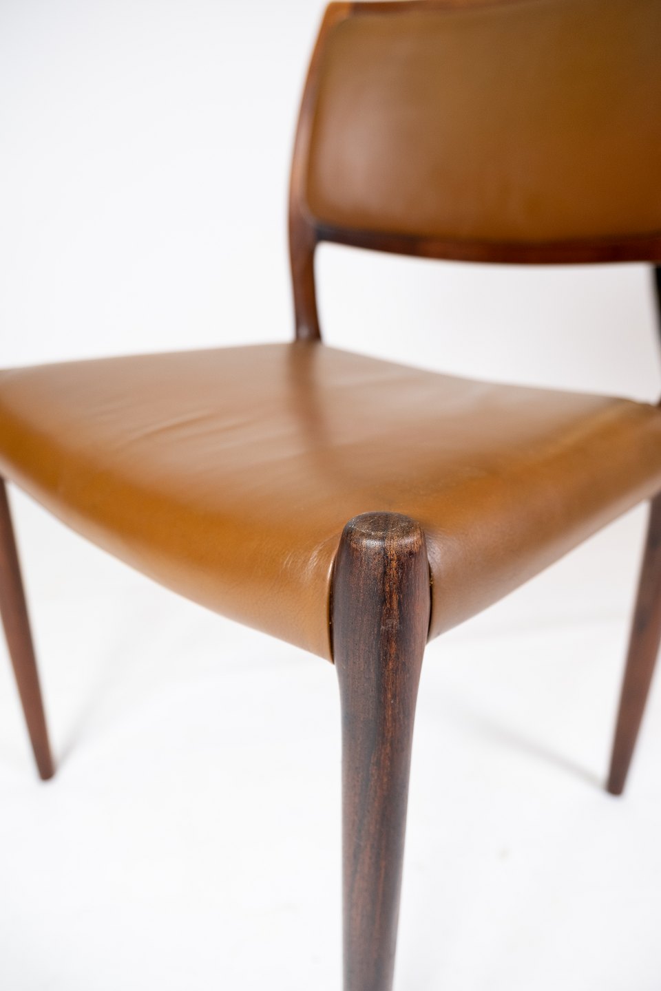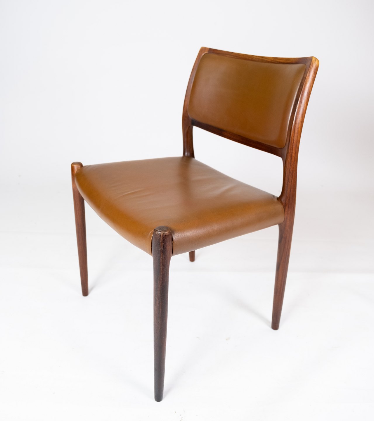 Sæt af 6 spisestuestole, model 80, i palisander og cognac farvet patineret læder designet af N.O. Møller. Stolene er i flot brugt stand og fra 1960erne.