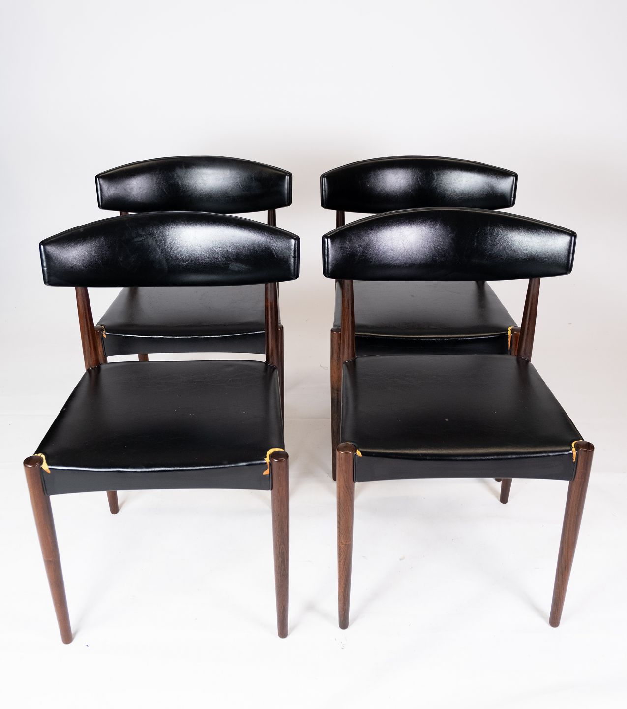 Dette sæt af fire spisestuestole er et smukt eksempel på dansk design fra 1960'erne. Stolene er fremstillet af palisander, et eksklusivt træ kendt for sin rige farve og smukke korn.