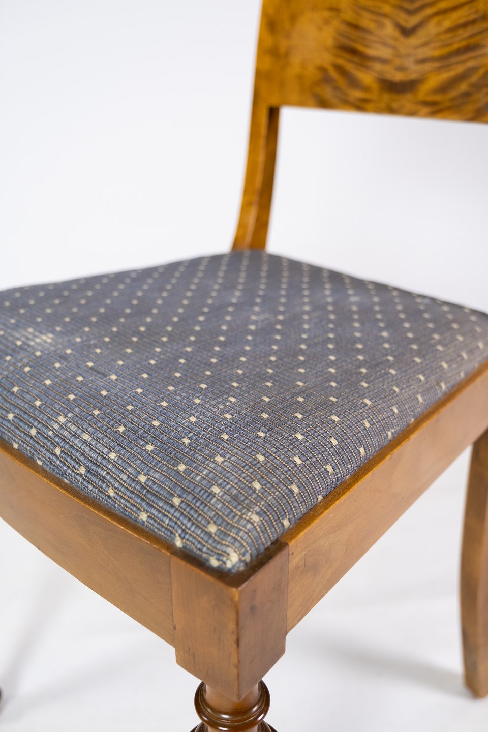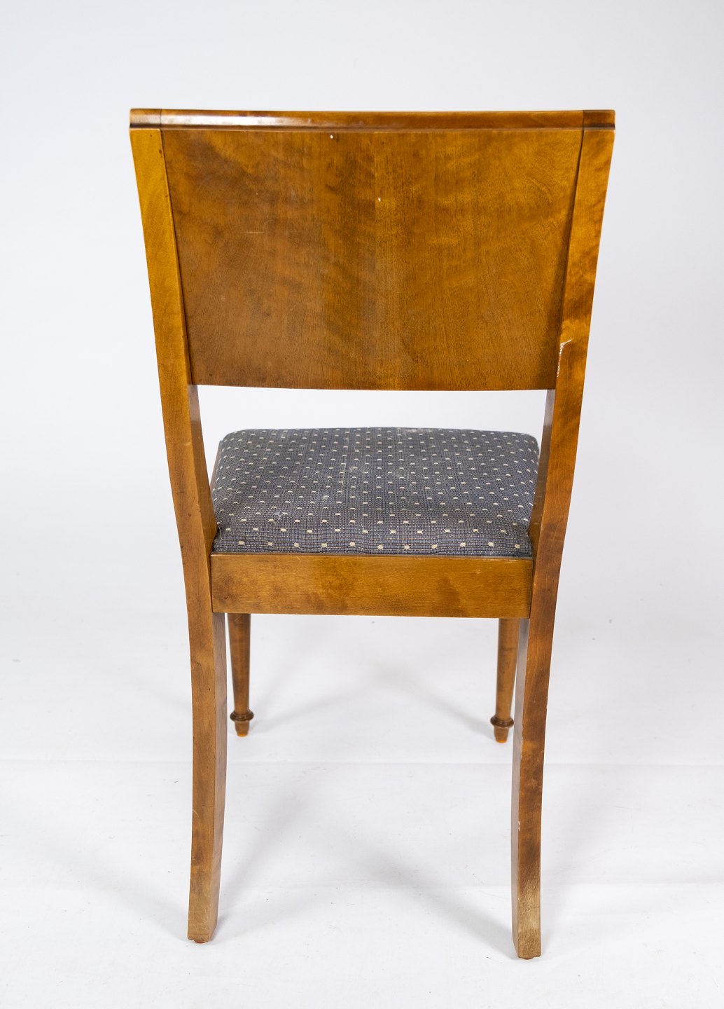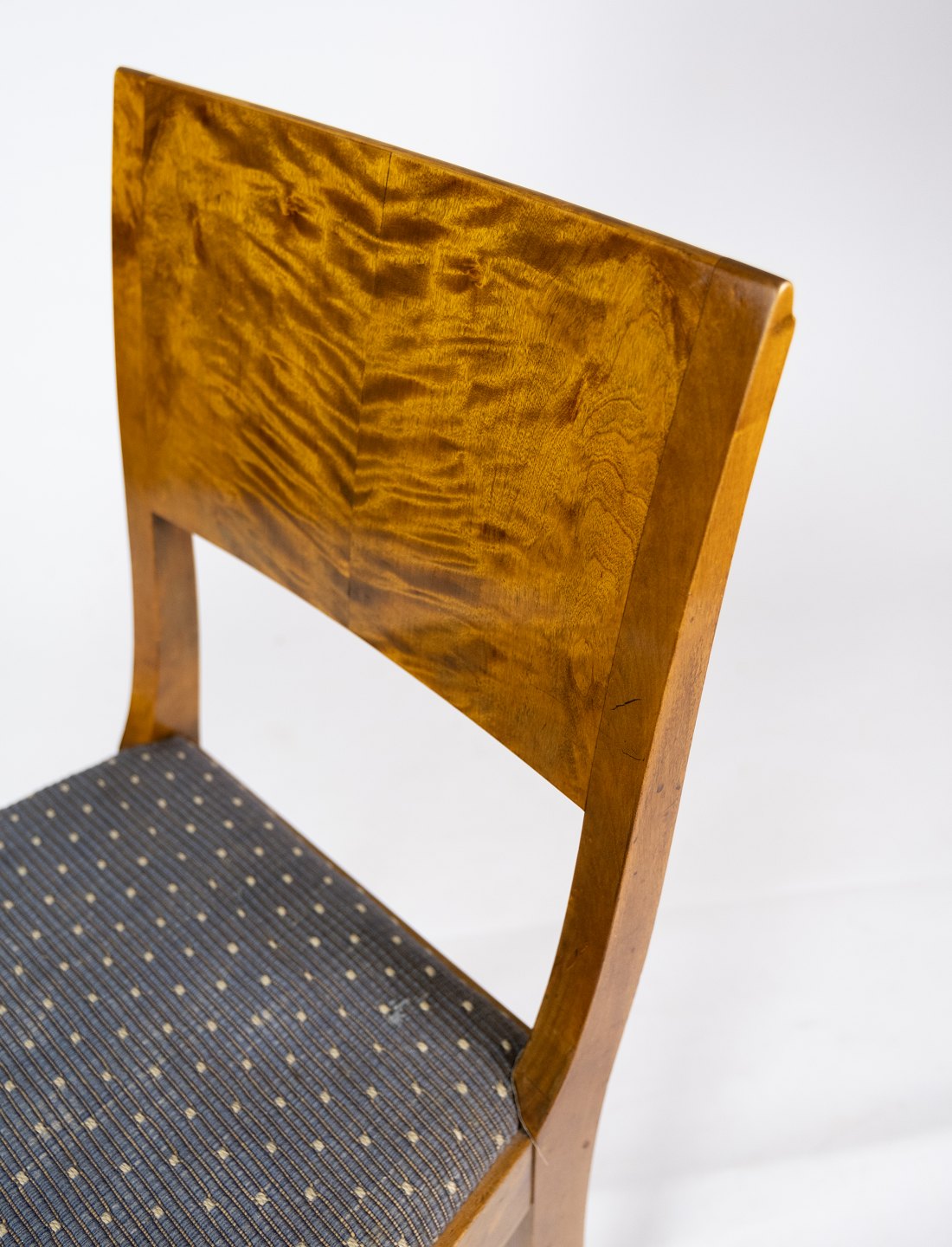 Sæt af 8 spisestuestole af birketræ og polstret med blåt stof fra 1930erne. Stolene er i flot antik stand.