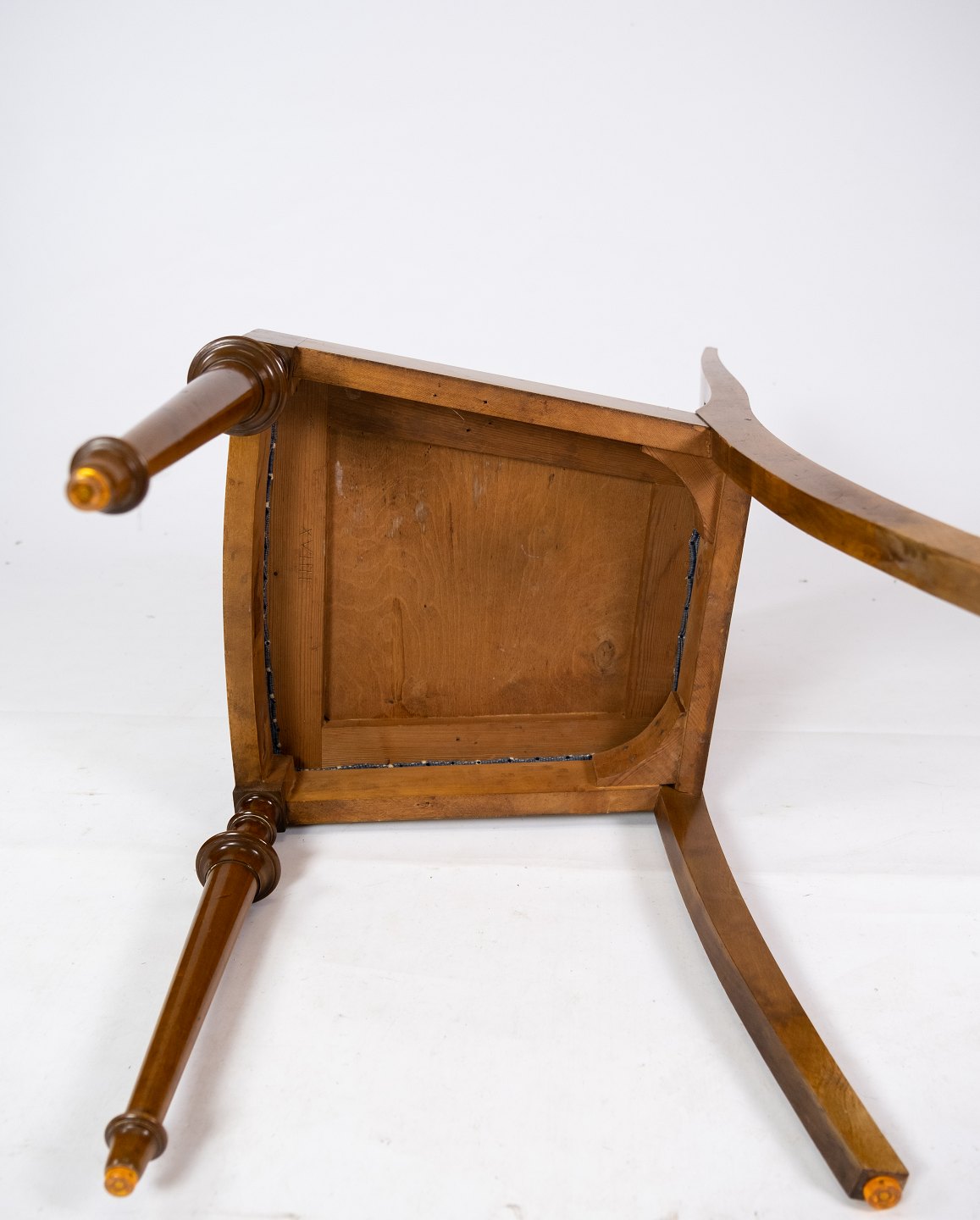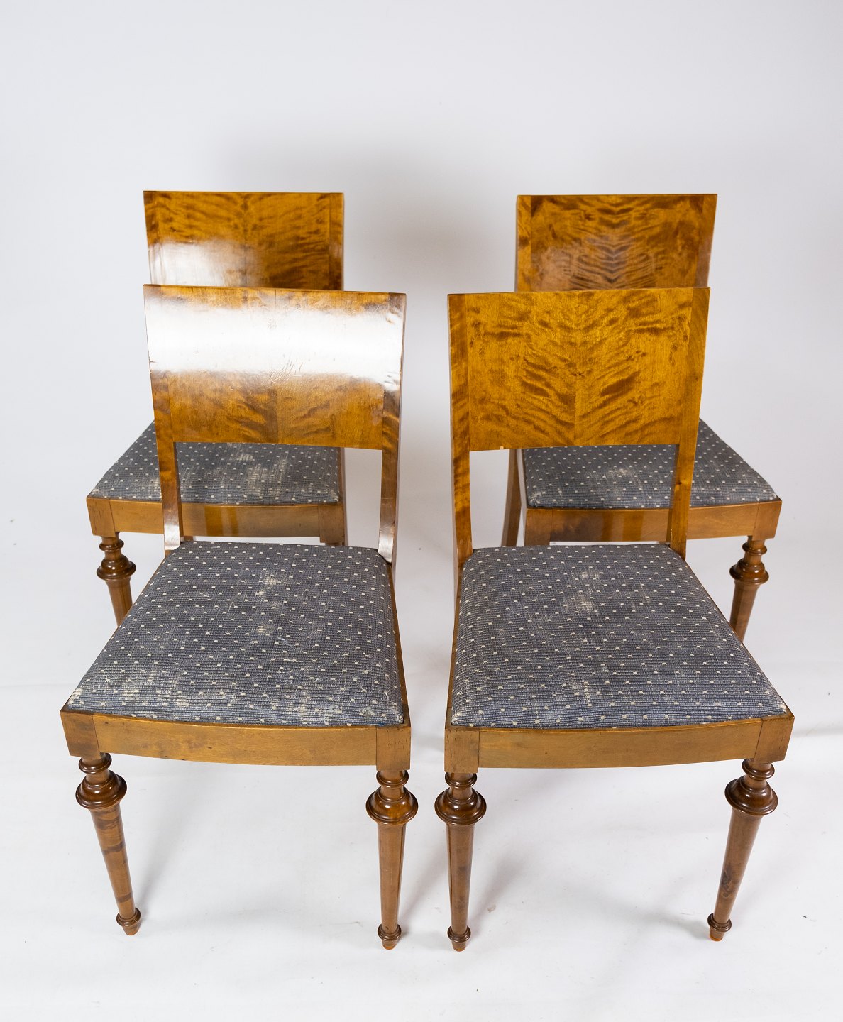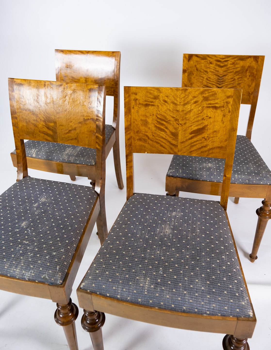Sæt af 8 spisestuestole af birketræ og polstret med blåt stof fra 1930erne. Stolene er i flot antik stand.