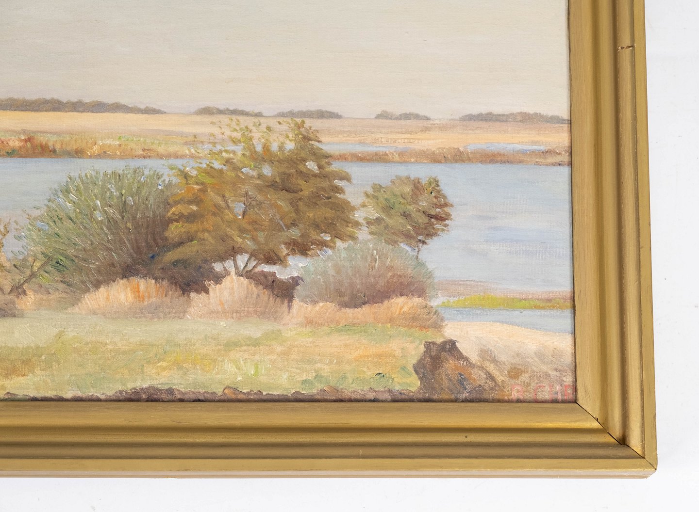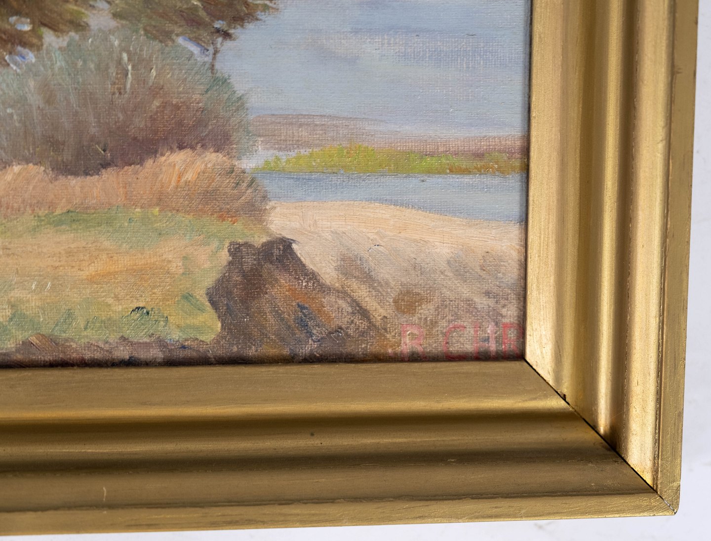 Oliemaleri med natur motiv og forgyldt ramme, med ukendt signatur.