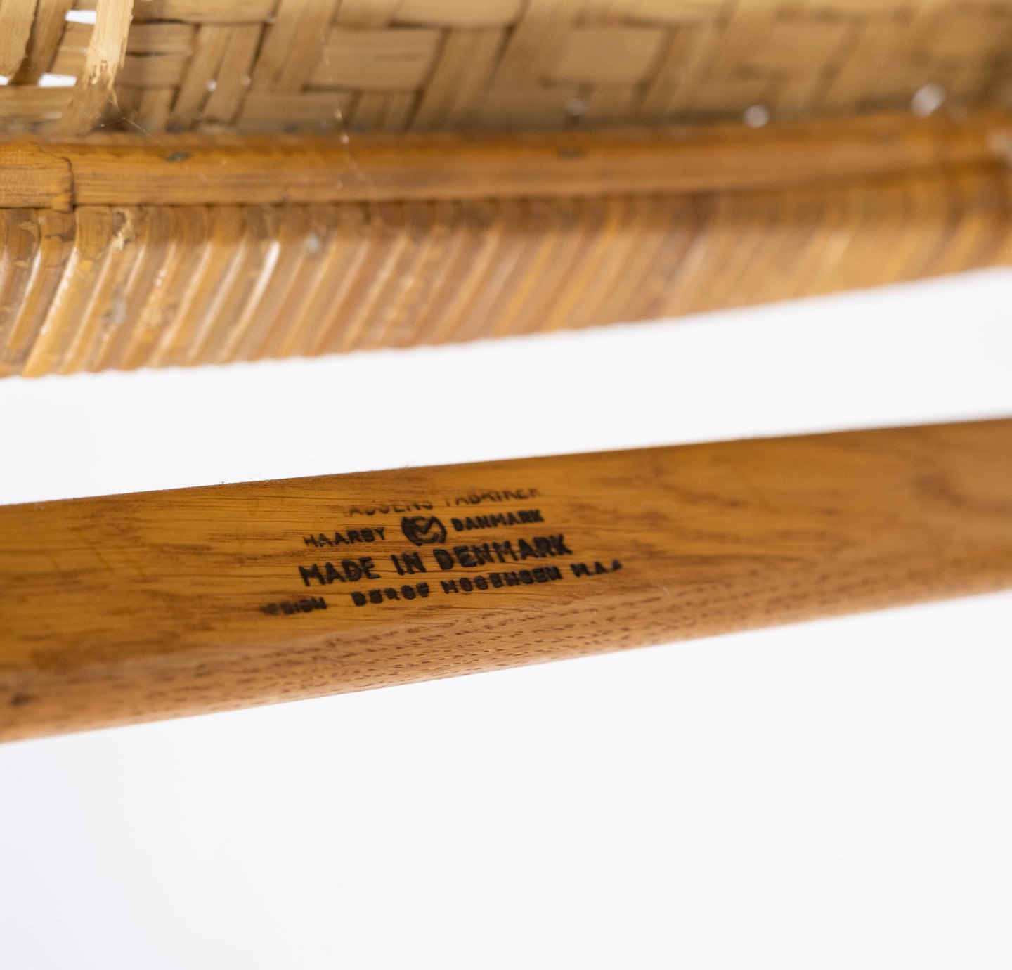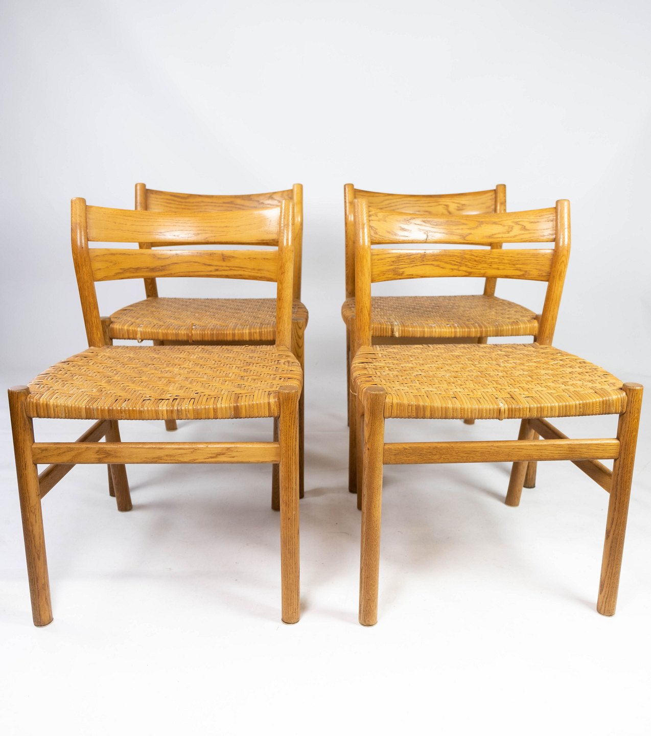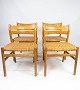 SolgtEt sæt af fire spisestuestole i egetræ og sæde i flet, designet af Børge Mogensen og fremstillet af Haaby Møbler i 1960erne. Stolene er i flot brugt stand.