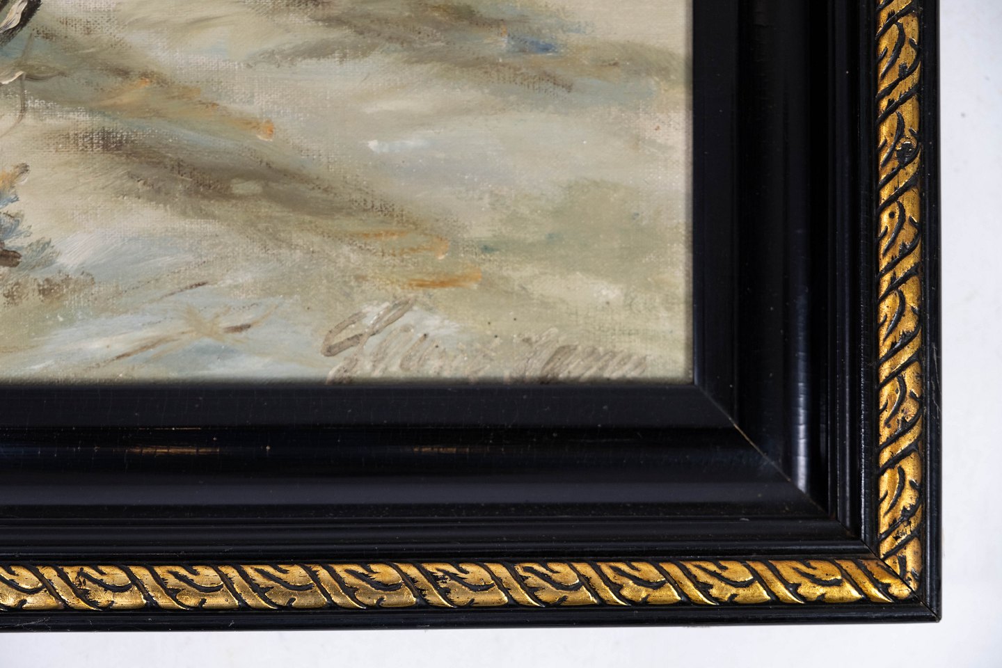Oil painting with winter motif and black painted frame, with unknown signature from the 1920s.