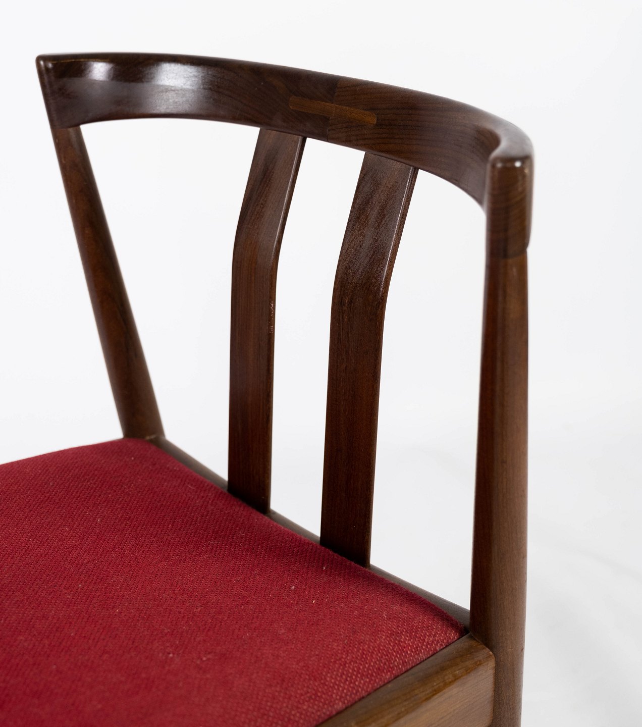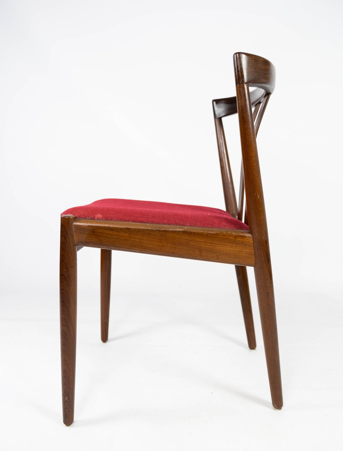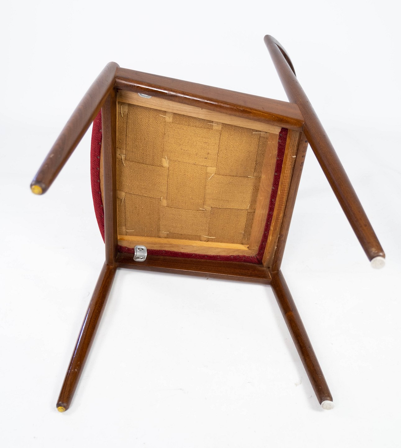 Spisestuestol i teak og polstret med rødt stof af dansk design fra 1960erne. Stolen er i flot brugt stand.