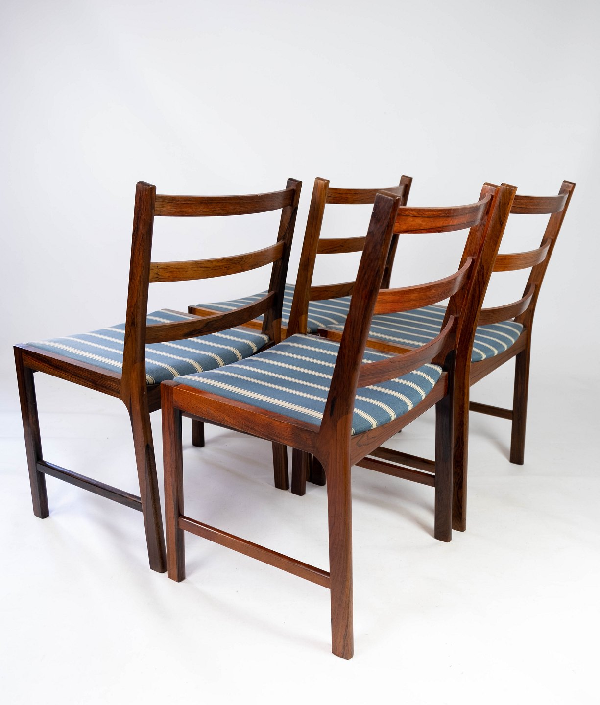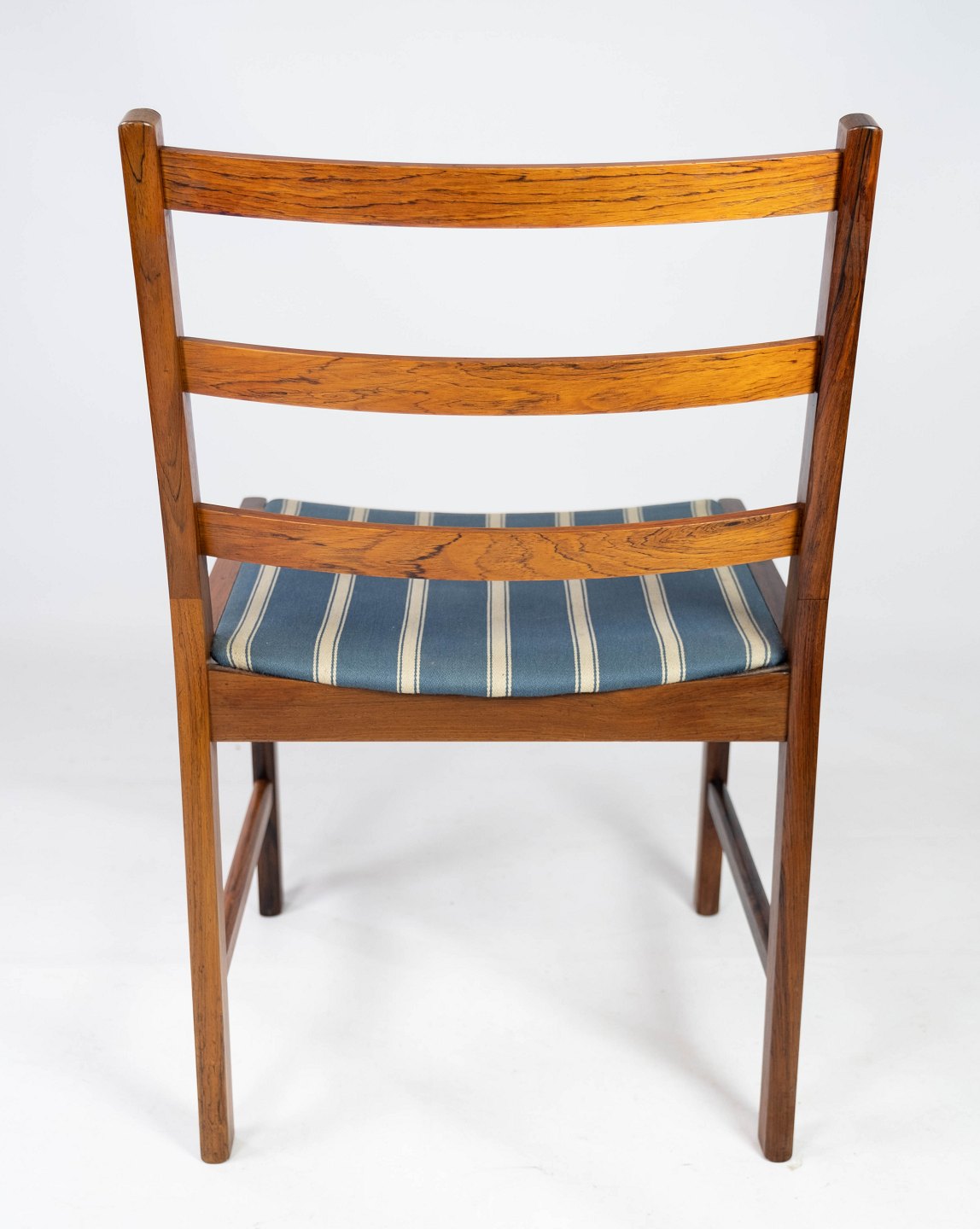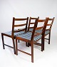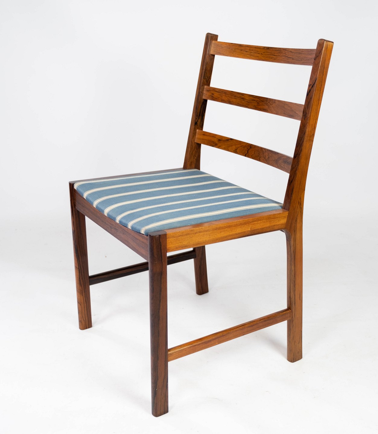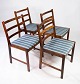 SolgtEt sæt af fire spisestuestole i palisander og sæde polstret med blåt stribet stof, af dansk design fra 1960erne. Stolene er i flot brugt stand.