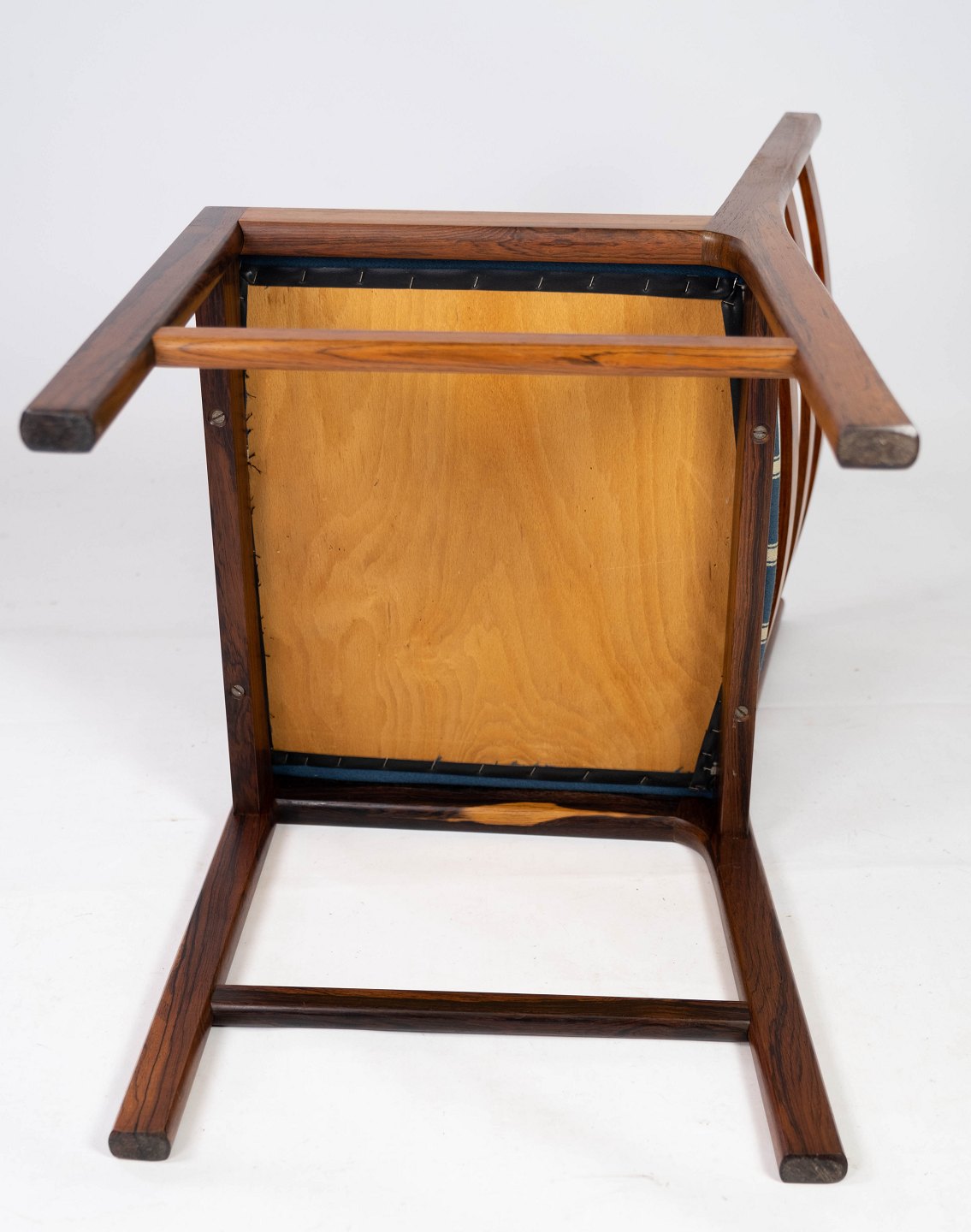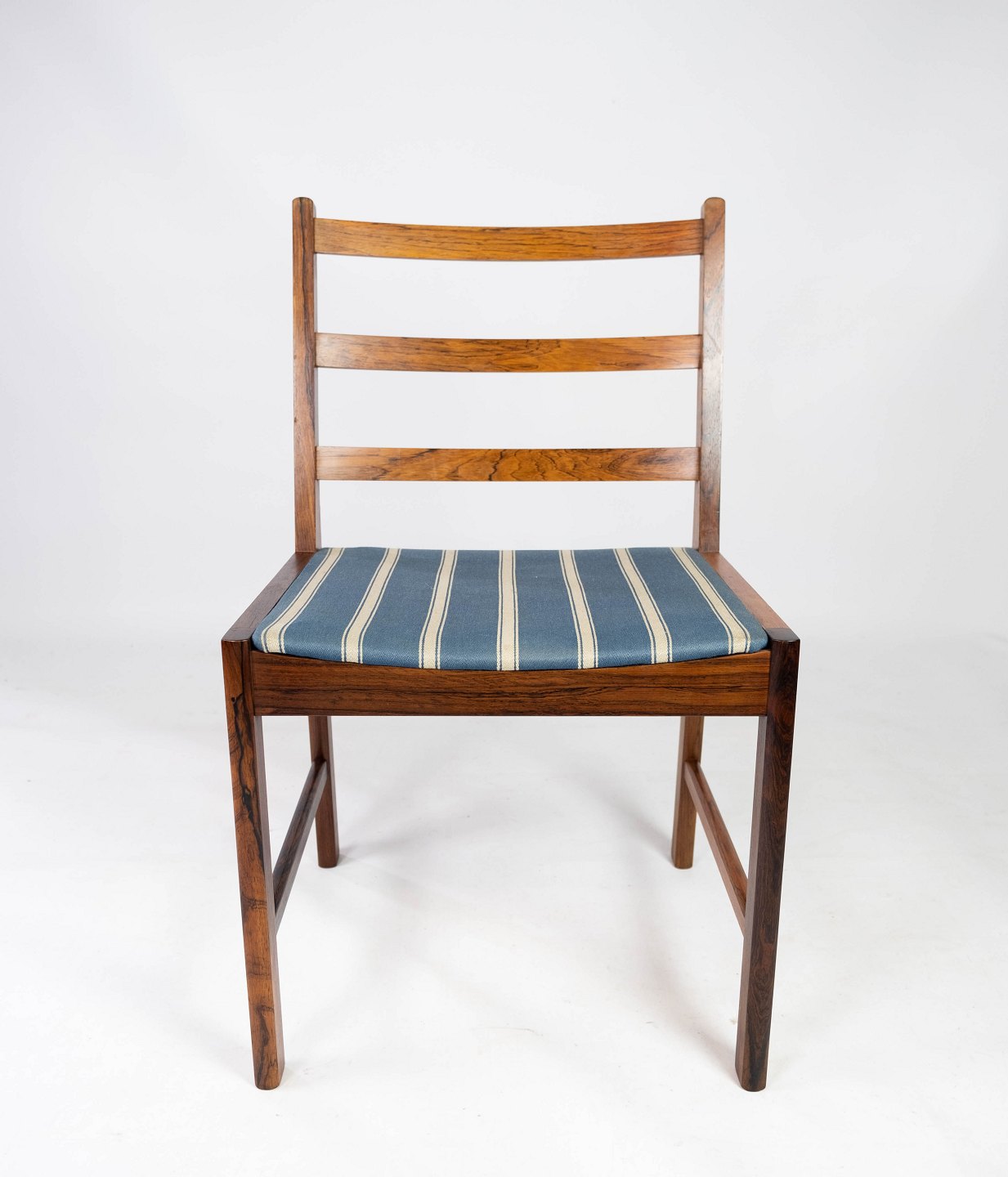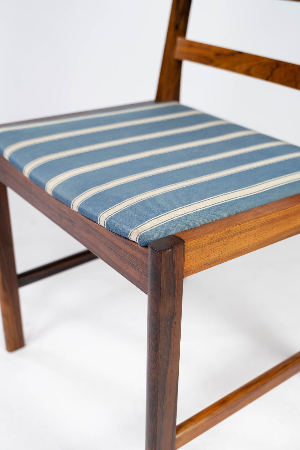 SolgtEt sæt af fire spisestuestole i palisander og sæde polstret med blåt stribet stof, af dansk design fra 1960erne. Stolene er i flot brugt stand.