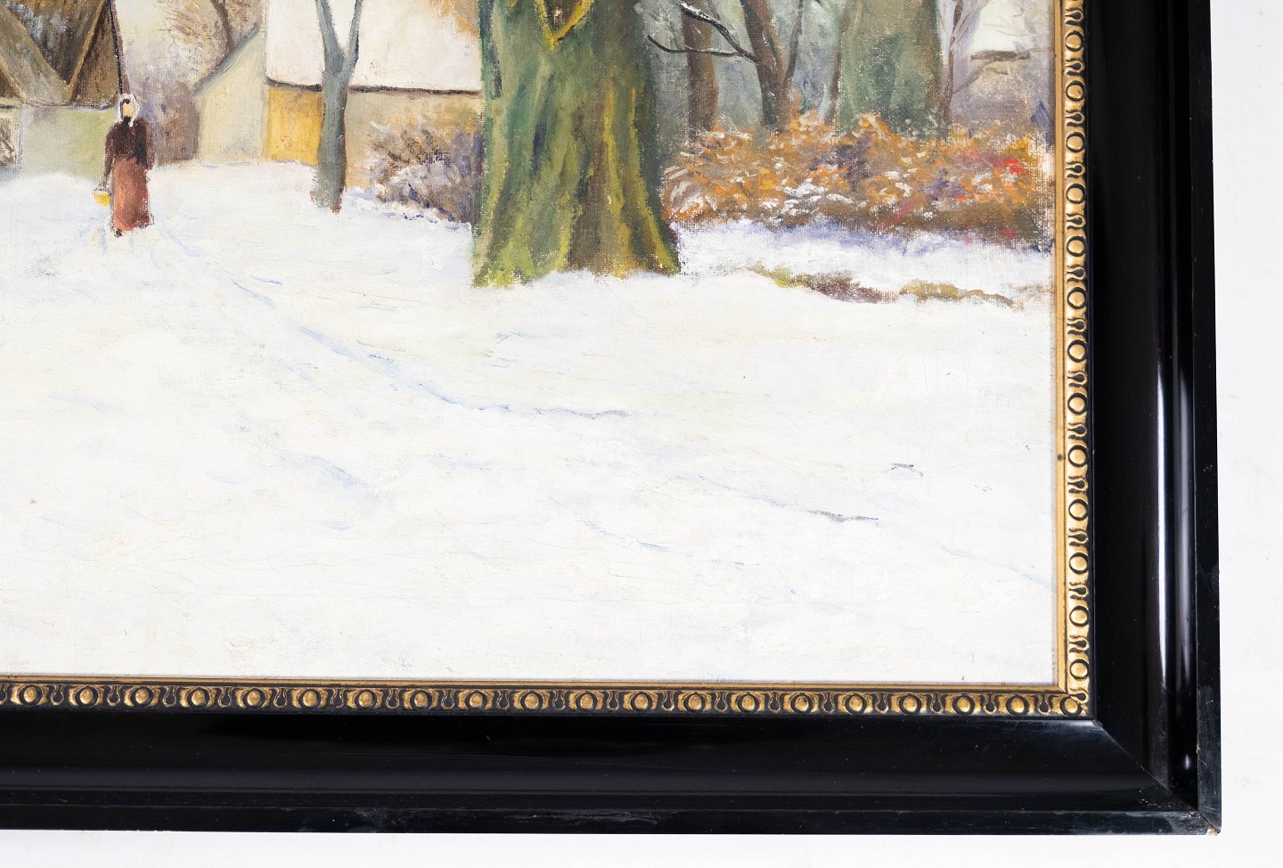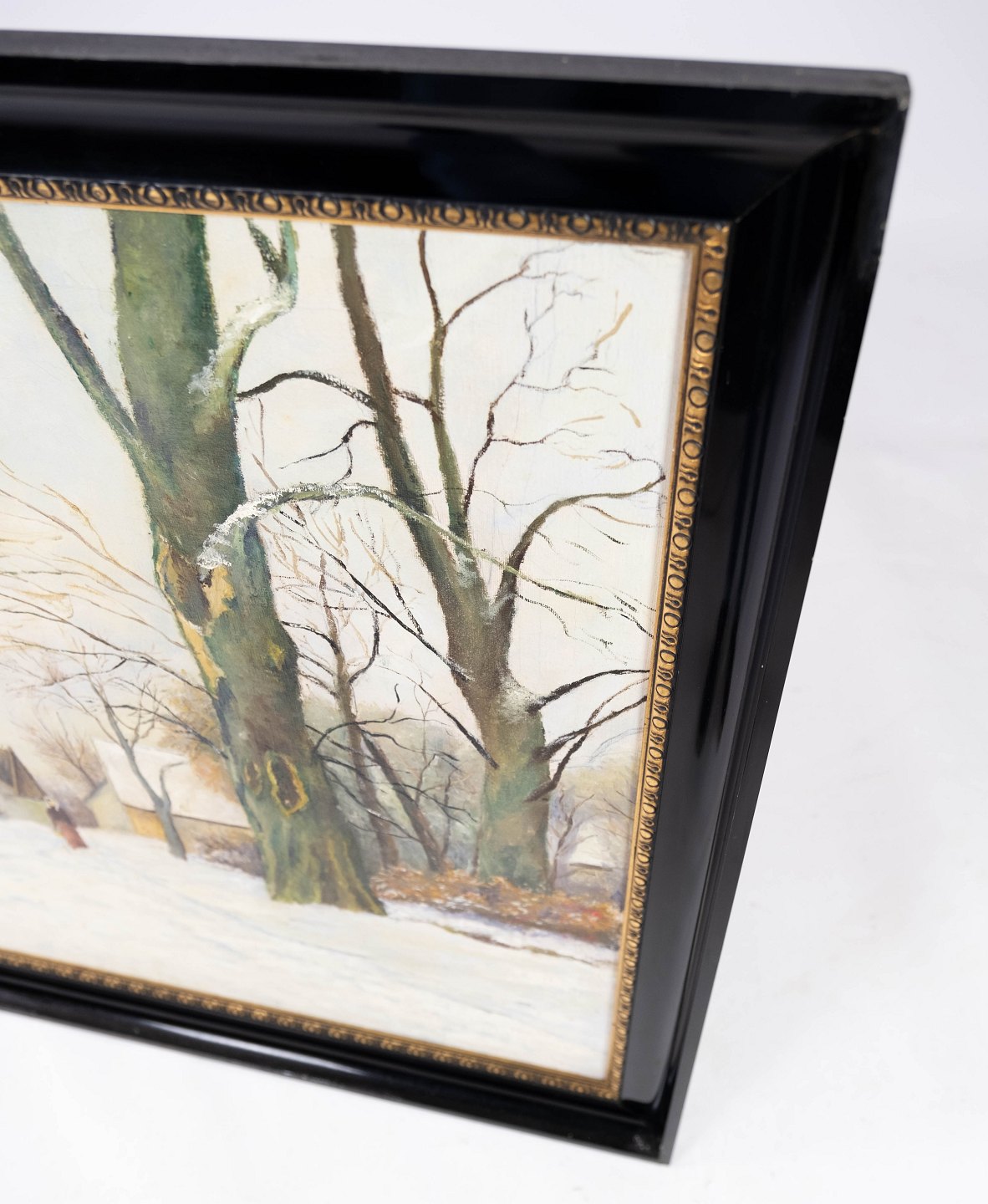 Oil painting with winter motif and black painted frame, without signature from the 1910s.