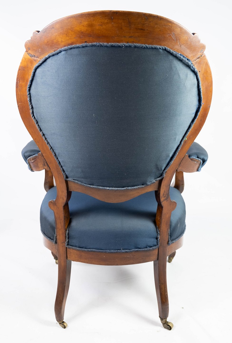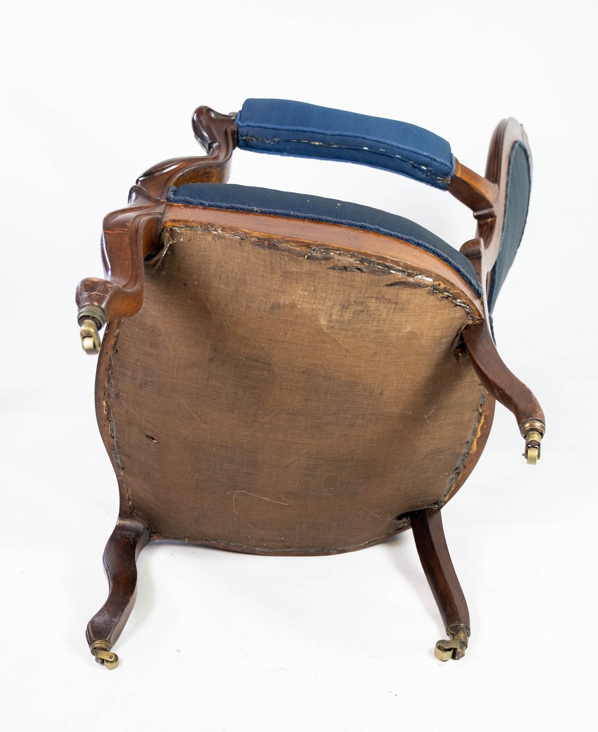 Antik armstol af mahogni og polstret med blåt stof fra 1880. Stolen er i flot brugt stand og med hjul.