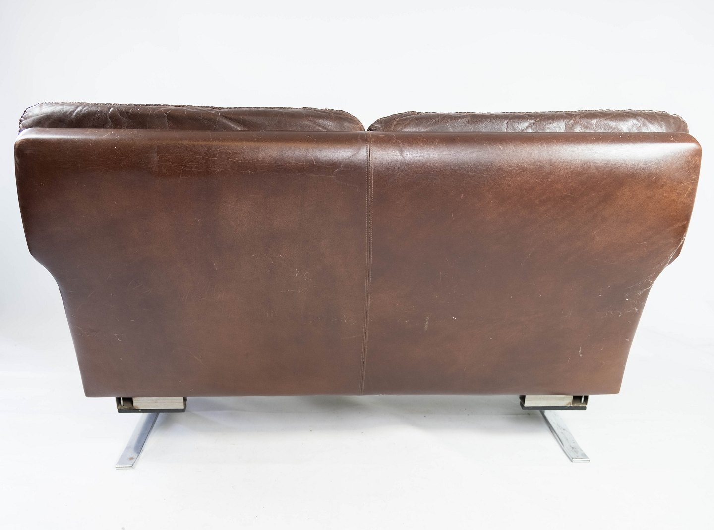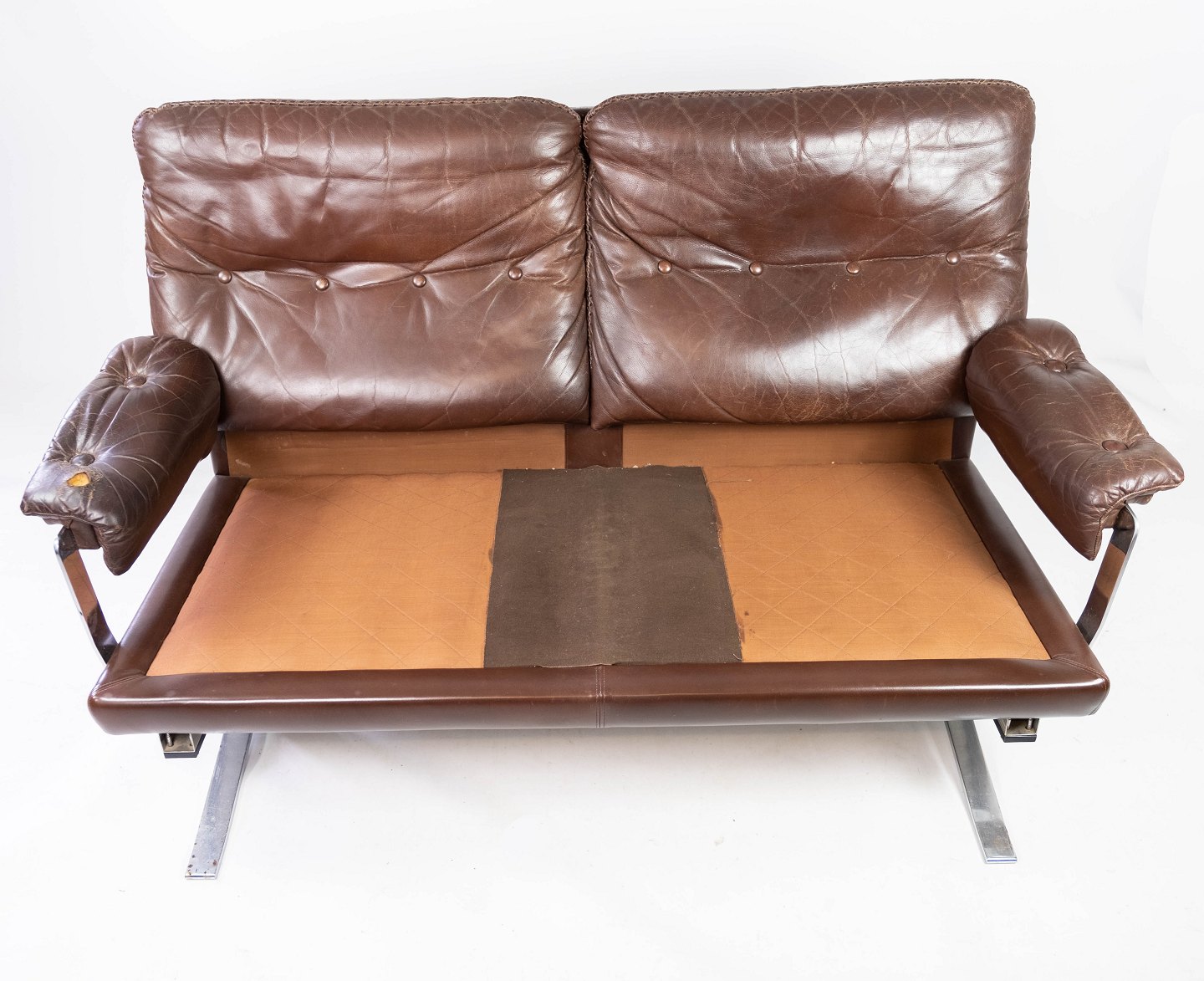 This two-seater sofa is a distinctive example of Arne Norell's design from the 1970s. With its upholstery of patinated leather and metal frame, the sofa exudes a stylish and modern aesthetic. Despite its age, the sofa is in nice used condition and offers a comfortable sitting experience. This sofa is an ideal choice for those looking for a nice and comfortable piece of furniture with a unique history and period charm.
