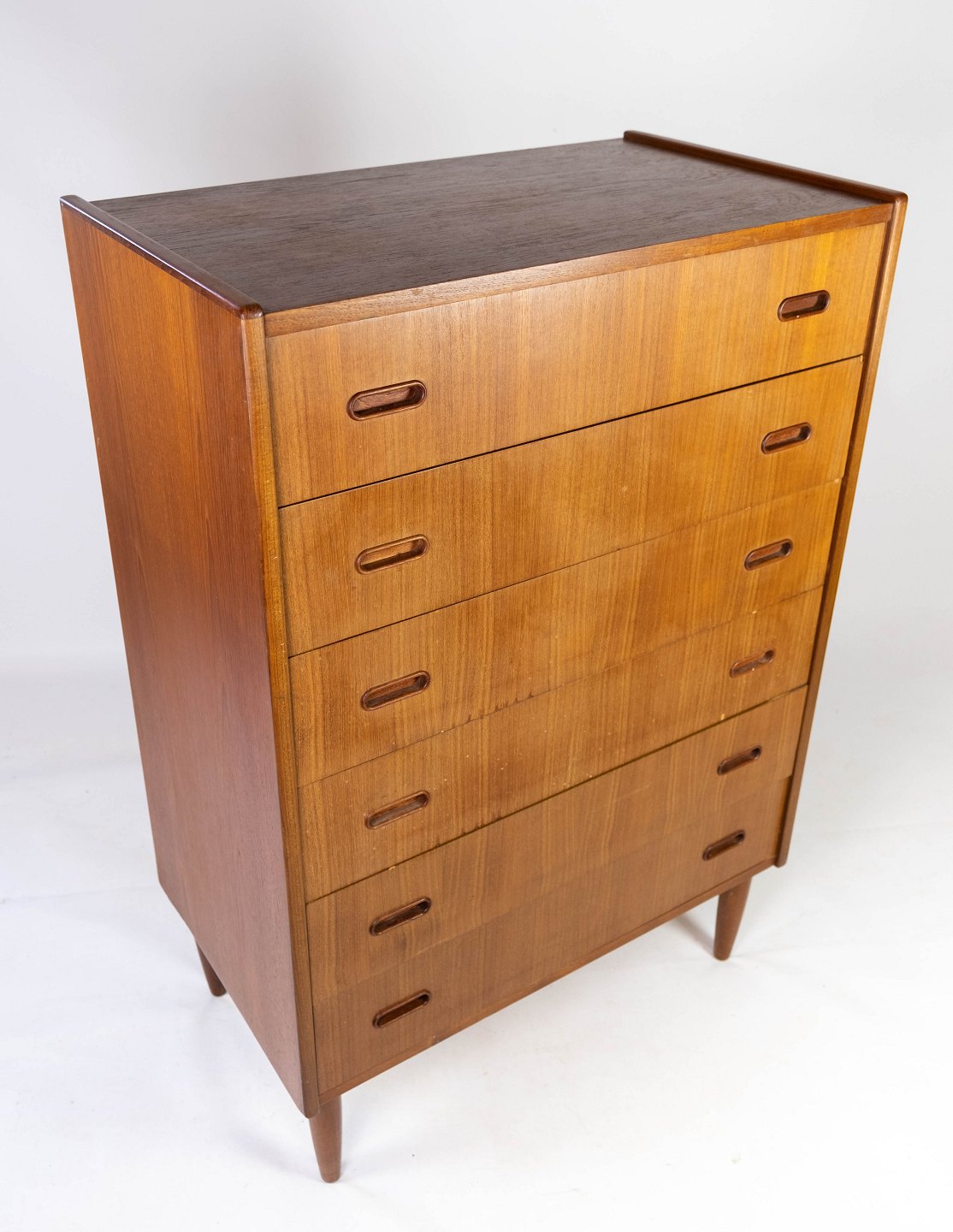 This teak chest of drawers, designed by Danish craftsmen around 1960, is a classic example of Danish furniture design from this era. The teak wood adds a warm and natural tone to the furniture and at the same time brings a feeling of durability and timelessness.