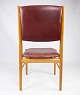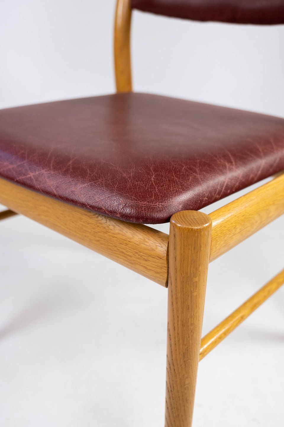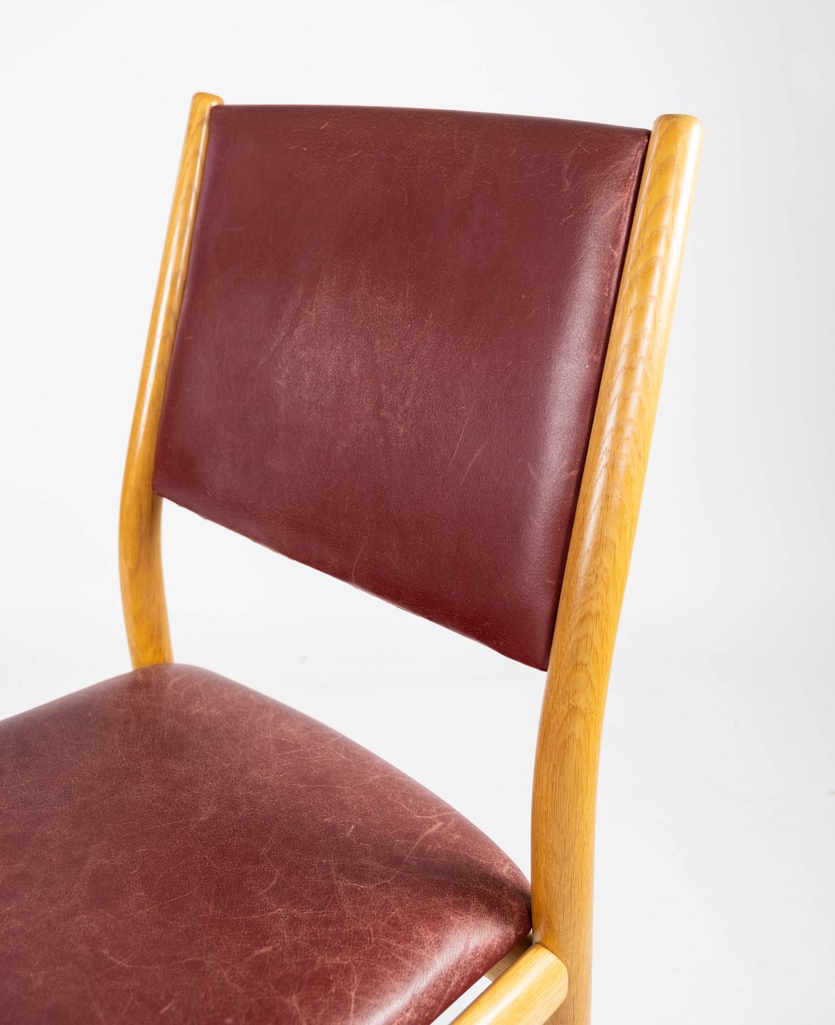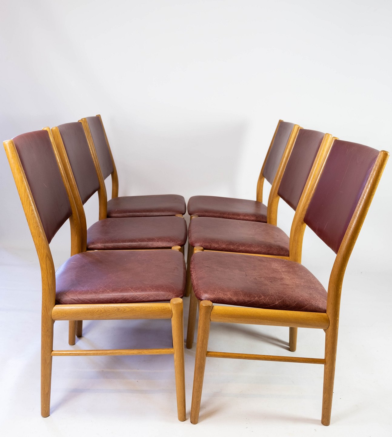 Set of six dining room chairs of oak and upholstered with bordeaux leather, of danish design from the 1960s.