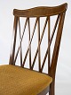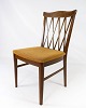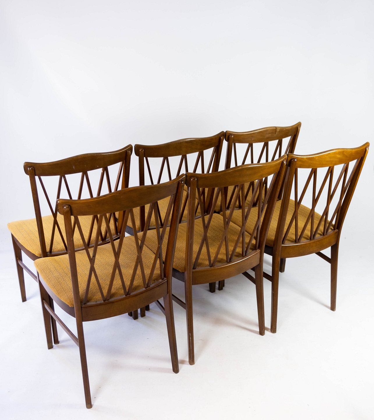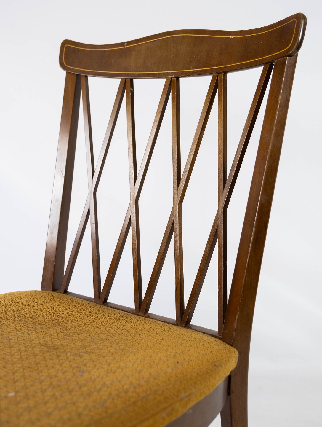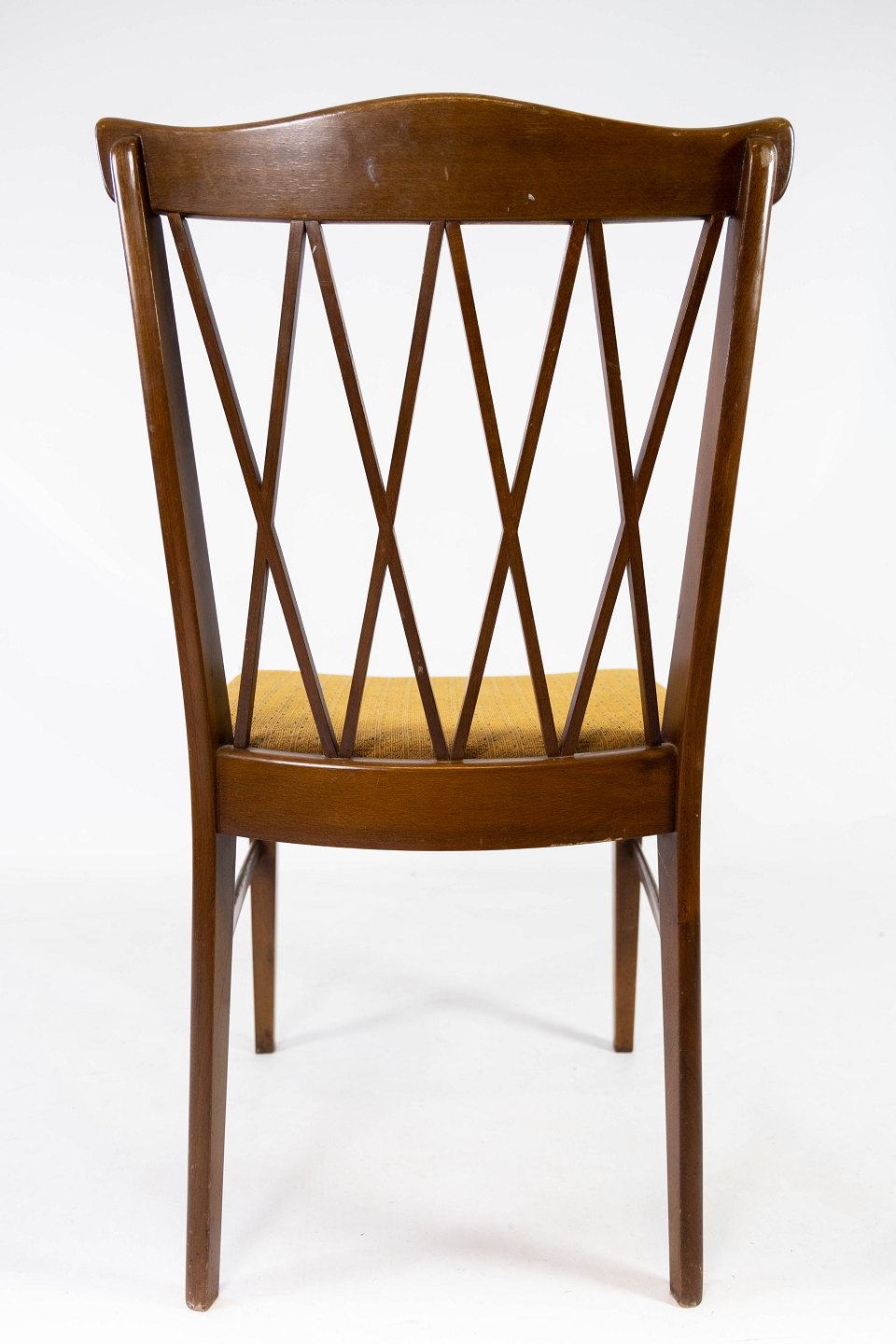 SolgtSæt af seks spisestuestole af nøddetræ og polstret med mørkt stof fra 1940erne. Stolene er i flot brugt stand.