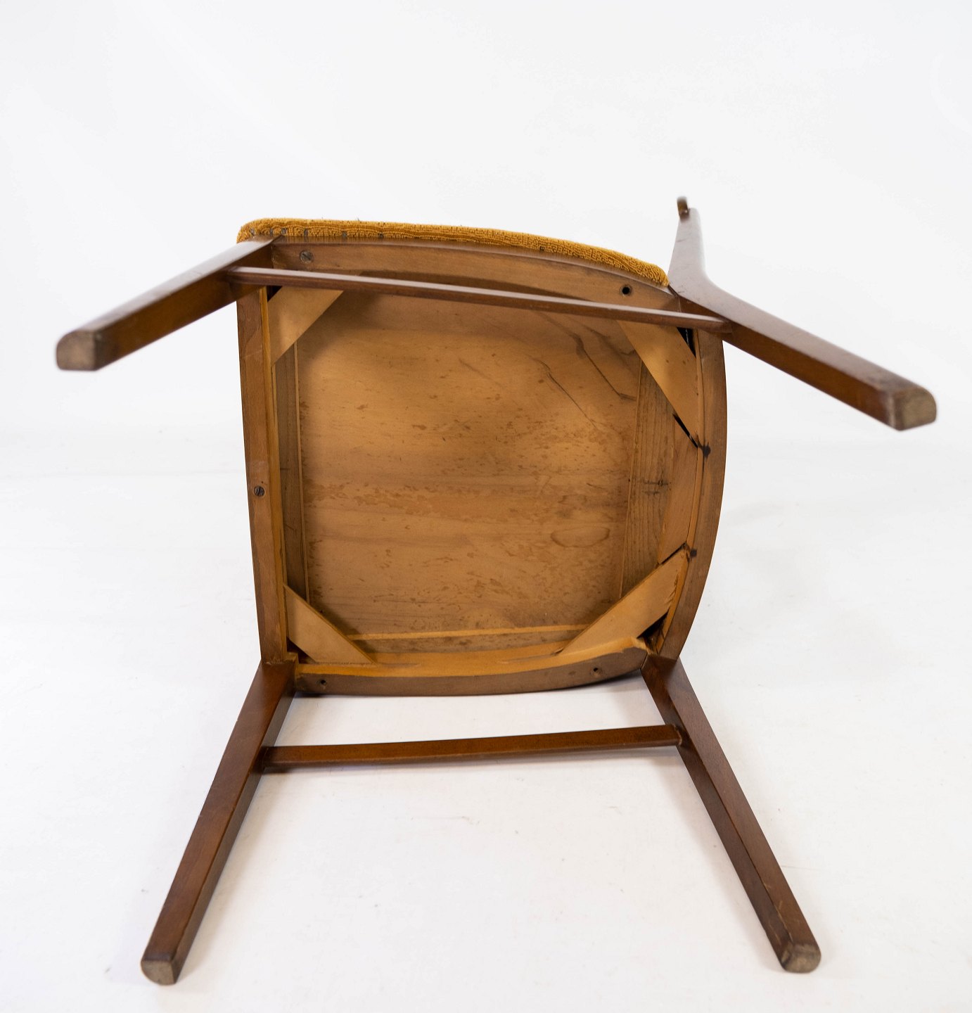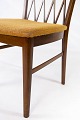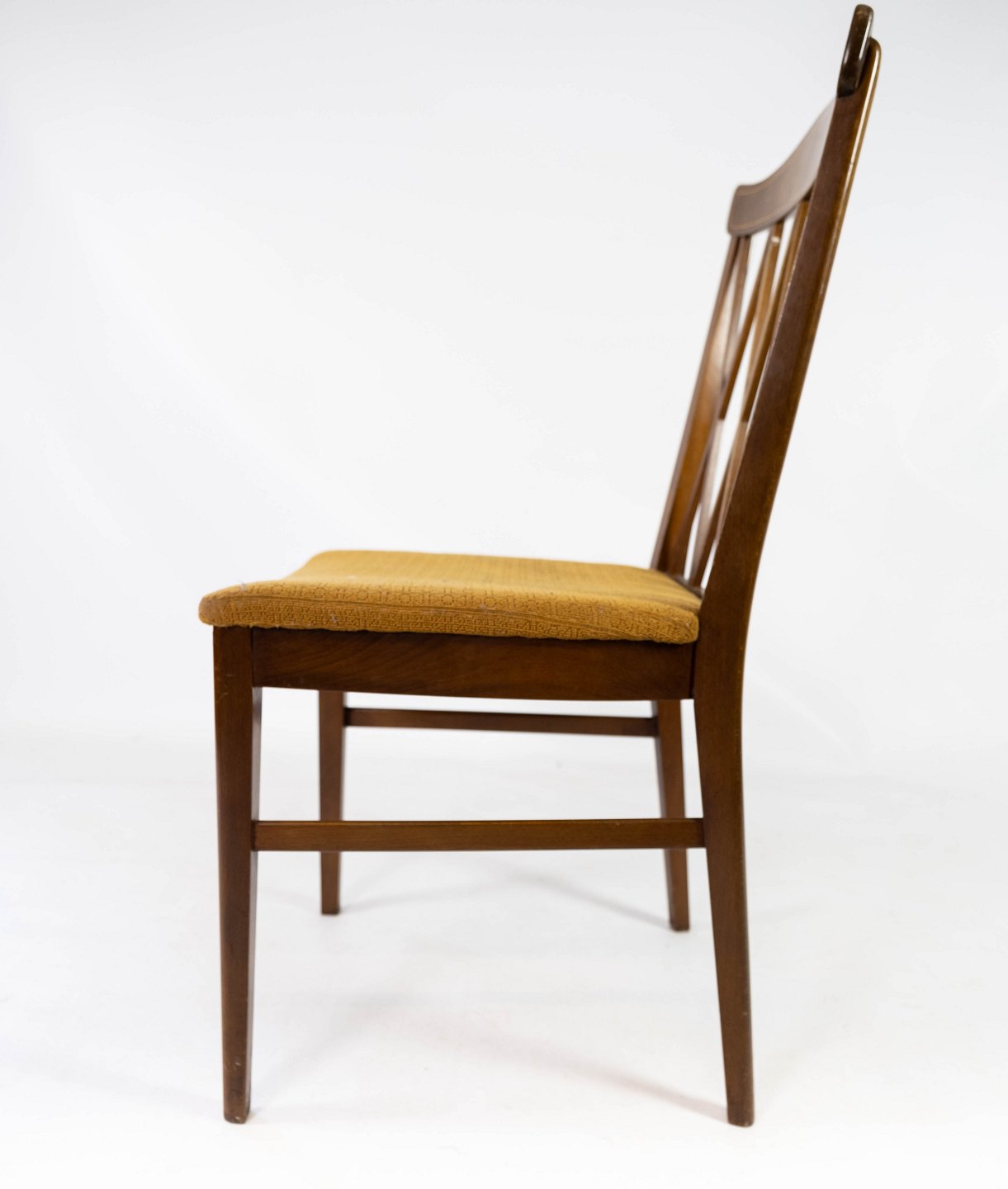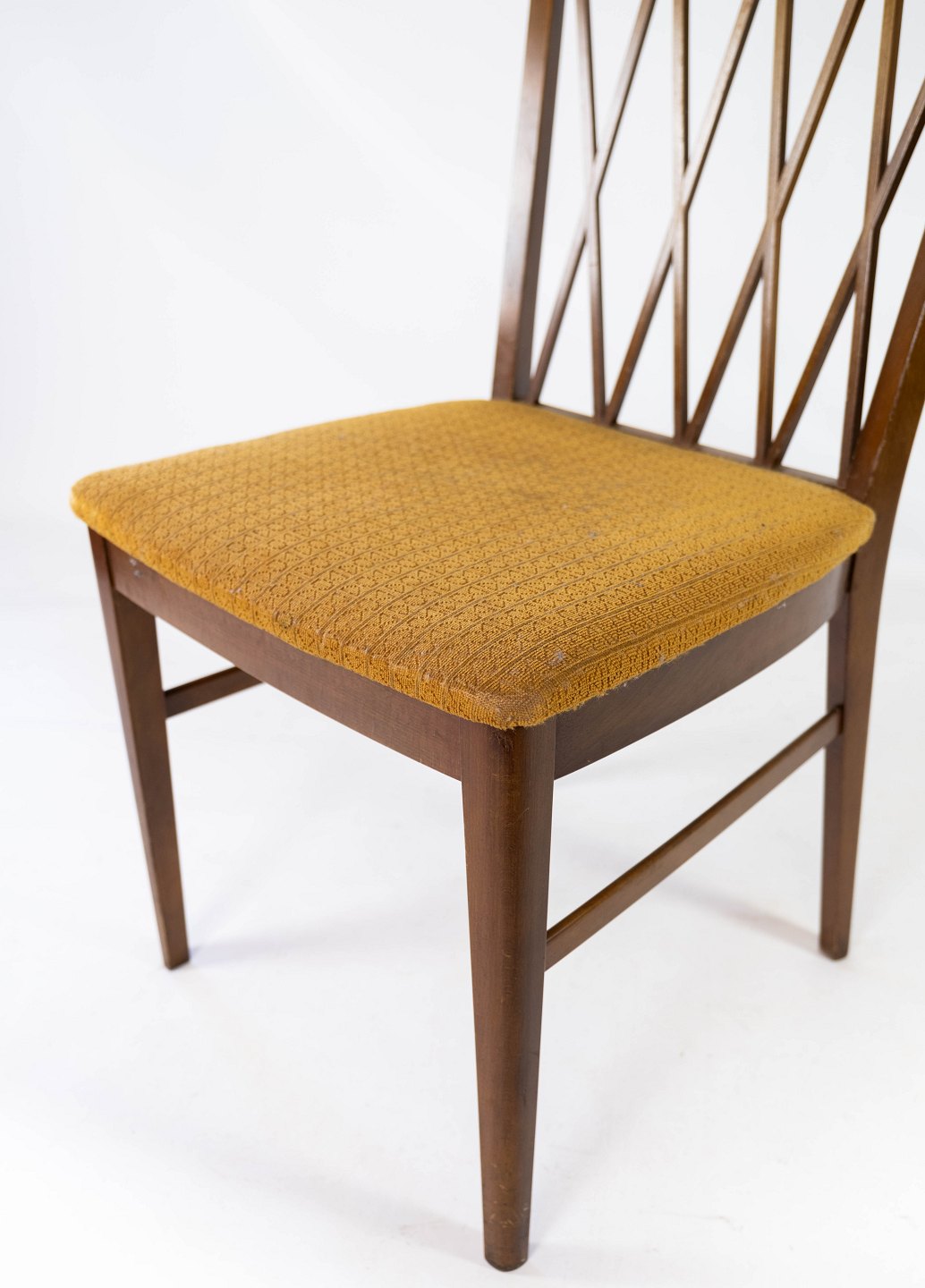 SolgtSæt af seks spisestuestole af nøddetræ og polstret med mørkt stof fra 1940erne. Stolene er i flot brugt stand.