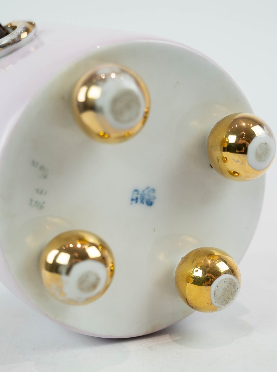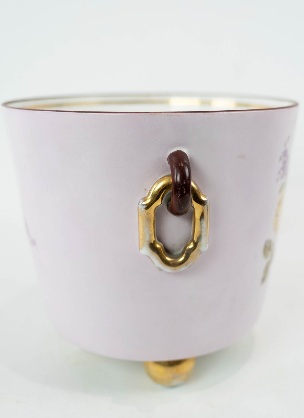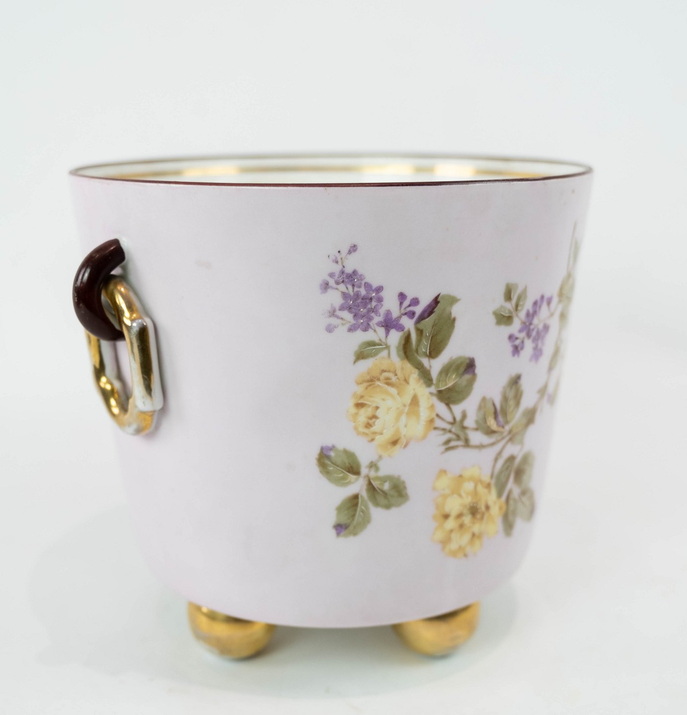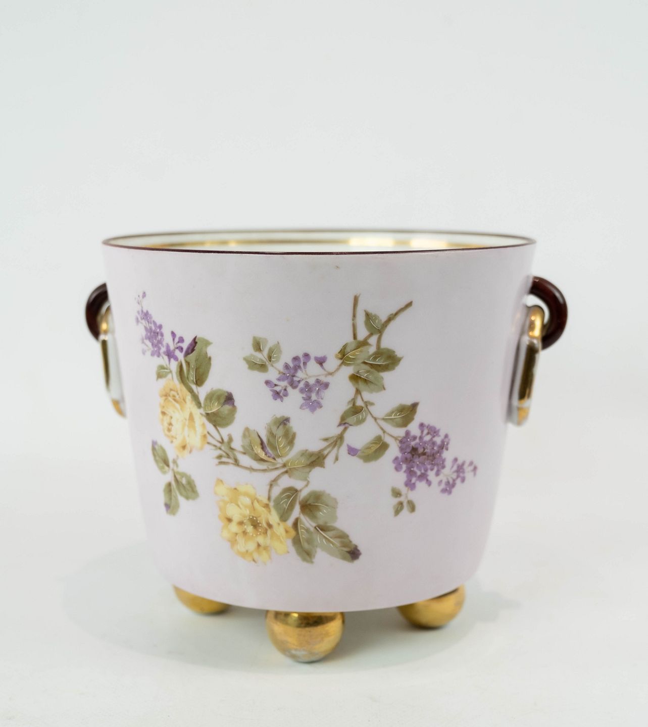 Urtepotteskjuler i lyse farver dekoreret med blomster, i flot brugt stand fra 1870erne.