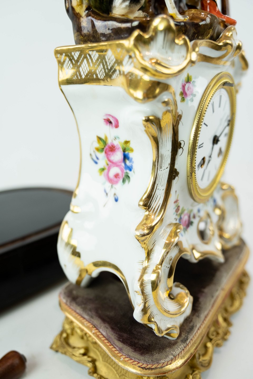 French table clock with glass dome and decorated with figure of porcelain from 1860. The clock is in great vintage condition.
