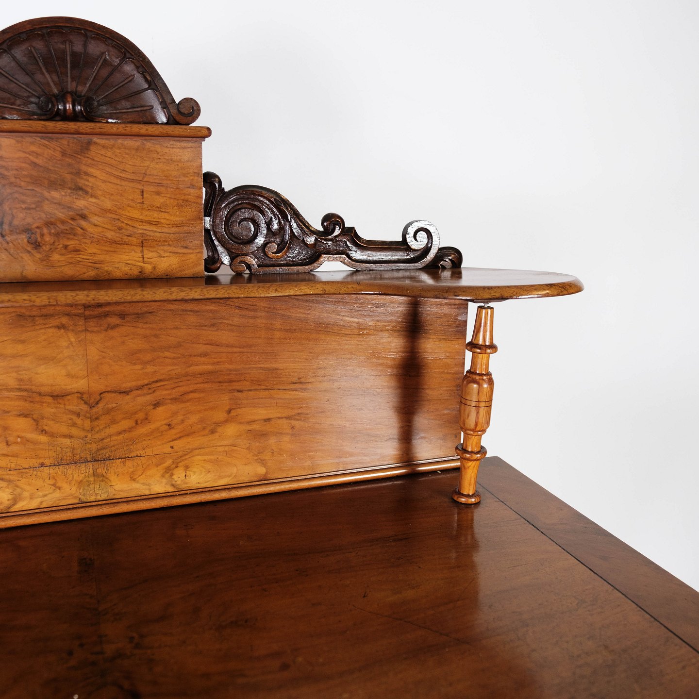 SoldDressing table/desk of walnut and decorated with carvings, in great antique condition from the 1880s.
