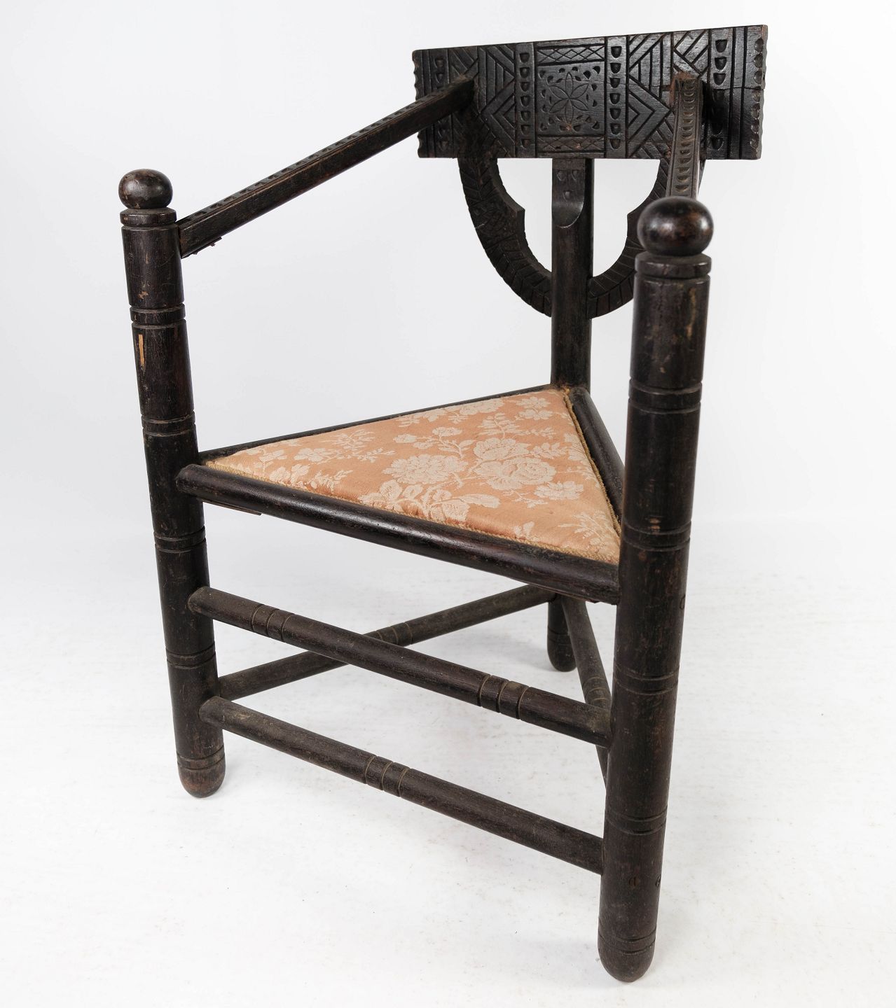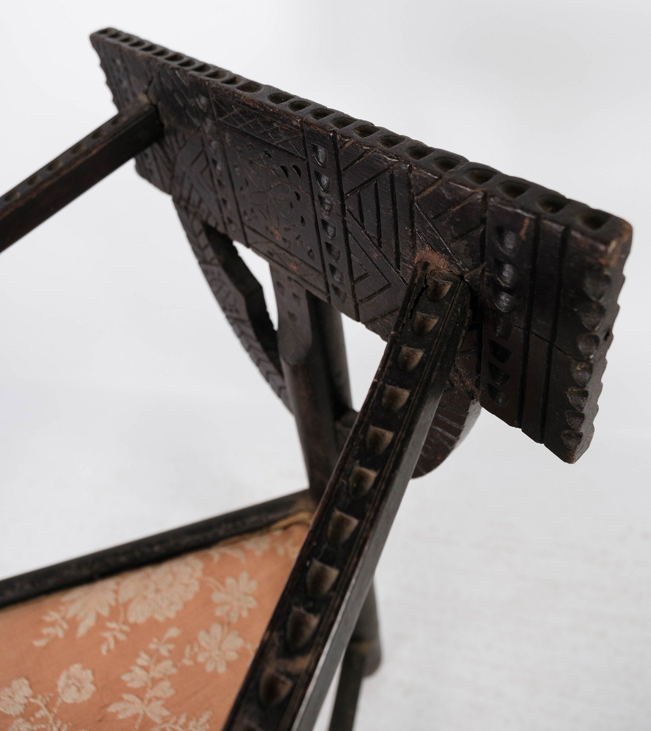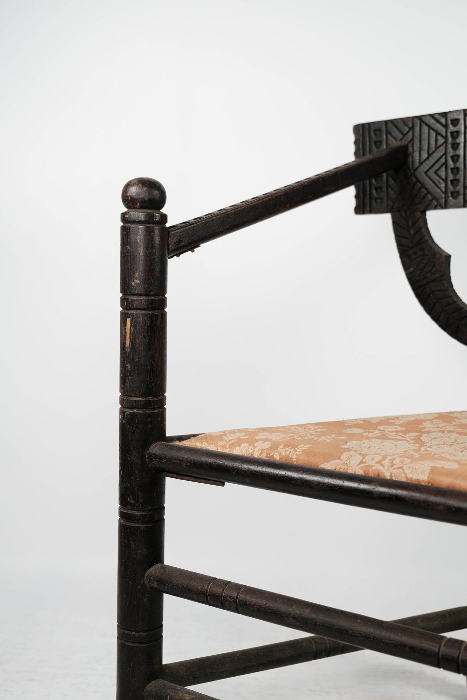Armstol af mørkt træ med udskæringer og polstret med lyst stof, i flot antik stand fra 1880.