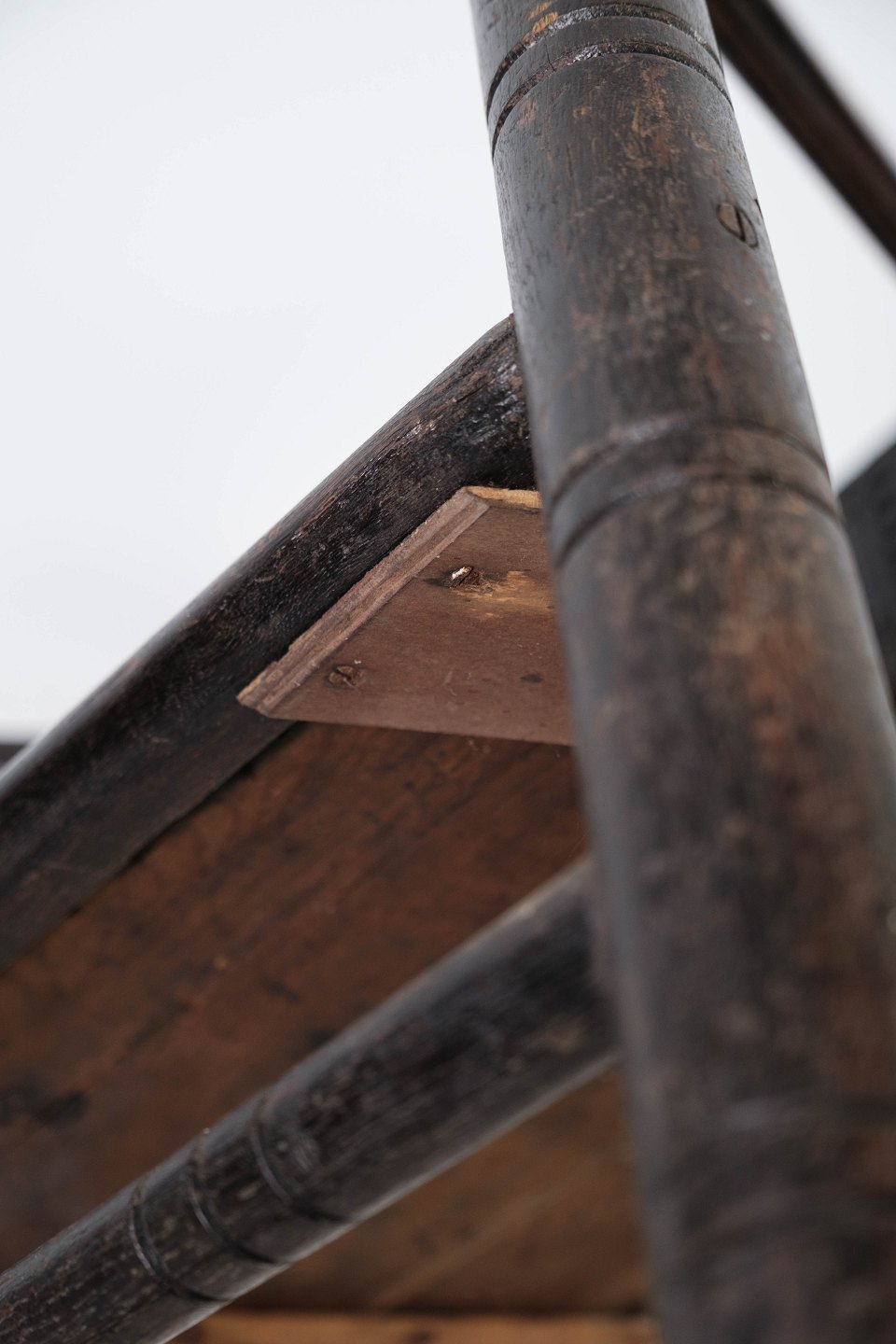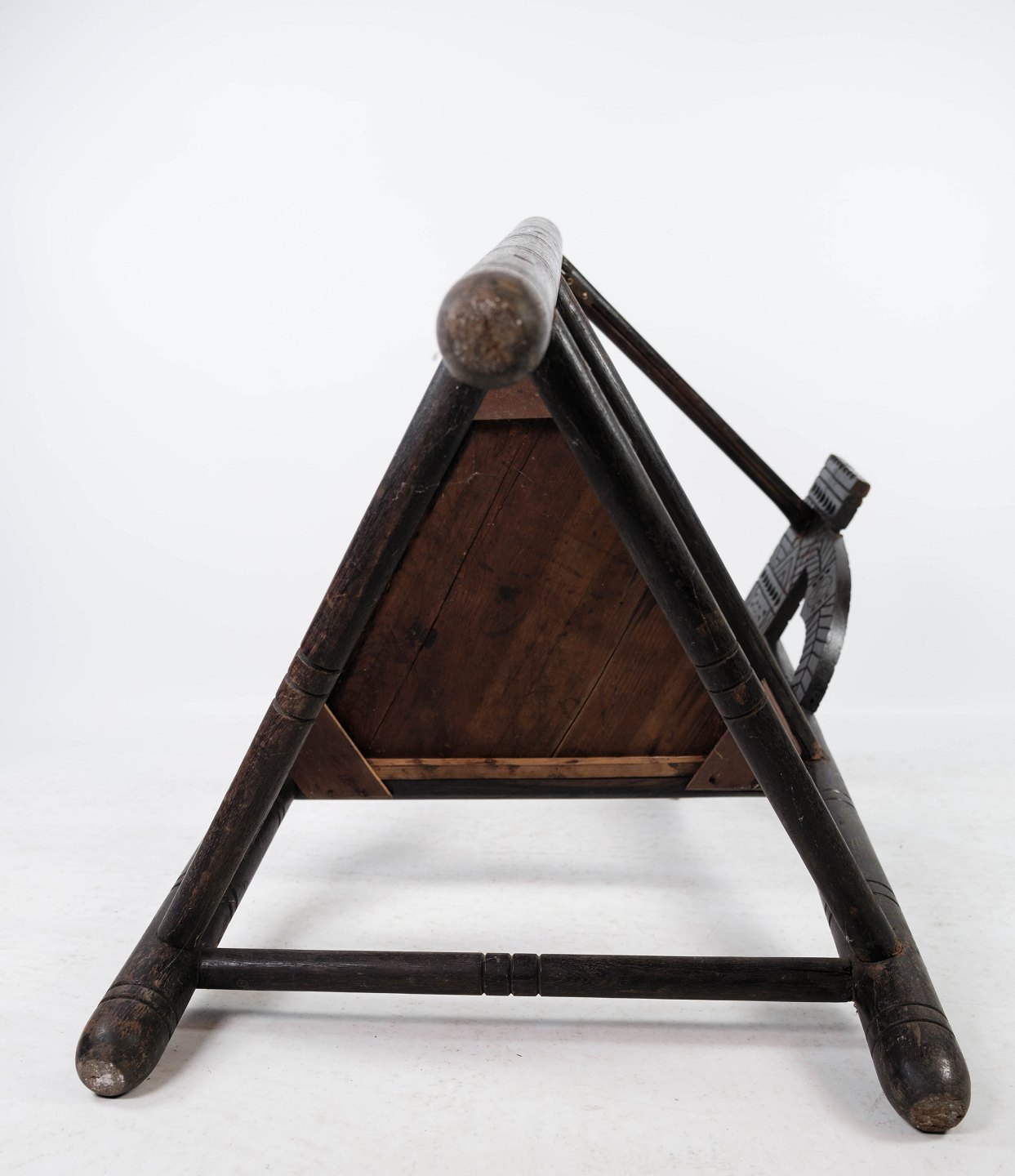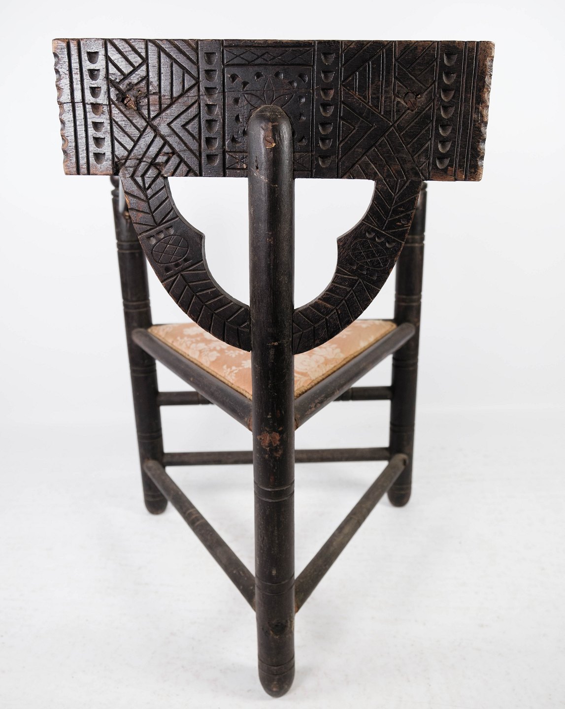 Armstol af mørkt træ med udskæringer og polstret med lyst stof, i flot antik stand fra 1880.