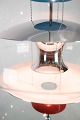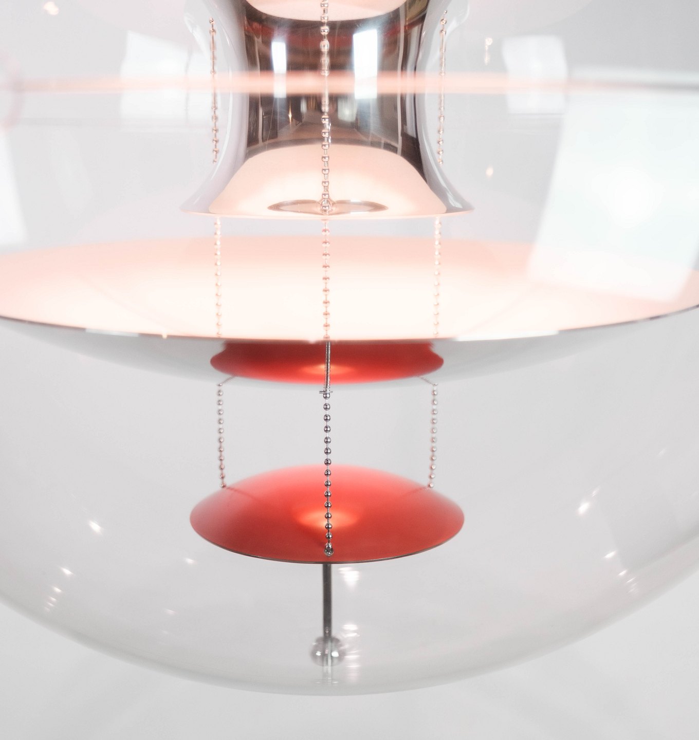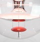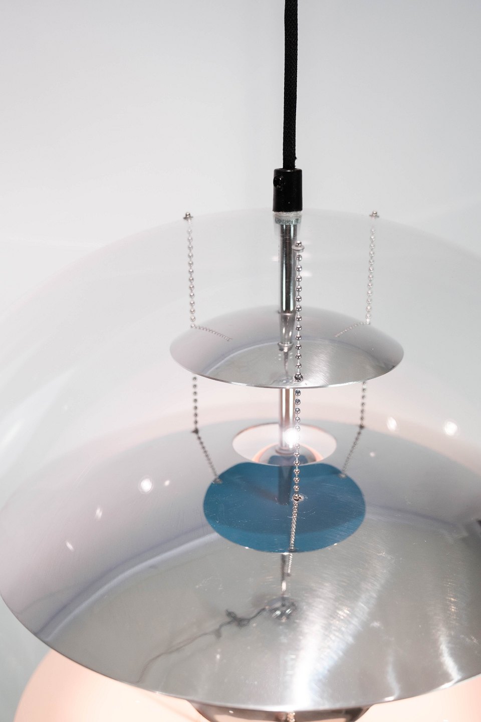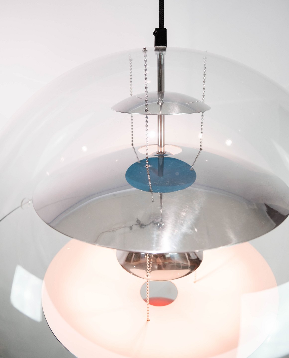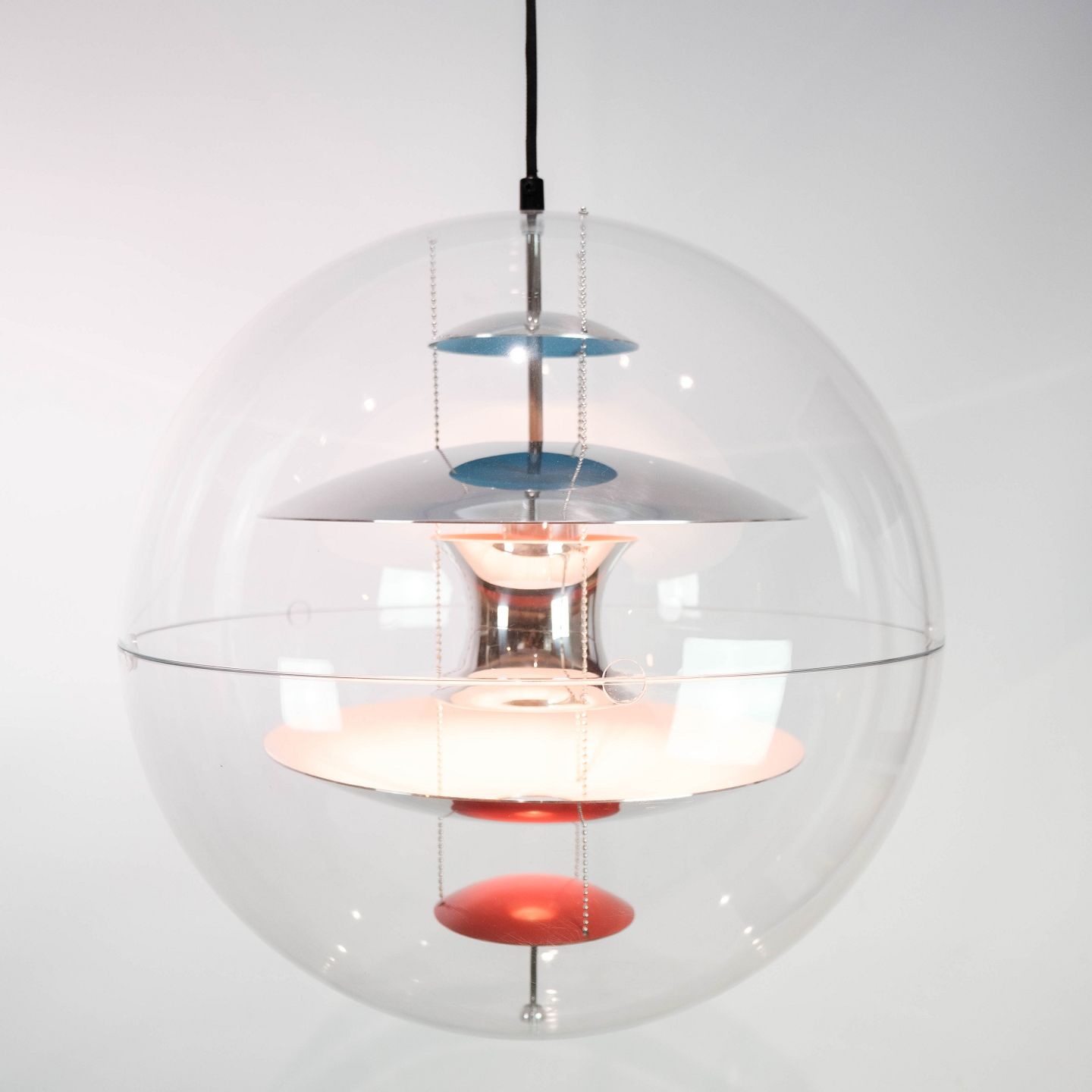 Globe, 50, designed by Verner Panton in 1969. The lamp is a transparent acrylic globe with 5 hanging metal reflectors, which is lacquered in White, blue and red. The Verner Panton Globe pendant is super nice and timeless. It fits in well with many of the home's run, and can be placed for a cozy and atmospheric lighting. The light source is E14 MAX 60 Watt in Ø40 and the light source is E27 MAX 75 Watt in Ø50