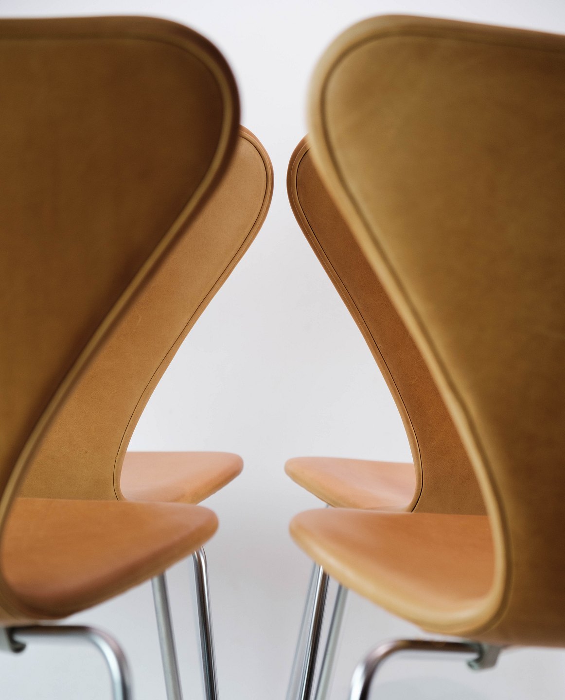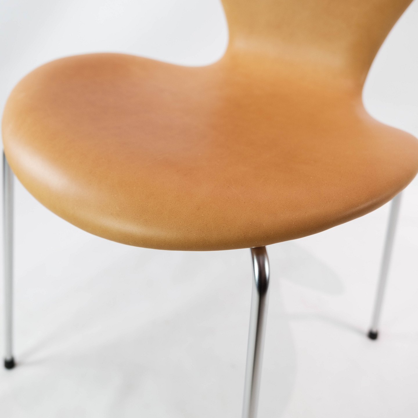 Dette sæt af fire Syver stole, også kendt som Model 3107, er et eksempel på dansk design af Arne Jacobsen og fremstillet hos Fritz Hansen. Stolene er polstret i patineret cognac læder, hvilket tilføjer en varm og indbydende atmosfære til ethvert rum.