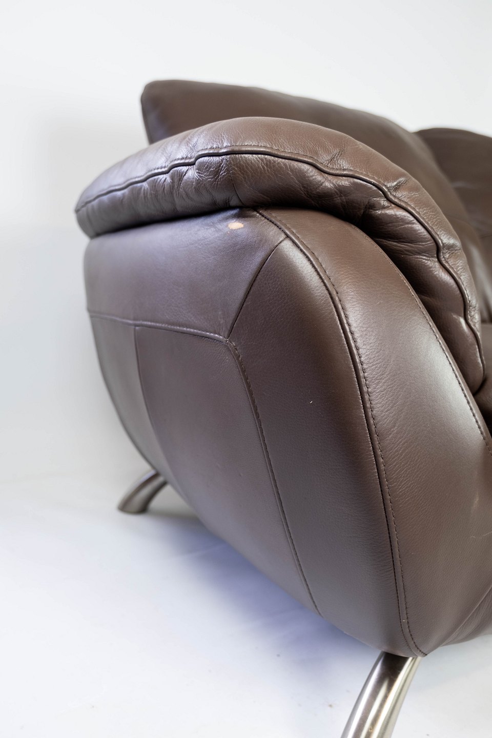 Det brune læder giver sofaen et varmt og indbydende udseende, samtidig med at det er slidstærkt og let at vedligeholde. Metalstellet tilføjer en moderne og industrielt-inspireret touch, der giver sofaen et sofistikeret udseende.