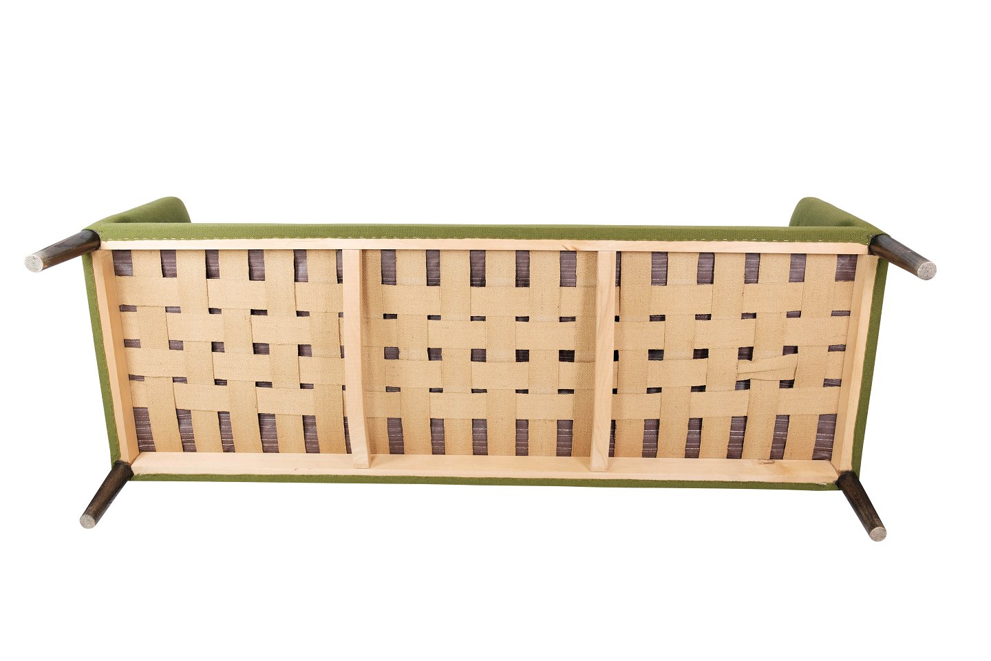 SoldThree seater sofa, Model AP 18S, upholstered with green wool fabric and legs of dark wood, designed by Hans J. Wegner from the 1960s.
