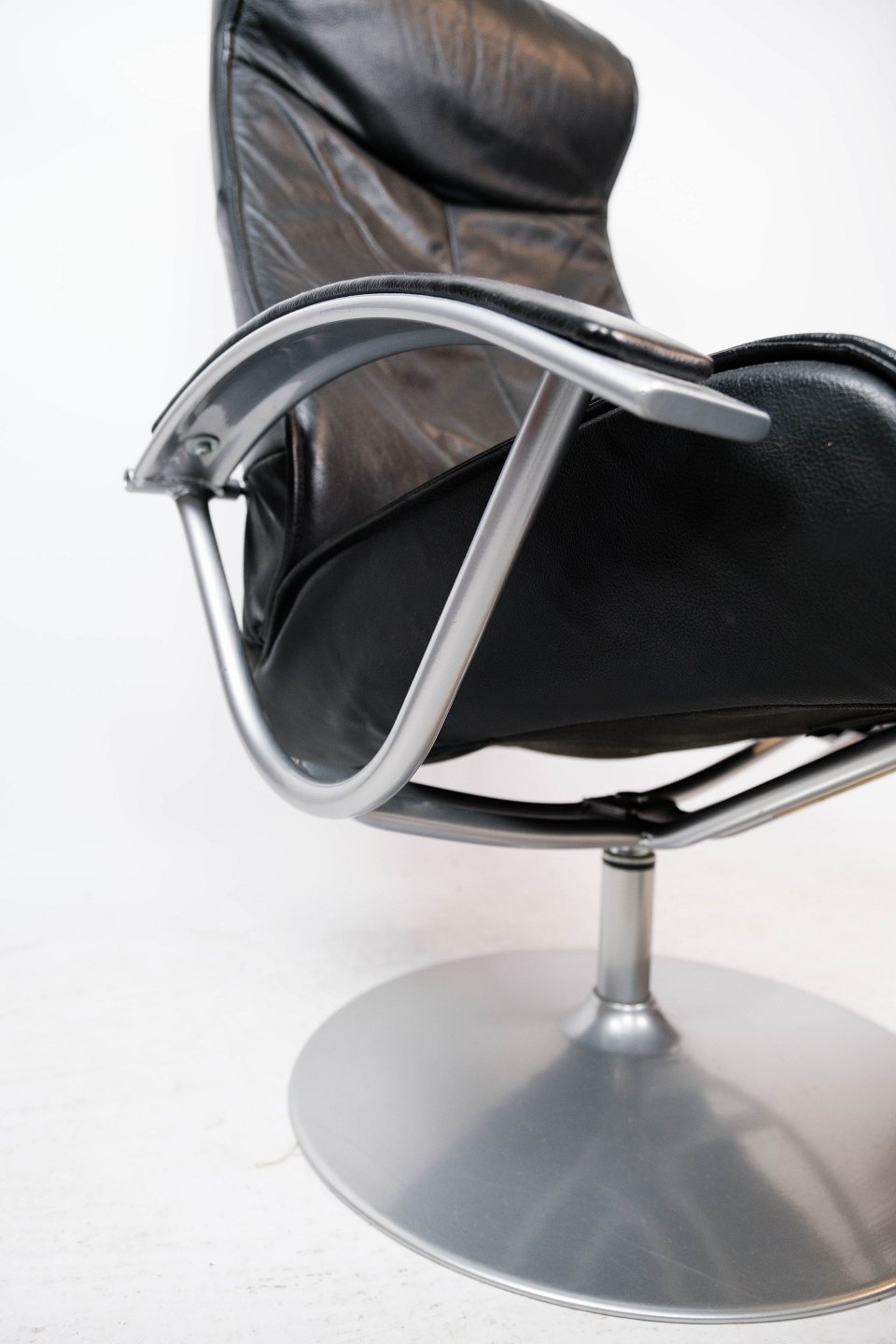 Easy chair with stool upholstered with black leather and frame of metal, of Danish design from the 1970s.