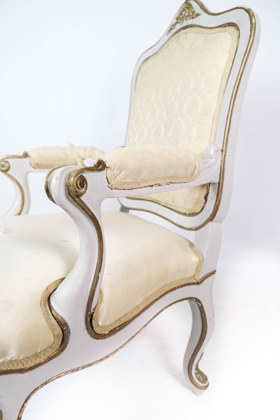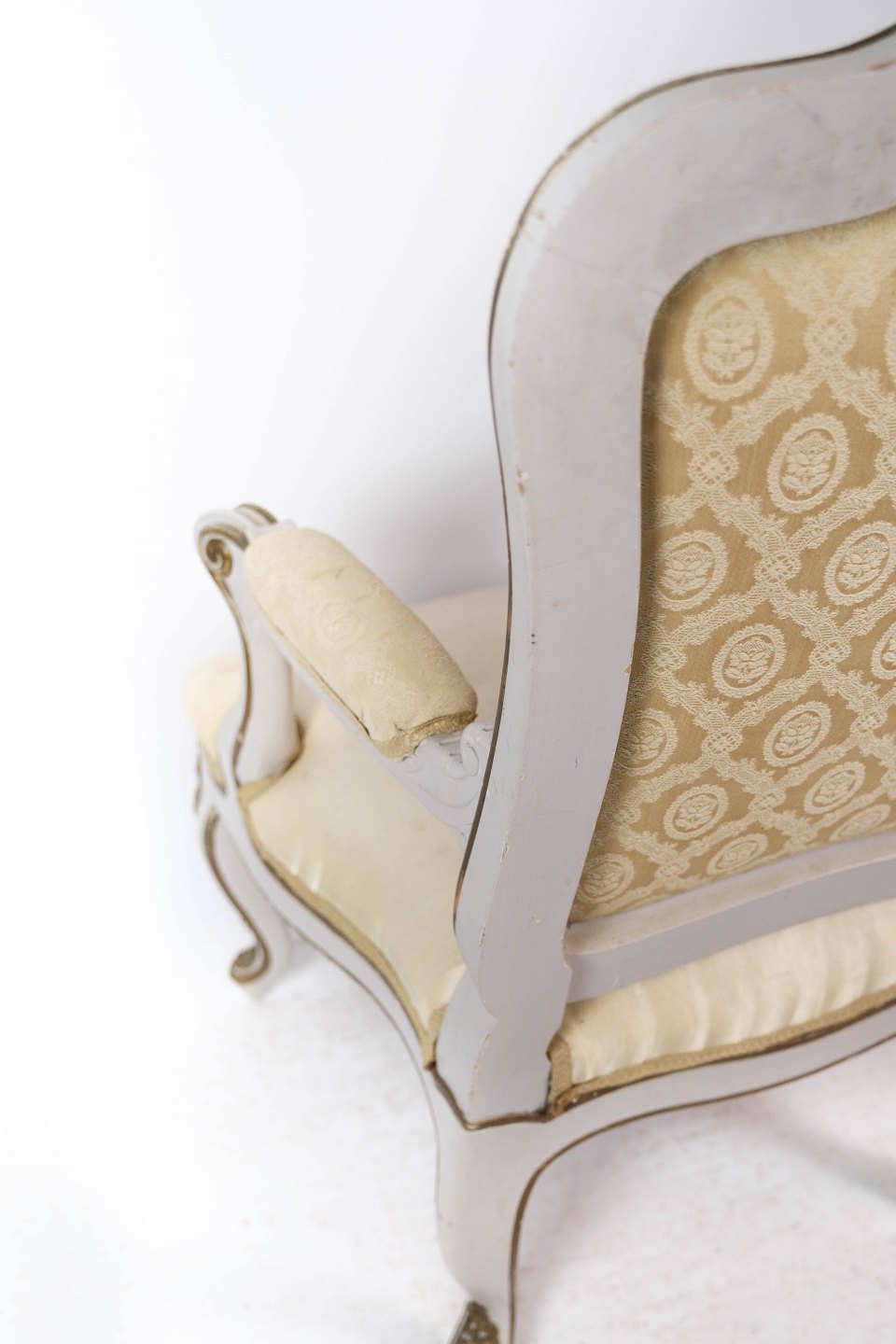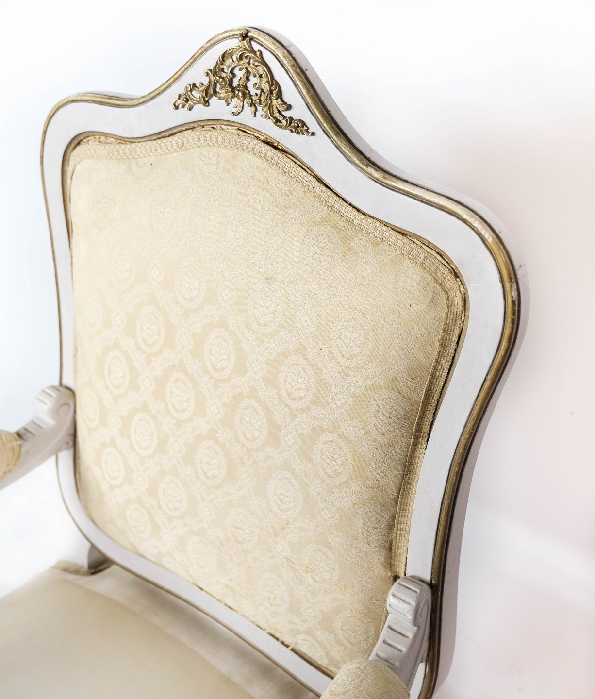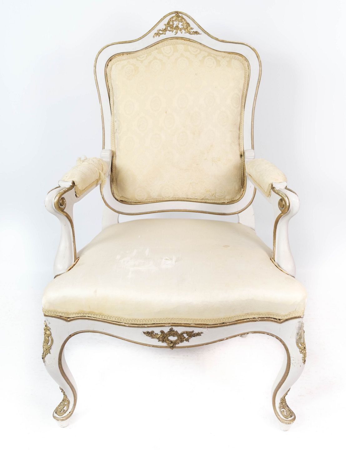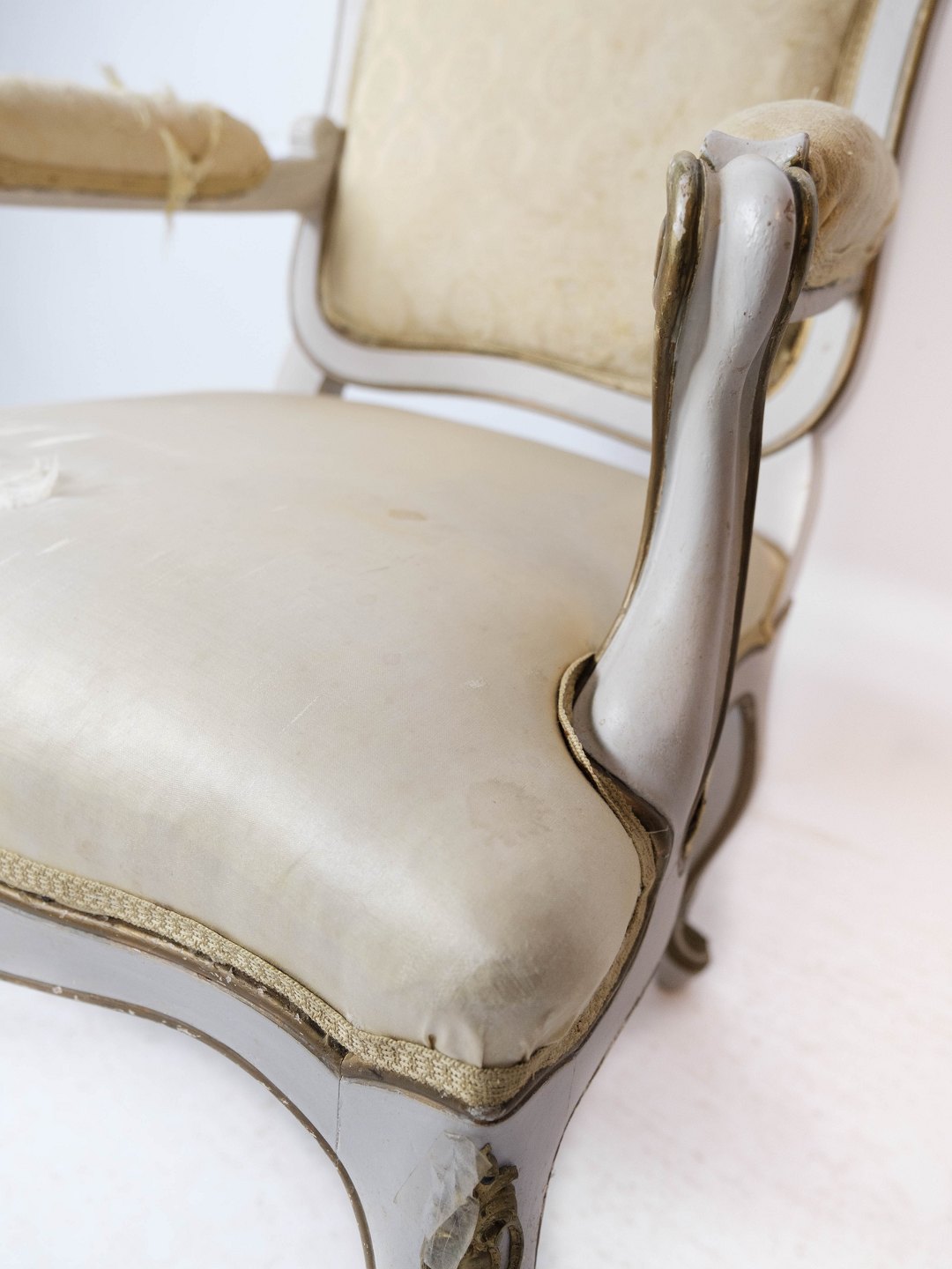 Armchair of white painted wood and upholstered with light fabric, in great antique condition from around 1880.