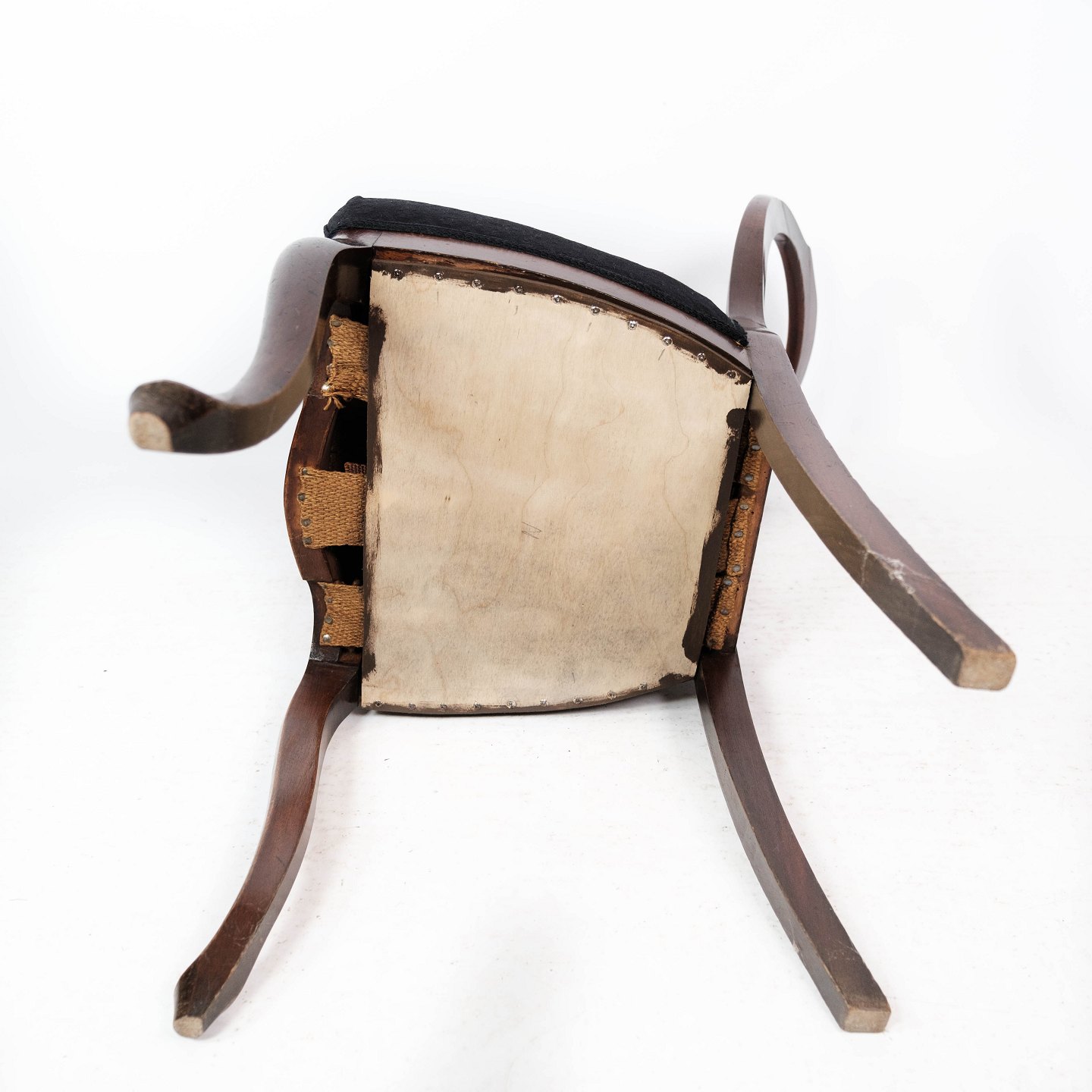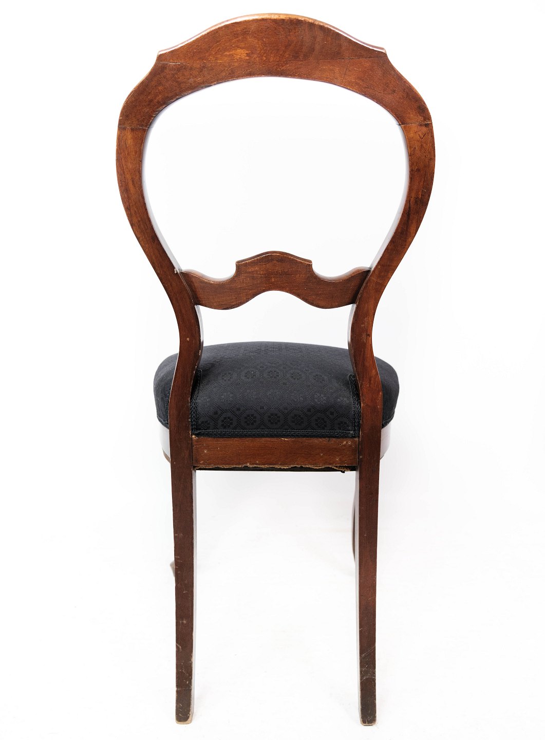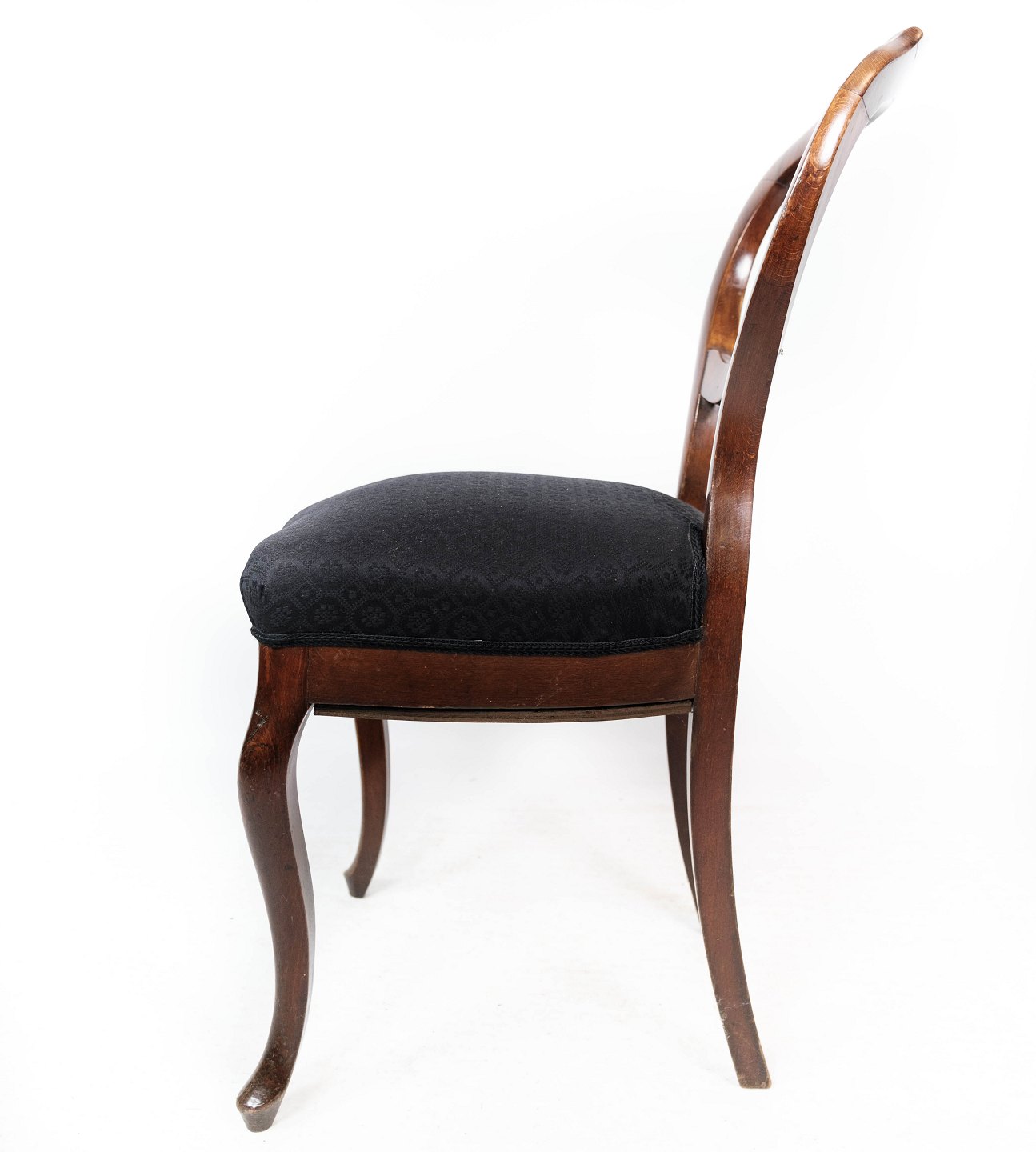SolgtSæt af fire rokoko spisestuestole af mørkt træ og polstret med sort stof fra omkring 1880. Stolene er i flot antik stand.