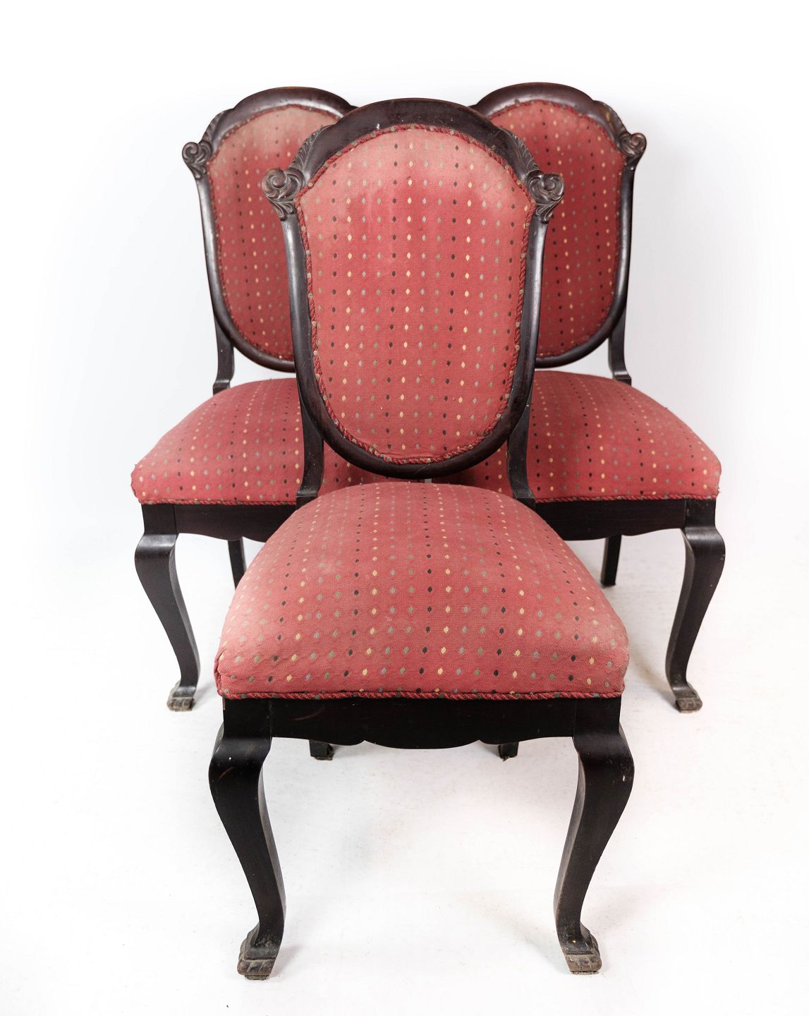Set of three dining room chairs of mahogany and upholstered with red fabric from around 1920. The chairs are in great vintage condition.