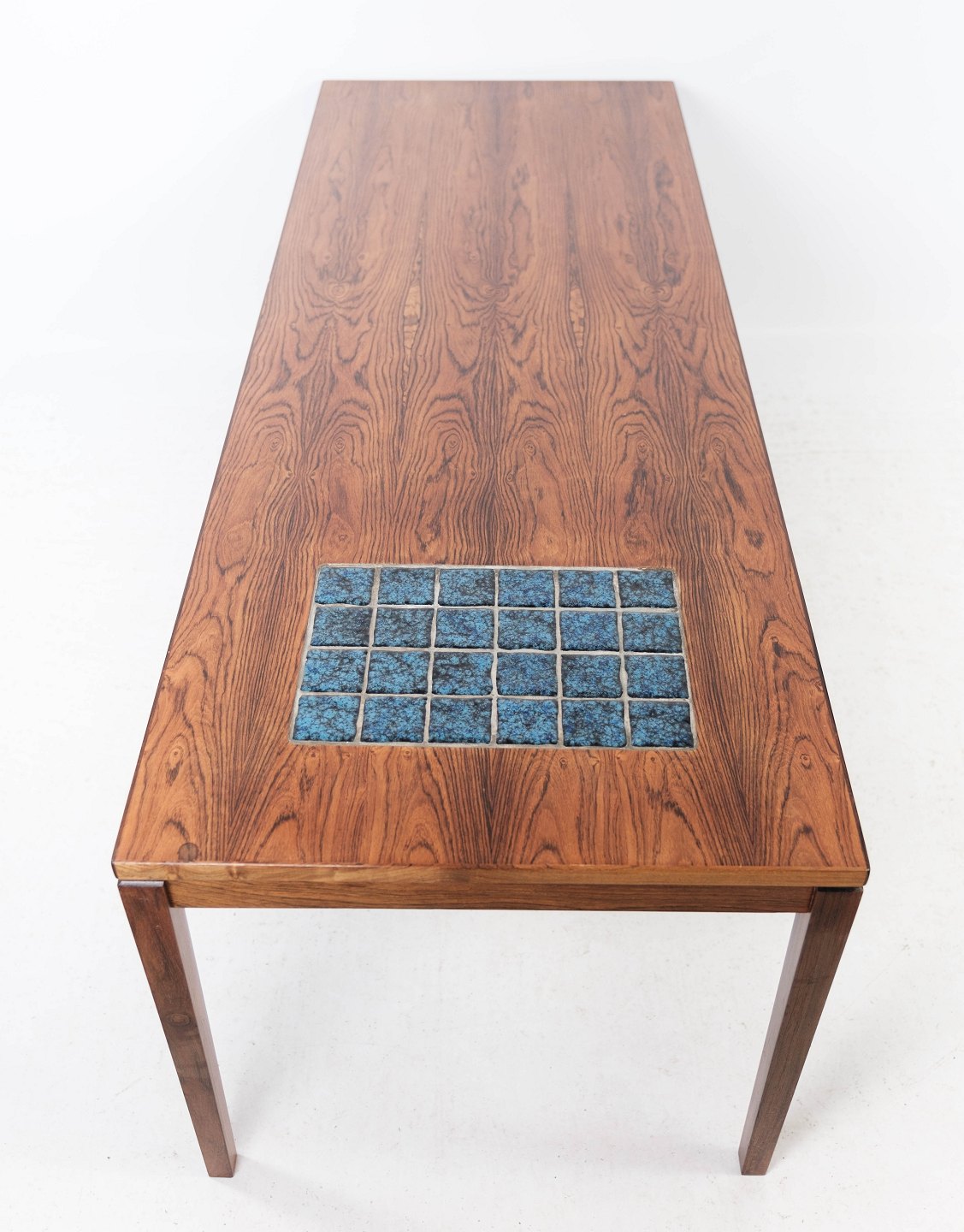 Sofabord i palisander med blå klinker af dansk design fra 1960erne. Bordet er i flot brugt stand.