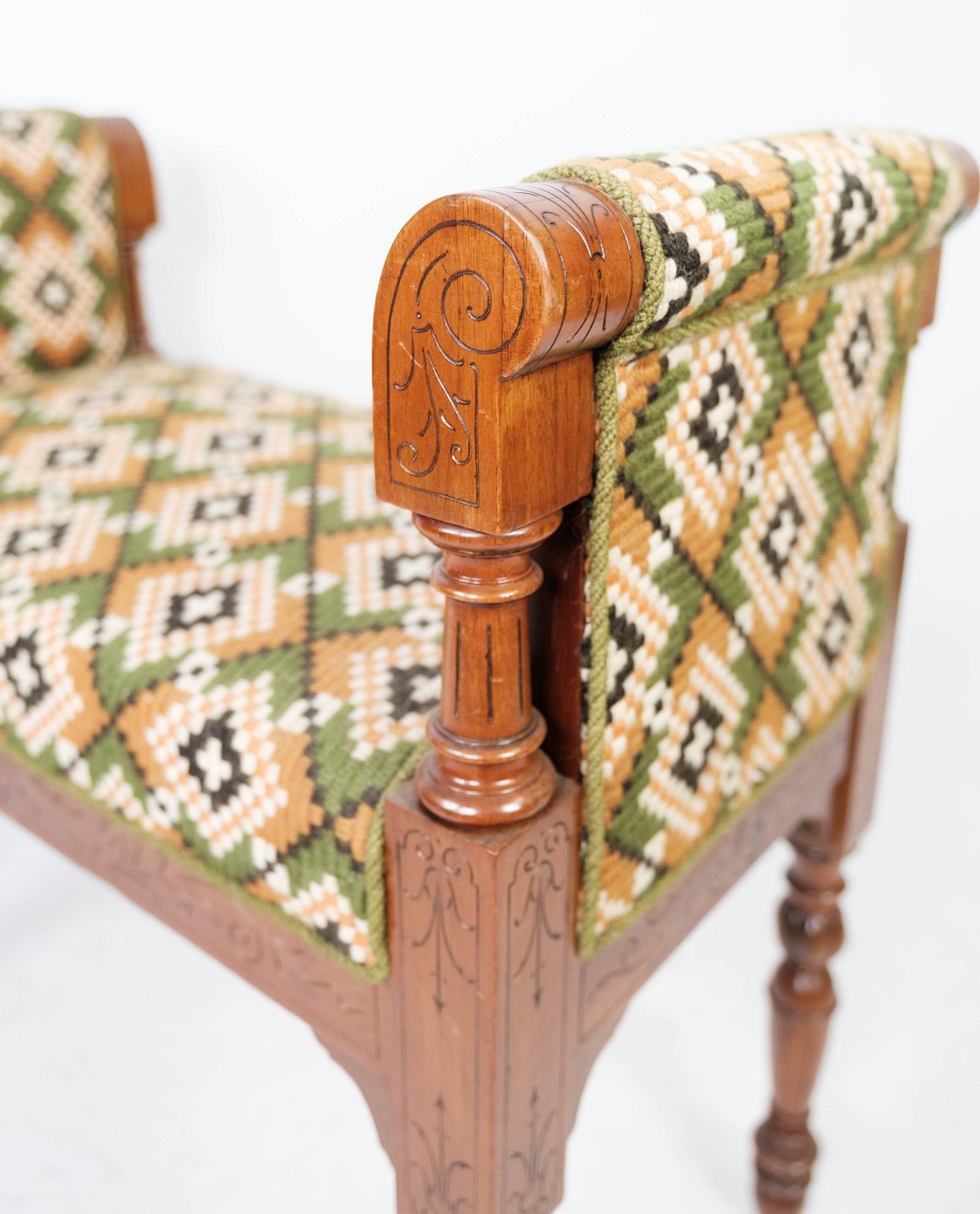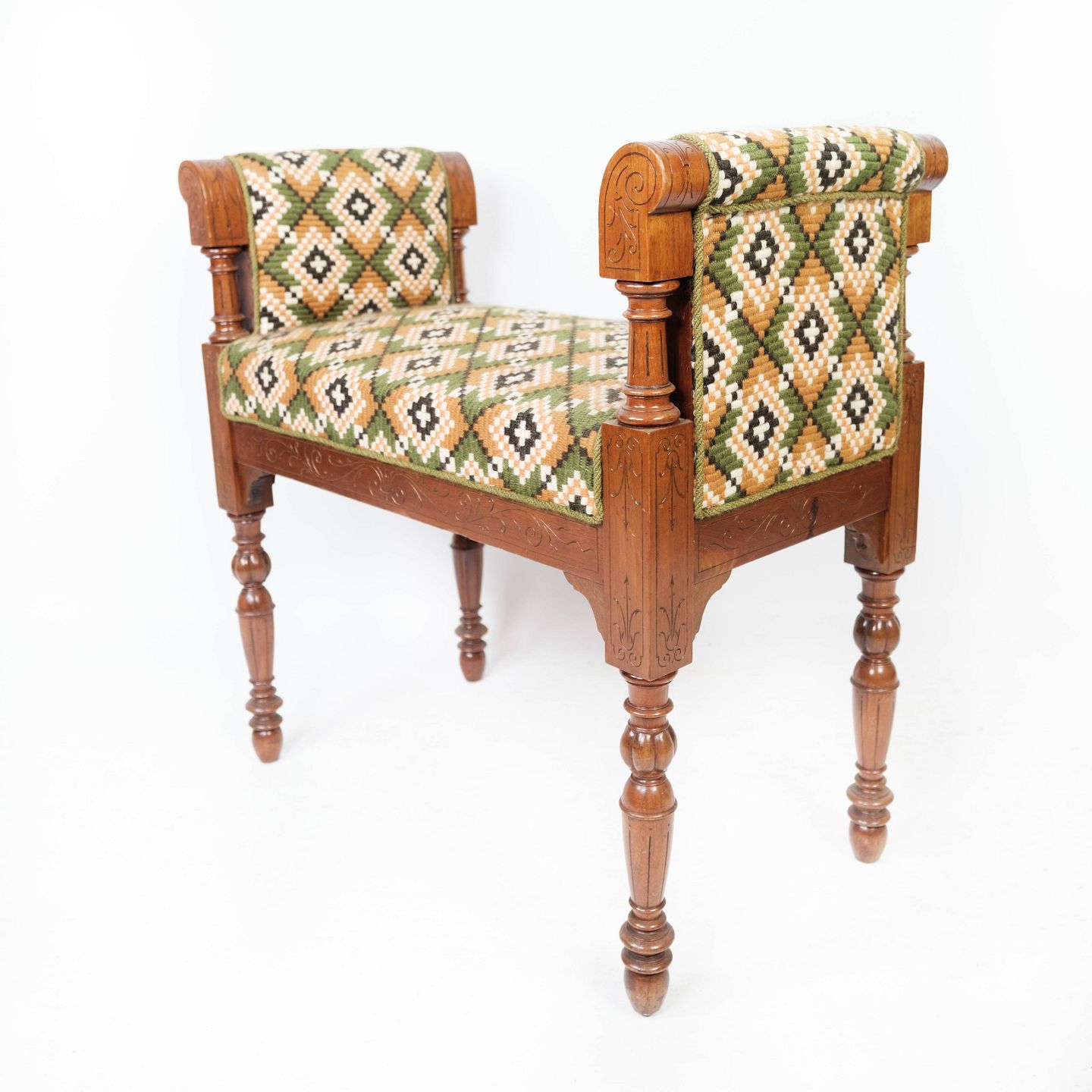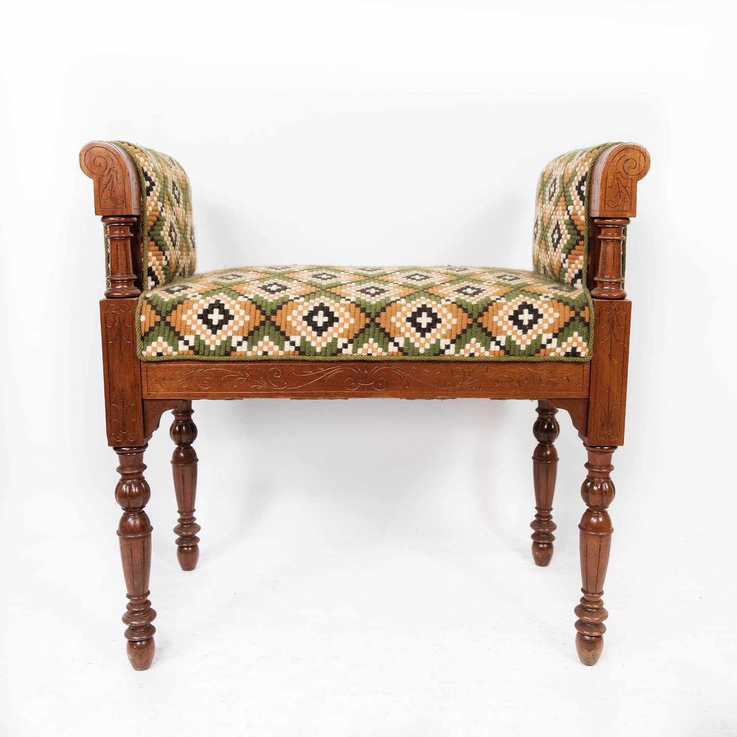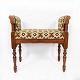 Klaverbænk af valnød og polstret med mønstret stof, fra 1910erne. Møblet er i flot antik stand.