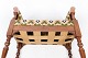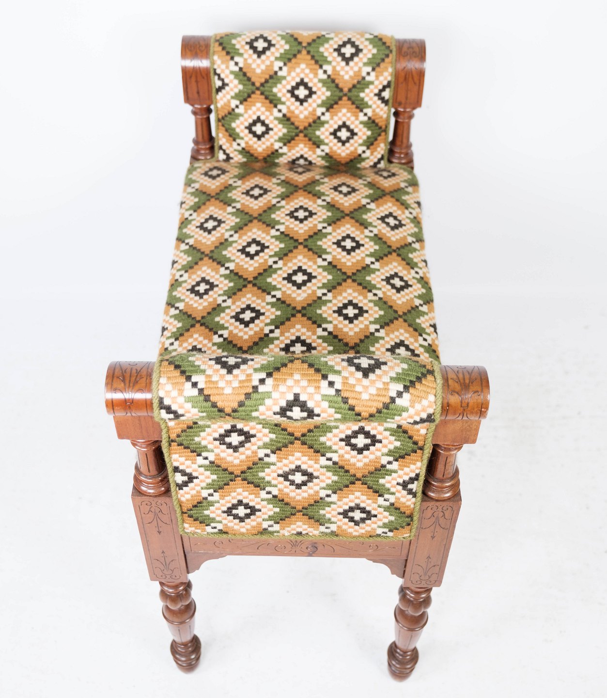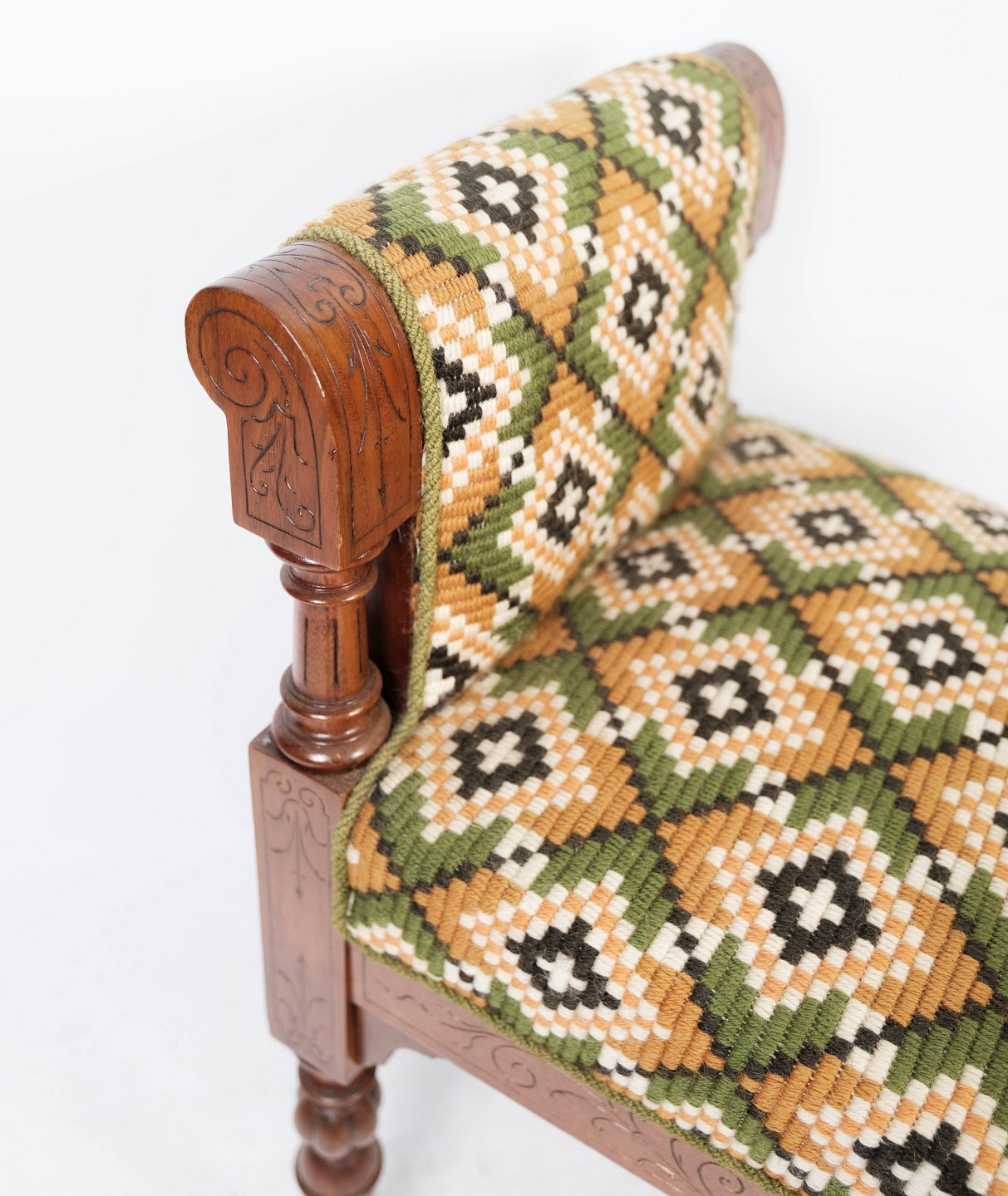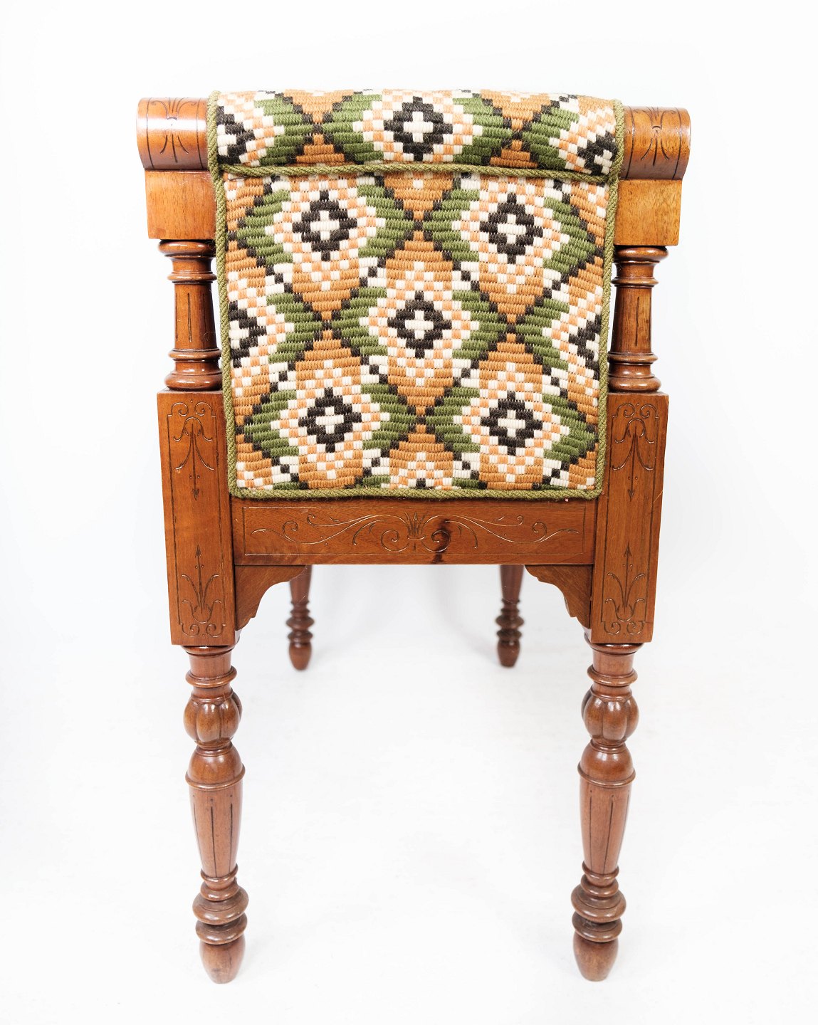 Klaverbænk af valnød og polstret med mønstret stof, fra 1910erne. Møblet er i flot antik stand.
