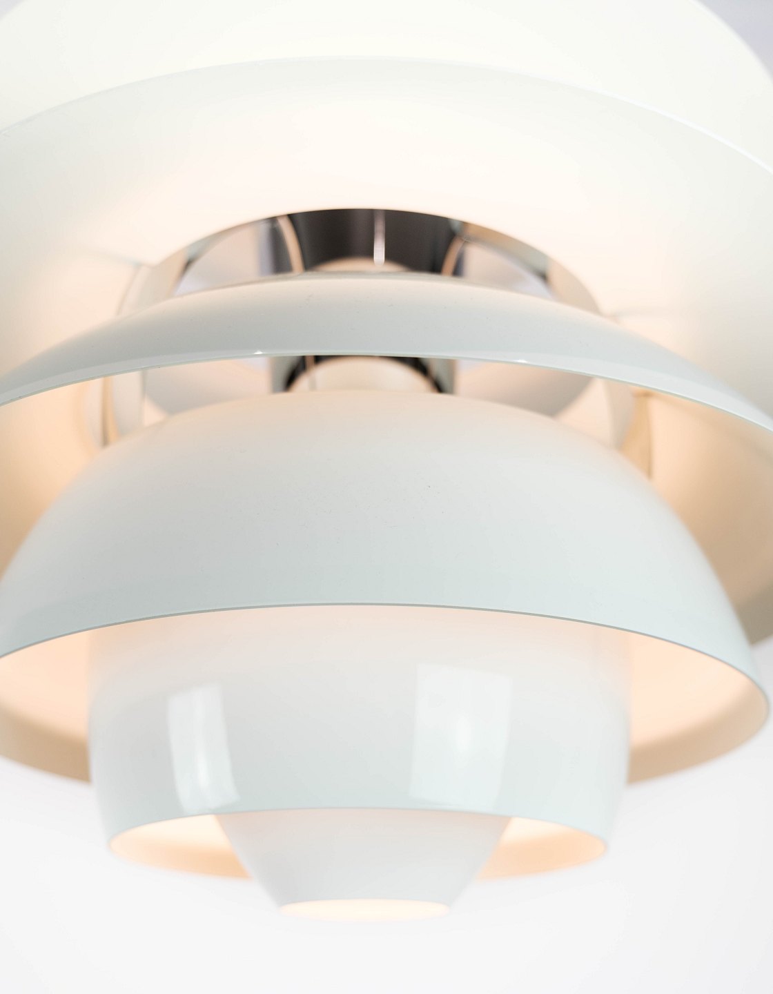 PH kuglelamel også kaldet Snowball i højglans hvid designet af Poul Henningsen og fremstillet af Louis Poulsen.