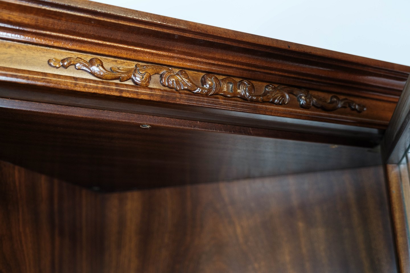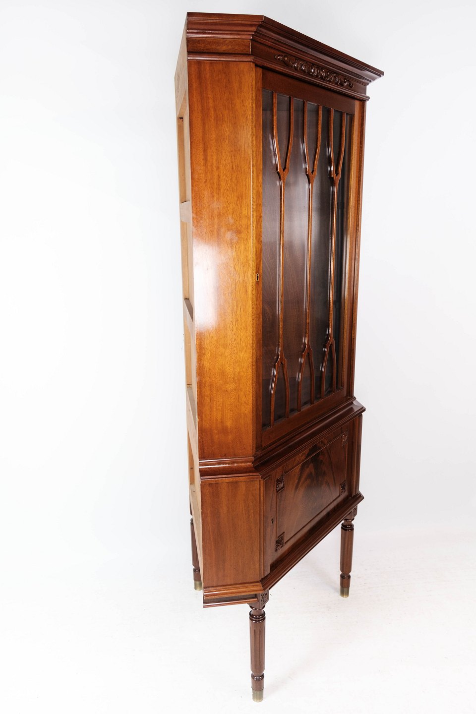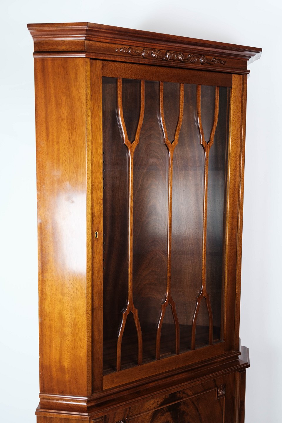 Hepplewhite hjørneskab af mahogni og glas med sprosser, i flot antik stand fra 1920erne.