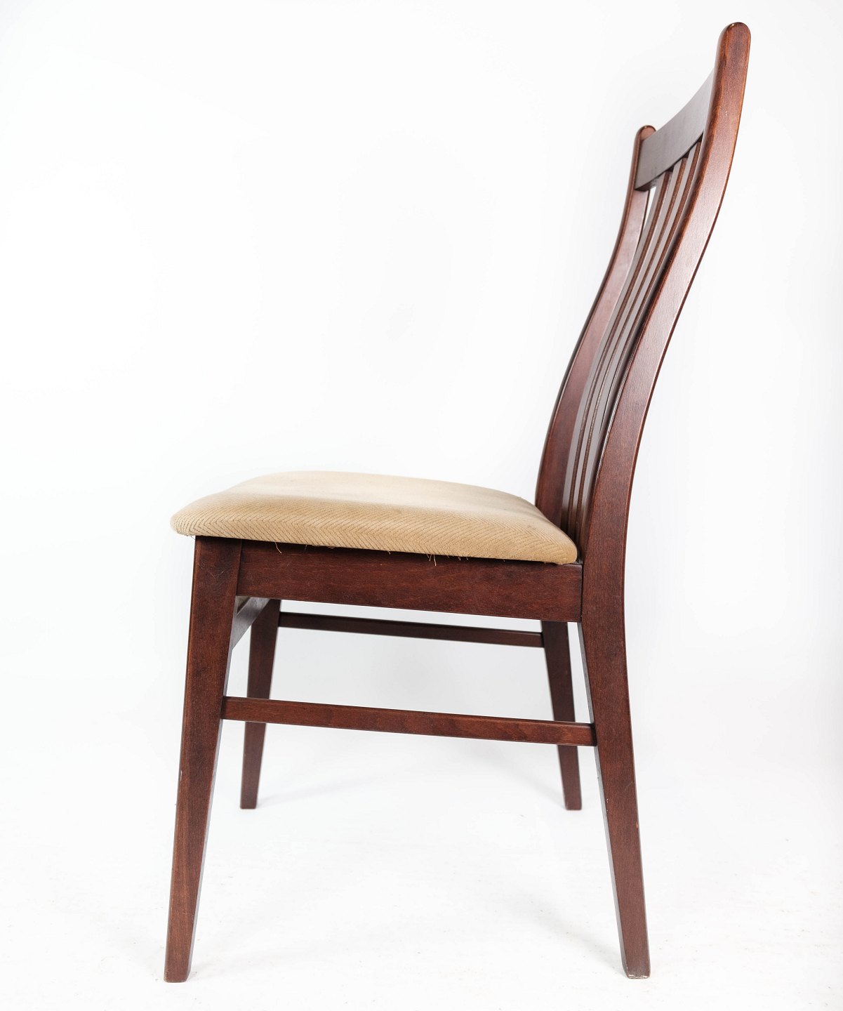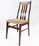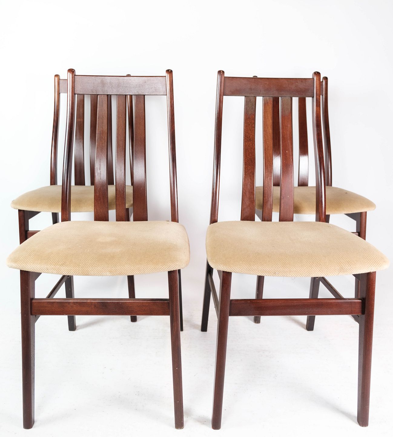 Sæt af fire spisestuestole i mahogni og polstret med lyst stof, af dansk design fremstillet af Farstrup møbler i 1960erne. Stolene er i flot brugt stand.