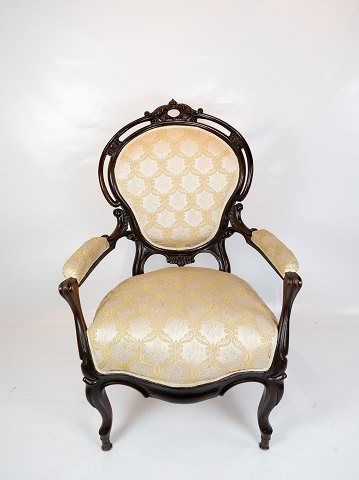 Late Empire armchair of mahogany and upholstered with light fabric, in grat antique condition from the 1860s.