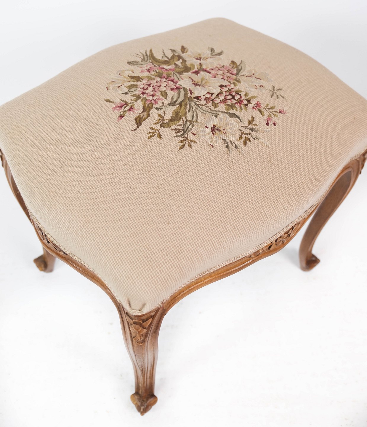 SolgtEt sæt skamler af lyst træ og polstret med lyst stof, i flot antik stand fra 1930erne.