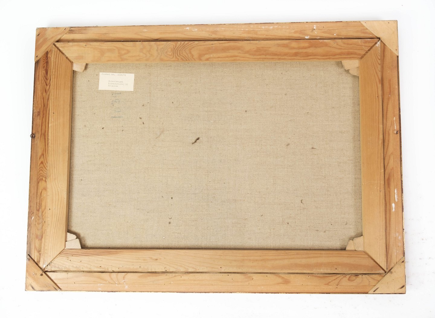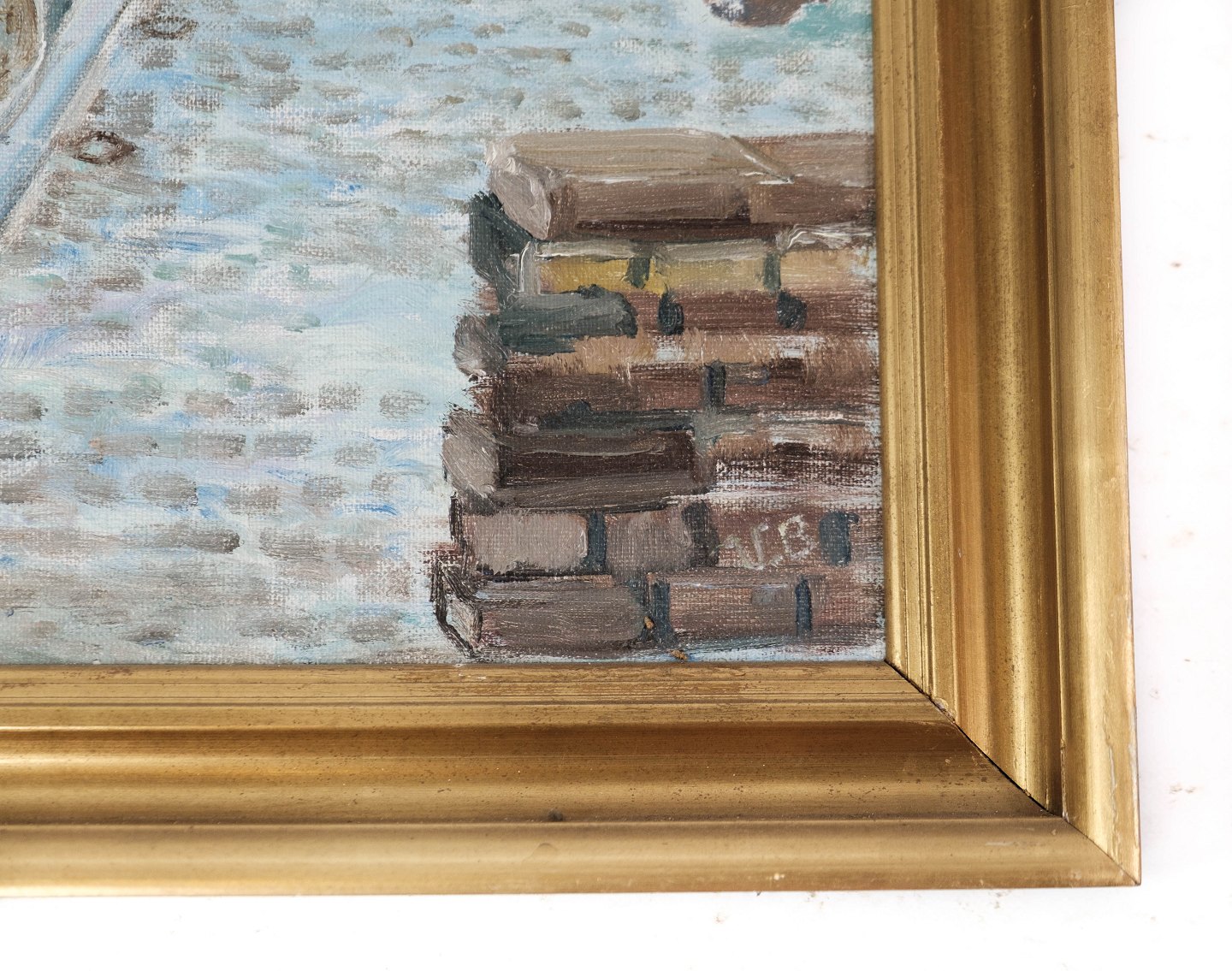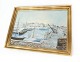 Maleri på lærred med havne motiv og forgyldt ramme, signeret V.B. fra 1940erne.
