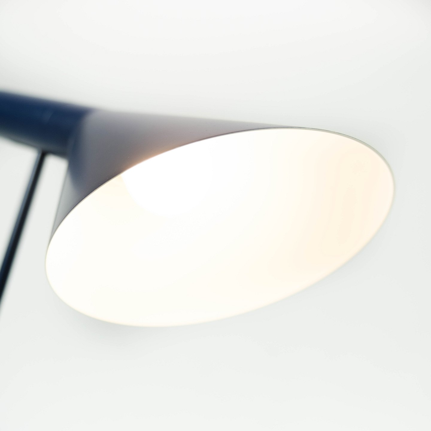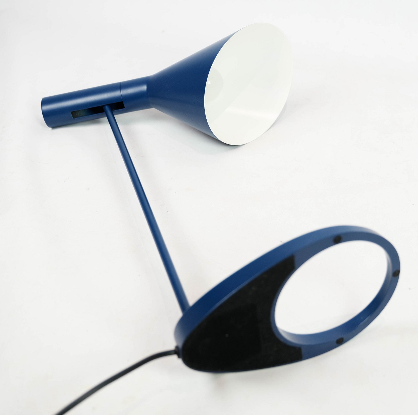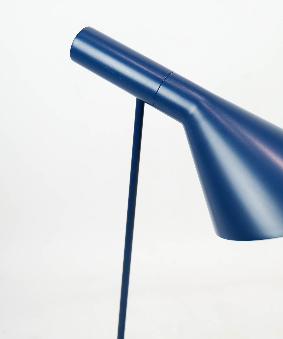 SolgtMørkeblå bordlampe designet af Arne Jacobsen og fremstillet af Louis Poulsen. Lampen blev originalt tegnet til SAS Royal Hotel i København i 1957 til hotellets designkoncept. Lampen her er den originale af stål med vipbart hoved, som udsender et direkte og retningsbestemt lys. Den er lakeret hvid på indersiden, samt blå udvendig. Lampen er i flot brugt stand.