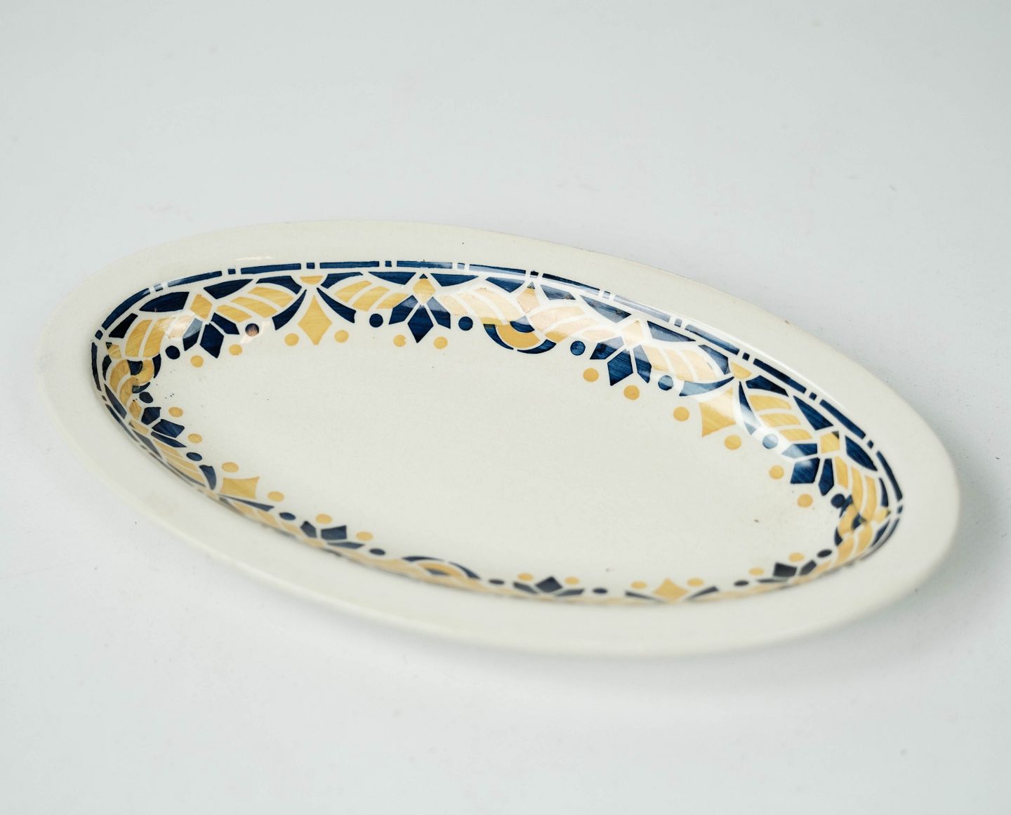 Ovalt fad dekoreret med gule og blå farver fra 1960erne. Vi har 2 stk. på lager.