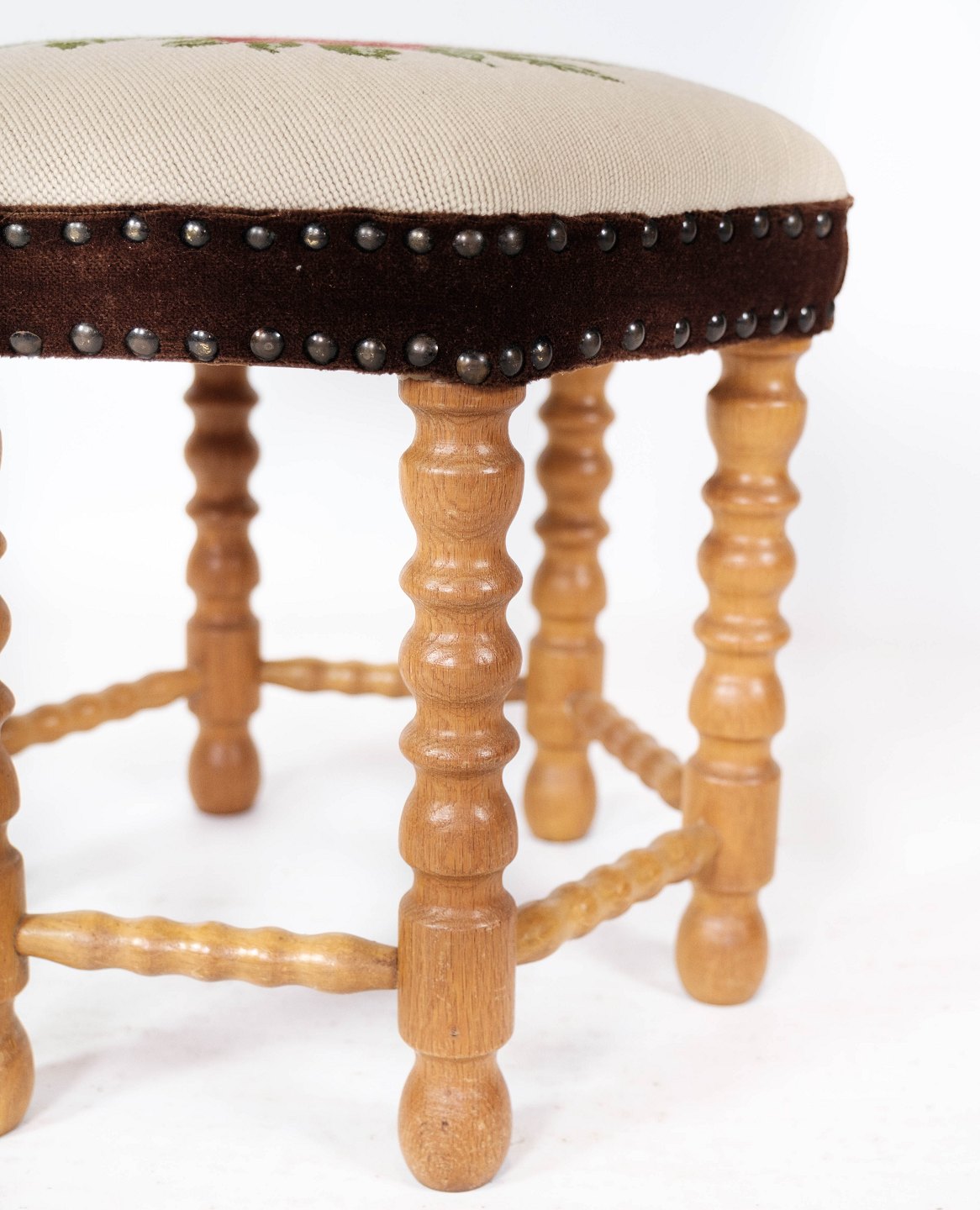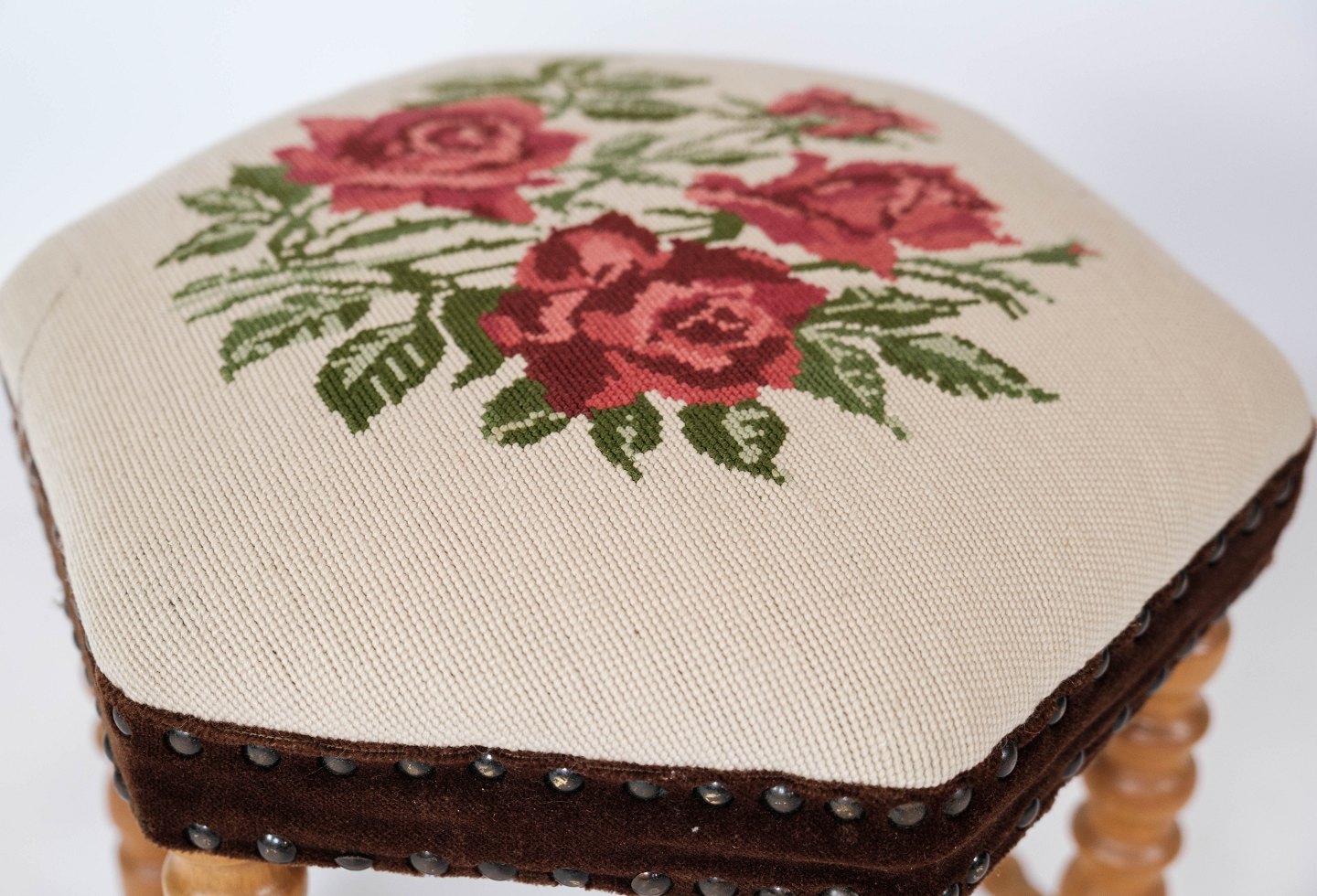 Skammel af lyst træ og polstret med broderet stof fra 1970erne. Skamlen er i flot brugt stand.